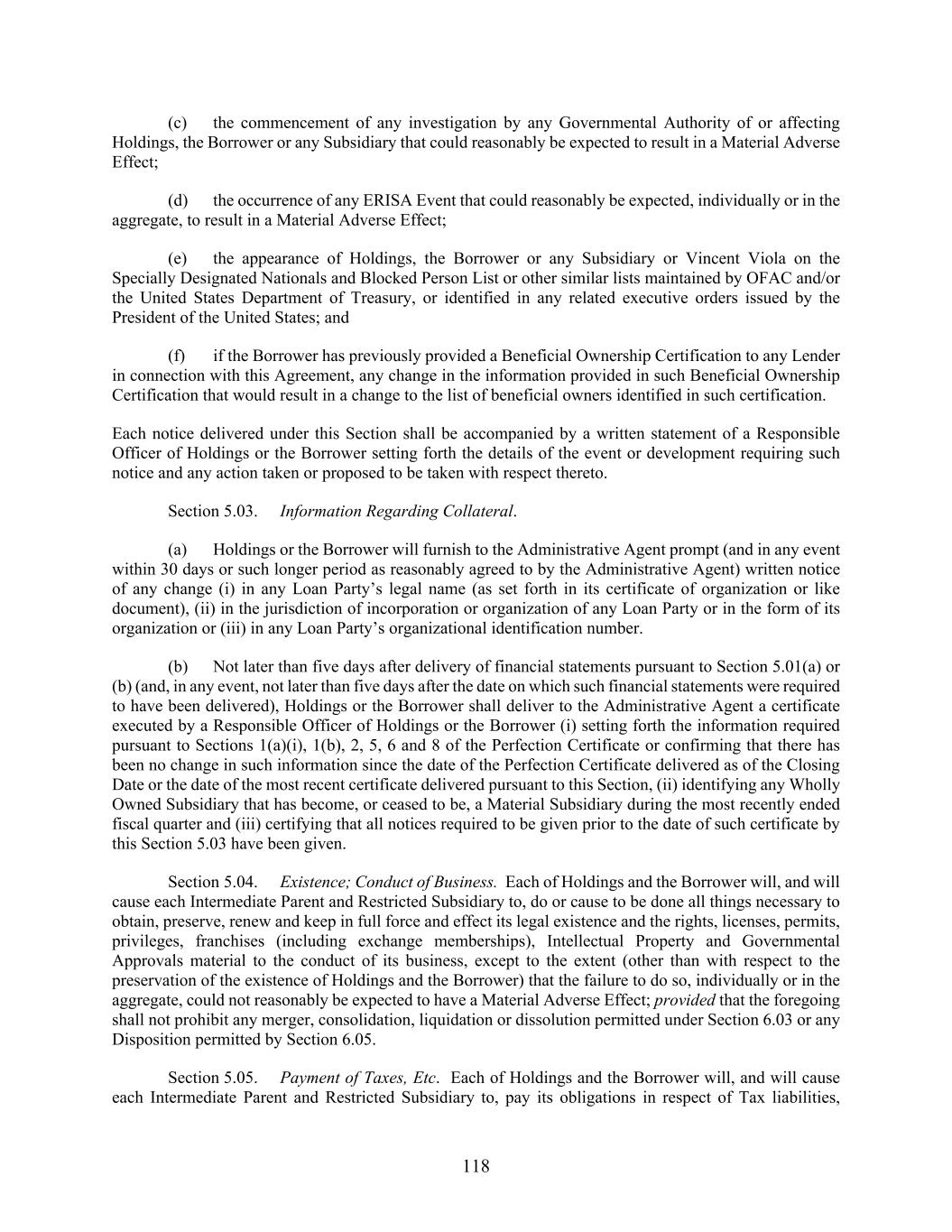 118 (c) the commencement of any investigation by any Governmental Authority of or affecting Holdings, the Borrower or any Subsidiary that could reasonably be expected to result in a Material Adverse Effect; (d) the occurrence of any ERISA Event that could reasonably be expected, individually or in the aggregate, to result in a Material Adverse Effect; (e) the appearance of Holdings, the Borrower or any Subsidiary or Vincent Viola on the Specially Designated Nationals and Blocked Person List or other similar lists maintained by OFAC and/or the United States Department of Treasury, or identified in any related executive orders issued by the President of the United States; and (f) if the Borrower has previously provided a Beneficial Ownership Certification to any Lender in connection with this Agreement, any change in the information provided in such Beneficial Ownership Certification that would result in a change to the list of beneficial owners identified in such certification. Each notice delivered under this Section shall be accompanied by a written statement of a Responsible Officer of Holdings or the Borrower setting forth the details of the event or development requiring such notice and any action taken or proposed to be taken with respect thereto. Section 5.03. Information Regarding Collateral. (a) Holdings or the Borrower will furnish to the Administrative Agent prompt (and in any event within 30 days or such longer period as reasonably agreed to by the Administrative Agent) written notice of any change (i) in any Loan Party’s legal name (as set forth in its certificate of organization or like document), (ii) in the jurisdiction of incorporation or organization of any Loan Party or in the form of its organization or (iii) in any Loan Party’s organizational identification number. (b) Not later than five days after delivery of financial statements pursuant to Section 5.01(a) or (b) (and, in any event, not later than five days after the date on which such financial statements were required to have been delivered), Holdings or the Borrower shall deliver to the Administrative Agent a certificate executed by a Responsible Officer of Holdings or the Borrower (i) setting forth the information required pursuant to Sections 1(a)(i), 1(b), 2, 5, 6 and 8 of the Perfection Certificate or confirming that there has been no change in such information since the date of the Perfection Certificate delivered as of the Closing Date or the date of the most recent certificate delivered pursuant to this Section, (ii) identifying any Wholly Owned Subsidiary that has become, or ceased to be, a Material Subsidiary during the most recently ended fiscal quarter and (iii) certifying that all notices required to be given prior to the date of such certificate by this Section 5.03 have been given. Section 5.04. Existence; Conduct of Business. Each of Holdings and the Borrower will, and will cause each Intermediate Parent and Restricted Subsidiary to, do or cause to be done all things necessary to obtain, preserve, renew and keep in full force and effect its legal existence and the rights, licenses, permits, privileges, franchises (including exchange memberships), Intellectual Property and Governmental Approvals material to the conduct of its business, except to the extent (other than with respect to the preservation of the existence of Holdings and the Borrower) that the failure to do so, individually or in the aggregate, could not reasonably be expected to have a Material Adverse Effect; provided that the foregoing shall not prohibit any merger, consolidation, liquidation or dissolution permitted under Section 6.03 or any Disposition permitted by Section 6.05. Section 5.05. Payment of Taxes, Etc. Each of Holdings and the Borrower will, and will cause each Intermediate Parent and Restricted Subsidiary to, pay its obligations in respect of Tax liabilities,