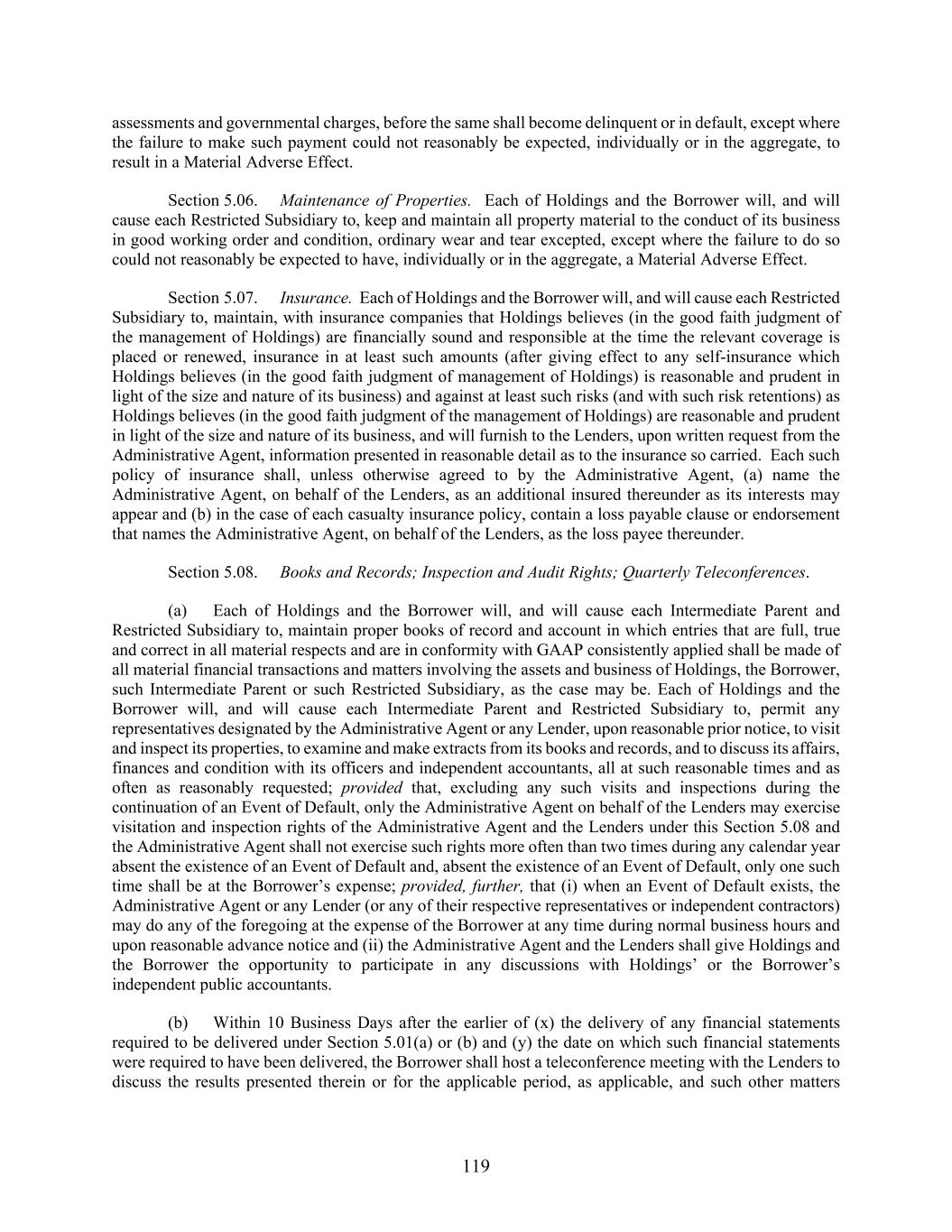 119 assessments and governmental charges, before the same shall become delinquent or in default, except where the failure to make such payment could not reasonably be expected, individually or in the aggregate, to result in a Material Adverse Effect. Section 5.06. Maintenance of Properties. Each of Holdings and the Borrower will, and will cause each Restricted Subsidiary to, keep and maintain all property material to the conduct of its business in good working order and condition, ordinary wear and tear excepted, except where the failure to do so could not reasonably be expected to have, individually or in the aggregate, a Material Adverse Effect. Section 5.07. Insurance. Each of Holdings and the Borrower will, and will cause each Restricted Subsidiary to, maintain, with insurance companies that Holdings believes (in the good faith judgment of the management of Holdings) are financially sound and responsible at the time the relevant coverage is placed or renewed, insurance in at least such amounts (after giving effect to any self-insurance which Holdings believes (in the good faith judgment of management of Holdings) is reasonable and prudent in light of the size and nature of its business) and against at least such risks (and with such risk retentions) as Holdings believes (in the good faith judgment of the management of Holdings) are reasonable and prudent in light of the size and nature of its business, and will furnish to the Lenders, upon written request from the Administrative Agent, information presented in reasonable detail as to the insurance so carried. Each such policy of insurance shall, unless otherwise agreed to by the Administrative Agent, (a) name the Administrative Agent, on behalf of the Lenders, as an additional insured thereunder as its interests may appear and (b) in the case of each casualty insurance policy, contain a loss payable clause or endorsement that names the Administrative Agent, on behalf of the Lenders, as the loss payee thereunder. Section 5.08. Books and Records; Inspection and Audit Rights; Quarterly Teleconferences. (a) Each of Holdings and the Borrower will, and will cause each Intermediate Parent and Restricted Subsidiary to, maintain proper books of record and account in which entries that are full, true and correct in all material respects and are in conformity with GAAP consistently applied shall be made of all material financial transactions and matters involving the assets and business of Holdings, the Borrower, such Intermediate Parent or such Restricted Subsidiary, as the case may be. Each of Holdings and the Borrower will, and will cause each Intermediate Parent and Restricted Subsidiary to, permit any representatives designated by the Administrative Agent or any Lender, upon reasonable prior notice, to visit and inspect its properties, to examine and make extracts from its books and records, and to discuss its affairs, finances and condition with its officers and independent accountants, all at such reasonable times and as often as reasonably requested; provided that, excluding any such visits and inspections during the continuation of an Event of Default, only the Administrative Agent on behalf of the Lenders may exercise visitation and inspection rights of the Administrative Agent and the Lenders under this Section 5.08 and the Administrative Agent shall not exercise such rights more often than two times during any calendar year absent the existence of an Event of Default and, absent the existence of an Event of Default, only one such time shall be at the Borrower’s expense; provided, further, that (i) when an Event of Default exists, the Administrative Agent or any Lender (or any of their respective representatives or independent contractors) may do any of the foregoing at the expense of the Borrower at any time during normal business hours and upon reasonable advance notice and (ii) the Administrative Agent and the Lenders shall give Holdings and the Borrower the opportunity to participate in any discussions with Holdings’ or the Borrower’s independent public accountants. (b) Within 10 Business Days after the earlier of (x) the delivery of any financial statements required to be delivered under Section 5.01(a) or (b) and (y) the date on which such financial statements were required to have been delivered, the Borrower shall host a teleconference meeting with the Lenders to discuss the results presented therein or for the applicable period, as applicable, and such other matters