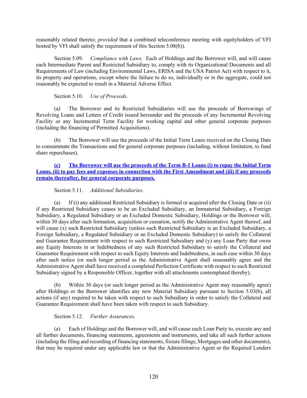 120 reasonably related thereto; provided that a combined teleconference meeting with equityholders of VFI hosted by VFI shall satisfy the requirement of this Section 5.08(b)). Section 5.09. Compliance with Laws. Each of Holdings and the Borrower will, and will cause each Intermediate Parent and Restricted Subsidiary to, comply with its Organizational Documents and all Requirements of Law (including Environmental Laws, ERISA and the USA Patriot Act) with respect to it, its property and operations, except where the failure to do so, individually or in the aggregate, could not reasonably be expected to result in a Material Adverse Effect. Section 5.10. Use of Proceeds. (a) The Borrower and its Restricted Subsidiaries will use the proceeds of Borrowings of Revolving Loans and Letters of Credit issued hereunder and the proceeds of any Incremental Revolving Facility or any Incremental Term Facility for working capital and other general corporate purposes (including the financing of Permitted Acquisitions). (b) The Borrower will use the proceeds of the Initial Term Loans received on the Closing Date to consummate the Transactions and for general corporate purposes (including, without limitation, to fund share repurchases). (c) The Borrower will use the proceeds of the Term B-1 Loans (i) to repay the Initial Term Loans, (ii) to pay fees and expenses in connection with the First Amendment and (iii) if any proceeds remain thereafter, for general corporate purposes. Section 5.11. Additional Subsidiaries. (a) If (i) any additional Restricted Subsidiary is formed or acquired after the Closing Date or (ii) if any Restricted Subsidiary ceases to be an Excluded Subsidiary, an Immaterial Subsidiary, a Foreign Subsidiary, a Regulated Subsidiary or an Excluded Domestic Subsidiary, Holdings or the Borrower will, within 30 days after such formation, acquisition or cessation, notify the Administrative Agent thereof, and will cause (x) such Restricted Subsidiary (unless such Restricted Subsidiary is an Excluded Subsidiary, a Foreign Subsidiary, a Regulated Subsidiary or an Excluded Domestic Subsidiary) to satisfy the Collateral and Guarantee Requirement with respect to such Restricted Subsidiary and (y) any Loan Party that owns any Equity Interests in or Indebtedness of any such Restricted Subsidiary to satisfy the Collateral and Guarantee Requirement with respect to such Equity Interests and Indebtedness, in each case within 30 days after such notice (or such longer period as the Administrative Agent shall reasonably agree and the Administrative Agent shall have received a completed Perfection Certificate with respect to such Restricted Subsidiary signed by a Responsible Officer, together with all attachments contemplated thereby). (b) Within 30 days (or such longer period as the Administrative Agent may reasonably agree) after Holdings or the Borrower identifies any new Material Subsidiary pursuant to Section 5.03(b), all actions (if any) required to be taken with respect to such Subsidiary in order to satisfy the Collateral and Guarantee Requirement shall have been taken with respect to such Subsidiary. Section 5.12. Further Assurances. (a) Each of Holdings and the Borrower will, and will cause each Loan Party to, execute any and all further documents, financing statements, agreements and instruments, and take all such further actions (including the filing and recording of financing statements, fixture filings, Mortgages and other documents), that may be required under any applicable law or that the Administrative Agent or the Required Lenders
