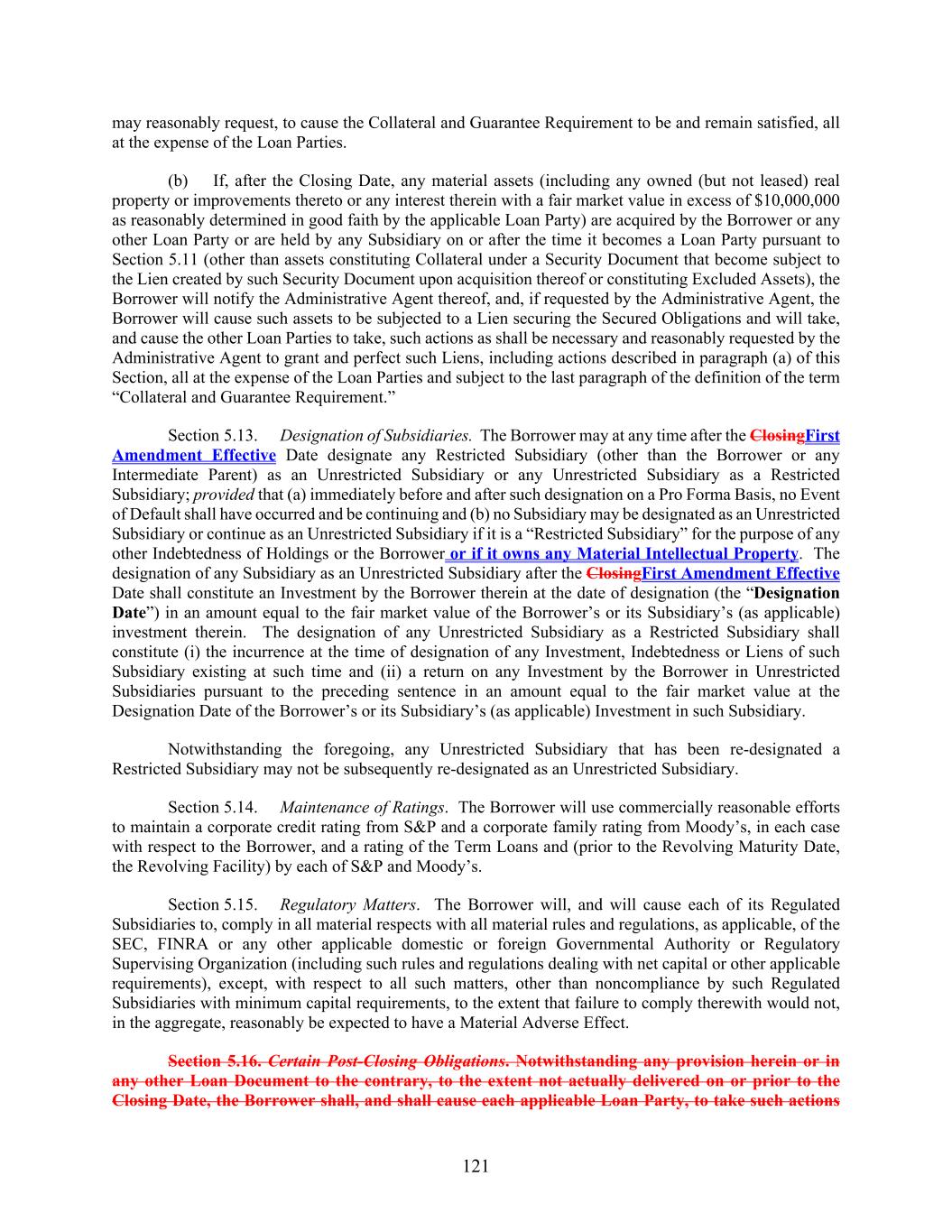 121 may reasonably request, to cause the Collateral and Guarantee Requirement to be and remain satisfied, all at the expense of the Loan Parties. (b) If, after the Closing Date, any material assets (including any owned (but not leased) real property or improvements thereto or any interest therein with a fair market value in excess of $10,000,000 as reasonably determined in good faith by the applicable Loan Party) are acquired by the Borrower or any other Loan Party or are held by any Subsidiary on or after the time it becomes a Loan Party pursuant to Section 5.11 (other than assets constituting Collateral under a Security Document that become subject to the Lien created by such Security Document upon acquisition thereof or constituting Excluded Assets), the Borrower will notify the Administrative Agent thereof, and, if requested by the Administrative Agent, the Borrower will cause such assets to be subjected to a Lien securing the Secured Obligations and will take, and cause the other Loan Parties to take, such actions as shall be necessary and reasonably requested by the Administrative Agent to grant and perfect such Liens, including actions described in paragraph (a) of this Section, all at the expense of the Loan Parties and subject to the last paragraph of the definition of the term “Collateral and Guarantee Requirement.” Section 5.13. Designation of Subsidiaries. The Borrower may at any time after the ClosingFirst Amendment Effective Date designate any Restricted Subsidiary (other than the Borrower or any Intermediate Parent) as an Unrestricted Subsidiary or any Unrestricted Subsidiary as a Restricted Subsidiary; provided that (a) immediately before and after such designation on a Pro Forma Basis, no Event of Default shall have occurred and be continuing and (b) no Subsidiary may be designated as an Unrestricted Subsidiary or continue as an Unrestricted Subsidiary if it is a “Restricted Subsidiary” for the purpose of any other Indebtedness of Holdings or the Borrower or if it owns any Material Intellectual Property. The designation of any Subsidiary as an Unrestricted Subsidiary after the ClosingFirst Amendment Effective Date shall constitute an Investment by the Borrower therein at the date of designation (the “Designation Date”) in an amount equal to the fair market value of the Borrower’s or its Subsidiary’s (as applicable) investment therein. The designation of any Unrestricted Subsidiary as a Restricted Subsidiary shall constitute (i) the incurrence at the time of designation of any Investment, Indebtedness or Liens of such Subsidiary existing at such time and (ii) a return on any Investment by the Borrower in Unrestricted Subsidiaries pursuant to the preceding sentence in an amount equal to the fair market value at the Designation Date of the Borrower’s or its Subsidiary’s (as applicable) Investment in such Subsidiary. Notwithstanding the foregoing, any Unrestricted Subsidiary that has been re-designated a Restricted Subsidiary may not be subsequently re-designated as an Unrestricted Subsidiary. Section 5.14. Maintenance of Ratings. The Borrower will use commercially reasonable efforts to maintain a corporate credit rating from S&P and a corporate family rating from Moody’s, in each case with respect to the Borrower, and a rating of the Term Loans and (prior to the Revolving Maturity Date, the Revolving Facility) by each of S&P and Moody’s. Section 5.15. Regulatory Matters. The Borrower will, and will cause each of its Regulated Subsidiaries to, comply in all material respects with all material rules and regulations, as applicable, of the SEC, FINRA or any other applicable domestic or foreign Governmental Authority or Regulatory Supervising Organization (including such rules and regulations dealing with net capital or other applicable requirements), except, with respect to all such matters, other than noncompliance by such Regulated Subsidiaries with minimum capital requirements, to the extent that failure to comply therewith would not, in the aggregate, reasonably be expected to have a Material Adverse Effect. Section 5.16. Certain Post-Closing Obligations. Notwithstanding any provision herein or in any other Loan Document to the contrary, to the extent not actually delivered on or prior to the Closing Date, the Borrower shall, and shall cause each applicable Loan Party, to take such actions