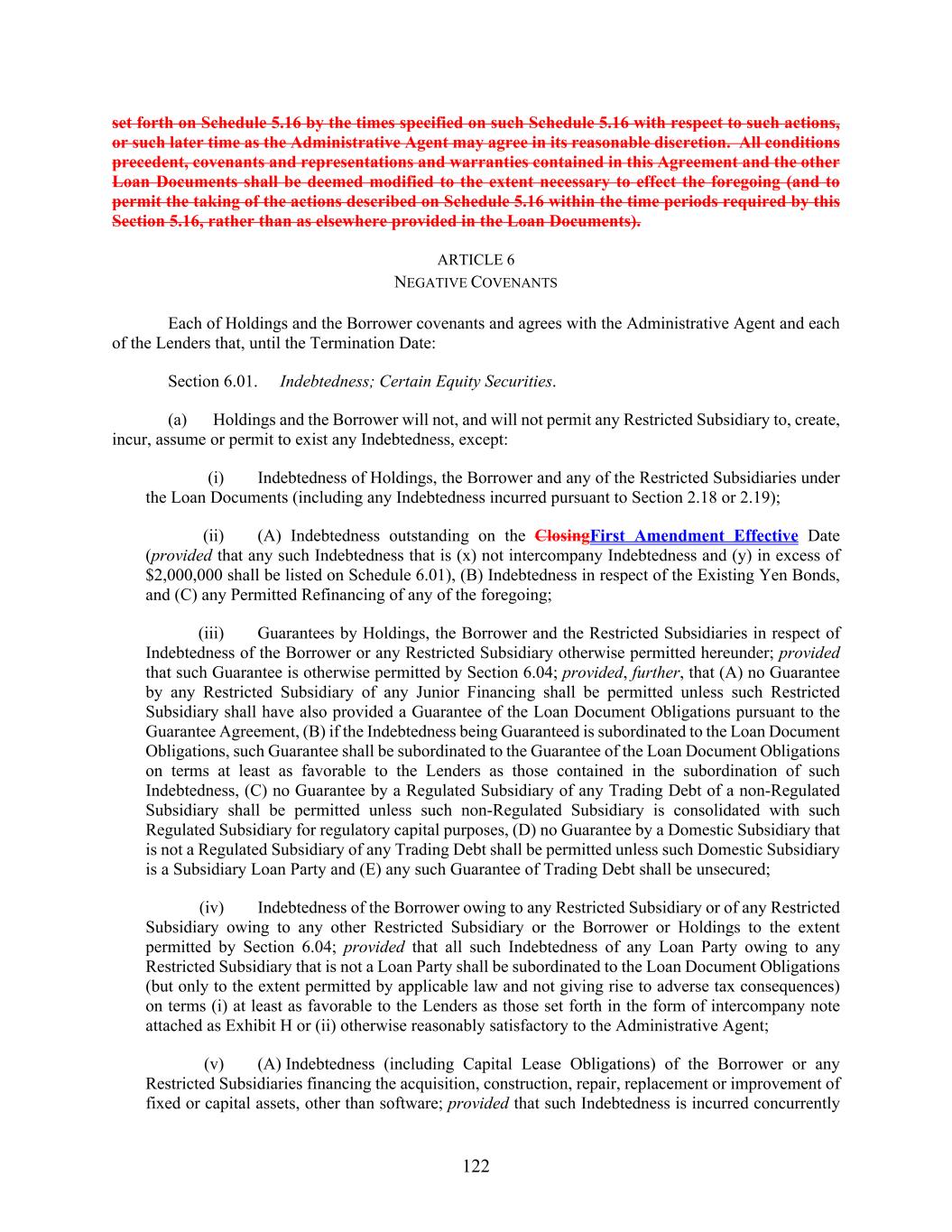 122 set forth on Schedule 5.16 by the times specified on such Schedule 5.16 with respect to such actions, or such later time as the Administrative Agent may agree in its reasonable discretion. All conditions precedent, covenants and representations and warranties contained in this Agreement and the other Loan Documents shall be deemed modified to the extent necessary to effect the foregoing (and to permit the taking of the actions described on Schedule 5.16 within the time periods required by this Section 5.16, rather than as elsewhere provided in the Loan Documents). ARTICLE 6 NEGATIVE COVENANTS Each of Holdings and the Borrower covenants and agrees with the Administrative Agent and each of the Lenders that, until the Termination Date: Section 6.01. Indebtedness; Certain Equity Securities. (a) Holdings and the Borrower will not, and will not permit any Restricted Subsidiary to, create, incur, assume or permit to exist any Indebtedness, except: (i) Indebtedness of Holdings, the Borrower and any of the Restricted Subsidiaries under the Loan Documents (including any Indebtedness incurred pursuant to Section 2.18 or 2.19); (ii) (A) Indebtedness outstanding on the ClosingFirst Amendment Effective Date (provided that any such Indebtedness that is (x) not intercompany Indebtedness and (y) in excess of $2,000,000 shall be listed on Schedule 6.01), (B) Indebtedness in respect of the Existing Yen Bonds, and (C) any Permitted Refinancing of any of the foregoing; (iii) Guarantees by Holdings, the Borrower and the Restricted Subsidiaries in respect of Indebtedness of the Borrower or any Restricted Subsidiary otherwise permitted hereunder; provided that such Guarantee is otherwise permitted by Section 6.04; provided, further, that (A) no Guarantee by any Restricted Subsidiary of any Junior Financing shall be permitted unless such Restricted Subsidiary shall have also provided a Guarantee of the Loan Document Obligations pursuant to the Guarantee Agreement, (B) if the Indebtedness being Guaranteed is subordinated to the Loan Document Obligations, such Guarantee shall be subordinated to the Guarantee of the Loan Document Obligations on terms at least as favorable to the Lenders as those contained in the subordination of such Indebtedness, (C) no Guarantee by a Regulated Subsidiary of any Trading Debt of a non-Regulated Subsidiary shall be permitted unless such non-Regulated Subsidiary is consolidated with such Regulated Subsidiary for regulatory capital purposes, (D) no Guarantee by a Domestic Subsidiary that is not a Regulated Subsidiary of any Trading Debt shall be permitted unless such Domestic Subsidiary is a Subsidiary Loan Party and (E) any such Guarantee of Trading Debt shall be unsecured; (iv) Indebtedness of the Borrower owing to any Restricted Subsidiary or of any Restricted Subsidiary owing to any other Restricted Subsidiary or the Borrower or Holdings to the extent permitted by Section 6.04; provided that all such Indebtedness of any Loan Party owing to any Restricted Subsidiary that is not a Loan Party shall be subordinated to the Loan Document Obligations (but only to the extent permitted by applicable law and not giving rise to adverse tax consequences) on terms (i) at least as favorable to the Lenders as those set forth in the form of intercompany note attached as Exhibit H or (ii) otherwise reasonably satisfactory to the Administrative Agent; (v) (A) Indebtedness (including Capital Lease Obligations) of the Borrower or any Restricted Subsidiaries financing the acquisition, construction, repair, replacement or improvement of fixed or capital assets, other than software; provided that such Indebtedness is incurred concurrently