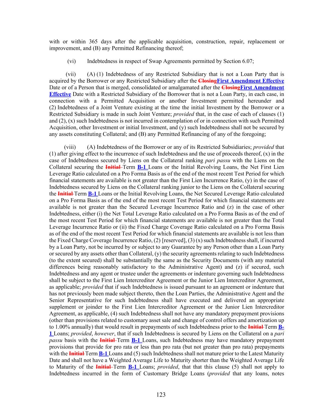 123 with or within 365 days after the applicable acquisition, construction, repair, replacement or improvement, and (B) any Permitted Refinancing thereof; (vi) Indebtedness in respect of Swap Agreements permitted by Section 6.07; (vii) (A) (1) Indebtedness of any Restricted Subsidiary that is not a Loan Party that is acquired by the Borrower or any Restricted Subsidiary after the ClosingFirst Amendment Effective Date or of a Person that is merged, consolidated or amalgamated after the ClosingFirst Amendment Effective Date with a Restricted Subsidiary of the Borrower that is not a Loan Party, in each case, in connection with a Permitted Acquisition or another Investment permitted hereunder and (2) Indebtedness of a Joint Venture existing at the time the initial Investment by the Borrower or a Restricted Subsidiary is made in such Joint Venture; provided that, in the case of each of clauses (1) and (2), (x) such Indebtedness is not incurred in contemplation of or in connection with such Permitted Acquisition, other Investment or initial Investment, and (y) such Indebtedness shall not be secured by any assets constituting Collateral; and (B) any Permitted Refinancing of any of the foregoing; (viii) (A) Indebtedness of the Borrower or any of its Restricted Subsidiaries; provided that (1) after giving effect to the incurrence of such Indebtedness and the use of proceeds thereof, (x) in the case of Indebtedness secured by Liens on the Collateral ranking pari passu with the Liens on the Collateral securing the Initial Term B-1 Loans or the Initial Revolving Loans, the Net First Lien Leverage Ratio calculated on a Pro Forma Basis as of the end of the most recent Test Period for which financial statements are available is not greater than the First Lien Incurrence Ratio, (y) in the case of Indebtedness secured by Liens on the Collateral ranking junior to the Liens on the Collateral securing the Initial Term B-1 Loans or the Initial Revolving Loans, the Net Secured Leverage Ratio calculated on a Pro Forma Basis as of the end of the most recent Test Period for which financial statements are available is not greater than the Secured Leverage Incurrence Ratio and (z) in the case of other Indebtedness, either (i) the Net Total Leverage Ratio calculated on a Pro Forma Basis as of the end of the most recent Test Period for which financial statements are available is not greater than the Total Leverage Incurrence Ratio or (ii) the Fixed Charge Coverage Ratio calculated on a Pro Forma Basis as of the end of the most recent Test Period for which financial statements are available is not less than the Fixed Charge Coverage Incurrence Ratio, (2) [reserved], (3) (x) such Indebtedness shall, if incurred by a Loan Party, not be incurred by or subject to any Guarantee by any Person other than a Loan Party or secured by any assets other than Collateral, (y) the security agreements relating to such Indebtedness (to the extent secured) shall be substantially the same as the Security Documents (with any material differences being reasonably satisfactory to the Administrative Agent) and (z) if secured, such Indebtedness and any agent or trustee under the agreements or indenture governing such Indebtedness shall be subject to the First Lien Intercreditor Agreement or the Junior Lien Intercreditor Agreement, as applicable; provided that if such Indebtedness is issued pursuant to an agreement or indenture that has not previously been made subject thereto, then the Loan Parties, the Administrative Agent and the Senior Representative for such Indebtedness shall have executed and delivered an appropriate supplement or joinder to the First Lien Intercreditor Agreement or the Junior Lien Intercreditor Agreement, as applicable, (4) such Indebtedness shall not have any mandatory prepayment provisions (other than provisions related to customary asset sale and change of control offers and amortization up to 1.00% annually) that would result in prepayments of such Indebtedness prior to the Initial Term B- 1 Loans; provided, however, that if such Indebtedness is secured by Liens on the Collateral on a pari passu basis with the Initial Term B-1 Loans, such Indebtedness may have mandatory prepayment provisions that provide for pro rata or less than pro rata (but not greater than pro rata) prepayments with the Initial Term B-1 Loans and (5) such Indebtedness shall not mature prior to the Latest Maturity Date and shall not have a Weighted Average Life to Maturity shorter than the Weighted Average Life to Maturity of the Initial Term B-1 Loans; provided, that that this clause (5) shall not apply to Indebtedness incurred in the form of Customary Bridge Loans (provided that any loans, notes
