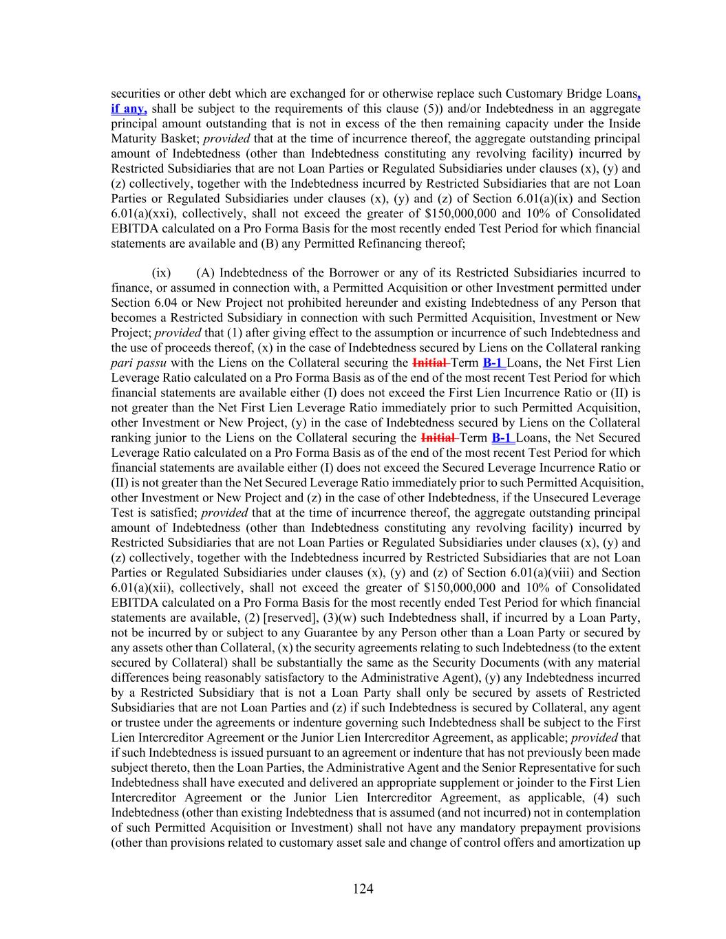 124 securities or other debt which are exchanged for or otherwise replace such Customary Bridge Loans, if any, shall be subject to the requirements of this clause (5)) and/or Indebtedness in an aggregate principal amount outstanding that is not in excess of the then remaining capacity under the Inside Maturity Basket; provided that at the time of incurrence thereof, the aggregate outstanding principal amount of Indebtedness (other than Indebtedness constituting any revolving facility) incurred by Restricted Subsidiaries that are not Loan Parties or Regulated Subsidiaries under clauses (x), (y) and (z) collectively, together with the Indebtedness incurred by Restricted Subsidiaries that are not Loan Parties or Regulated Subsidiaries under clauses (x), (y) and (z) of Section 6.01(a)(ix) and Section 6.01(a)(xxi), collectively, shall not exceed the greater of $150,000,000 and 10% of Consolidated EBITDA calculated on a Pro Forma Basis for the most recently ended Test Period for which financial statements are available and (B) any Permitted Refinancing thereof; (ix) (A) Indebtedness of the Borrower or any of its Restricted Subsidiaries incurred to finance, or assumed in connection with, a Permitted Acquisition or other Investment permitted under Section 6.04 or New Project not prohibited hereunder and existing Indebtedness of any Person that becomes a Restricted Subsidiary in connection with such Permitted Acquisition, Investment or New Project; provided that (1) after giving effect to the assumption or incurrence of such Indebtedness and the use of proceeds thereof, (x) in the case of Indebtedness secured by Liens on the Collateral ranking pari passu with the Liens on the Collateral securing the Initial Term B-1 Loans, the Net First Lien Leverage Ratio calculated on a Pro Forma Basis as of the end of the most recent Test Period for which financial statements are available either (I) does not exceed the First Lien Incurrence Ratio or (II) is not greater than the Net First Lien Leverage Ratio immediately prior to such Permitted Acquisition, other Investment or New Project, (y) in the case of Indebtedness secured by Liens on the Collateral ranking junior to the Liens on the Collateral securing the Initial Term B-1 Loans, the Net Secured Leverage Ratio calculated on a Pro Forma Basis as of the end of the most recent Test Period for which financial statements are available either (I) does not exceed the Secured Leverage Incurrence Ratio or (II) is not greater than the Net Secured Leverage Ratio immediately prior to such Permitted Acquisition, other Investment or New Project and (z) in the case of other Indebtedness, if the Unsecured Leverage Test is satisfied; provided that at the time of incurrence thereof, the aggregate outstanding principal amount of Indebtedness (other than Indebtedness constituting any revolving facility) incurred by Restricted Subsidiaries that are not Loan Parties or Regulated Subsidiaries under clauses (x), (y) and (z) collectively, together with the Indebtedness incurred by Restricted Subsidiaries that are not Loan Parties or Regulated Subsidiaries under clauses (x), (y) and (z) of Section 6.01(a)(viii) and Section 6.01(a)(xii), collectively, shall not exceed the greater of $150,000,000 and 10% of Consolidated EBITDA calculated on a Pro Forma Basis for the most recently ended Test Period for which financial statements are available, (2) [reserved], (3)(w) such Indebtedness shall, if incurred by a Loan Party, not be incurred by or subject to any Guarantee by any Person other than a Loan Party or secured by any assets other than Collateral, (x) the security agreements relating to such Indebtedness (to the extent secured by Collateral) shall be substantially the same as the Security Documents (with any material differences being reasonably satisfactory to the Administrative Agent), (y) any Indebtedness incurred by a Restricted Subsidiary that is not a Loan Party shall only be secured by assets of Restricted Subsidiaries that are not Loan Parties and (z) if such Indebtedness is secured by Collateral, any agent or trustee under the agreements or indenture governing such Indebtedness shall be subject to the First Lien Intercreditor Agreement or the Junior Lien Intercreditor Agreement, as applicable; provided that if such Indebtedness is issued pursuant to an agreement or indenture that has not previously been made subject thereto, then the Loan Parties, the Administrative Agent and the Senior Representative for such Indebtedness shall have executed and delivered an appropriate supplement or joinder to the First Lien Intercreditor Agreement or the Junior Lien Intercreditor Agreement, as applicable, (4) such Indebtedness (other than existing Indebtedness that is assumed (and not incurred) not in contemplation of such Permitted Acquisition or Investment) shall not have any mandatory prepayment provisions (other than provisions related to customary asset sale and change of control offers and amortization up