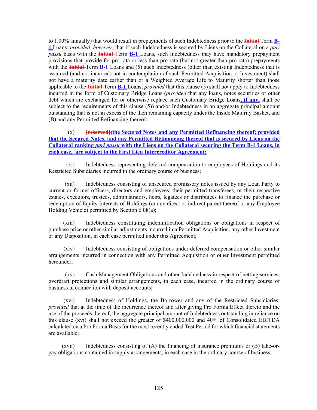 125 to 1.00% annually) that would result in prepayments of such Indebtedness prior to the Initial Term B- 1 Loans; provided, however, that if such Indebtedness is secured by Liens on the Collateral on a pari passu basis with the Initial Term B-1 Loans, such Indebtedness may have mandatory prepayment provisions that provide for pro rata or less than pro rata (but not greater than pro rata) prepayments with the Initial Term B-1 Loans and (5) such Indebtedness (other than existing Indebtedness that is assumed (and not incurred) not in contemplation of such Permitted Acquisition or Investment) shall not have a maturity date earlier than or a Weighted Average Life to Maturity shorter than those applicable to the Initial Term B-1 Loans; provided that this clause (5) shall not apply to Indebtedness incurred in the form of Customary Bridge Loans (provided that any loans, notes securities or other debt which are exchanged for or otherwise replace such Customary Bridge Loans, if any, shall be subject to the requirements of this clause (5)) and/or Indebtedness in an aggregate principal amount outstanding that is not in excess of the then remaining capacity under the Inside Maturity Basket, and (B) and any Permitted Refinancing thereof; (x) [reserved];the Secured Notes and any Permitted Refinancing thereof; provided that the Secured Notes, and any Permitted Refinancing thereof that is secured by Liens on the Collateral ranking pari passu with the Liens on the Collateral securing the Term B-1 Loans, in each case, are subject to the First Lien Intercreditor Agreement; (xi) Indebtedness representing deferred compensation to employees of Holdings and its Restricted Subsidiaries incurred in the ordinary course of business; (xii) Indebtedness consisting of unsecured promissory notes issued by any Loan Party to current or former officers, directors and employees, their permitted transferees, or their respective estates, executors, trustees, administrators, heirs, legatees or distributees to finance the purchase or redemption of Equity Interests of Holdings (or any direct or indirect parent thereof or any Employee Holding Vehicle) permitted by Section 6.08(a); (xiii) Indebtedness constituting indemnification obligations or obligations in respect of purchase price or other similar adjustments incurred in a Permitted Acquisition, any other Investment or any Disposition, in each case permitted under this Agreement; (xiv) Indebtedness consisting of obligations under deferred compensation or other similar arrangements incurred in connection with any Permitted Acquisition or other Investment permitted hereunder; (xv) Cash Management Obligations and other Indebtedness in respect of netting services, overdraft protections and similar arrangements, in each case, incurred in the ordinary course of business in connection with deposit accounts; (xvi) Indebtedness of Holdings, the Borrower and any of the Restricted Subsidiaries; provided that at the time of the incurrence thereof and after giving Pro Forma Effect thereto and the use of the proceeds thereof, the aggregate principal amount of Indebtedness outstanding in reliance on this clause (xvi) shall not exceed the greater of $400,000,000 and 40% of Consolidated EBITDA calculated on a Pro Forma Basis for the most recently ended Test Period for which financial statements are available; (xvii) Indebtedness consisting of (A) the financing of insurance premiums or (B) take-or- pay obligations contained in supply arrangements, in each case in the ordinary course of business;