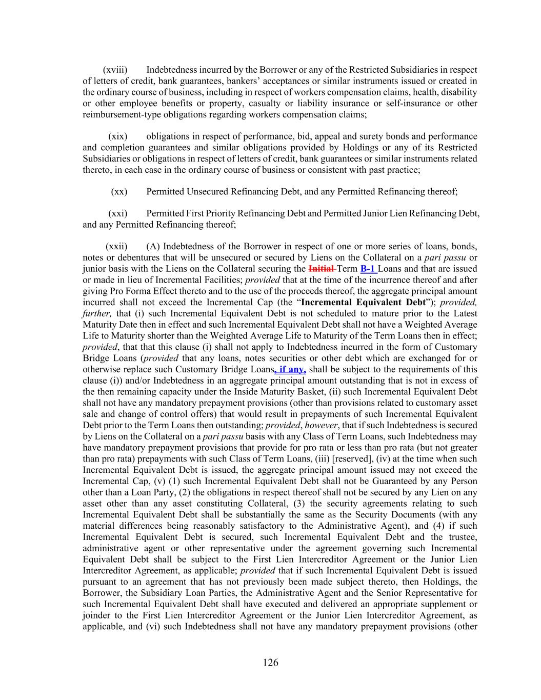 126 (xviii) Indebtedness incurred by the Borrower or any of the Restricted Subsidiaries in respect of letters of credit, bank guarantees, bankers’ acceptances or similar instruments issued or created in the ordinary course of business, including in respect of workers compensation claims, health, disability or other employee benefits or property, casualty or liability insurance or self-insurance or other reimbursement-type obligations regarding workers compensation claims; (xix) obligations in respect of performance, bid, appeal and surety bonds and performance and completion guarantees and similar obligations provided by Holdings or any of its Restricted Subsidiaries or obligations in respect of letters of credit, bank guarantees or similar instruments related thereto, in each case in the ordinary course of business or consistent with past practice; (xx) Permitted Unsecured Refinancing Debt, and any Permitted Refinancing thereof; (xxi) Permitted First Priority Refinancing Debt and Permitted Junior Lien Refinancing Debt, and any Permitted Refinancing thereof; (xxii) (A) Indebtedness of the Borrower in respect of one or more series of loans, bonds, notes or debentures that will be unsecured or secured by Liens on the Collateral on a pari passu or junior basis with the Liens on the Collateral securing the Initial Term B-1 Loans and that are issued or made in lieu of Incremental Facilities; provided that at the time of the incurrence thereof and after giving Pro Forma Effect thereto and to the use of the proceeds thereof, the aggregate principal amount incurred shall not exceed the Incremental Cap (the “Incremental Equivalent Debt”); provided, further, that (i) such Incremental Equivalent Debt is not scheduled to mature prior to the Latest Maturity Date then in effect and such Incremental Equivalent Debt shall not have a Weighted Average Life to Maturity shorter than the Weighted Average Life to Maturity of the Term Loans then in effect; provided, that that this clause (i) shall not apply to Indebtedness incurred in the form of Customary Bridge Loans (provided that any loans, notes securities or other debt which are exchanged for or otherwise replace such Customary Bridge Loans, if any, shall be subject to the requirements of this clause (i)) and/or Indebtedness in an aggregate principal amount outstanding that is not in excess of the then remaining capacity under the Inside Maturity Basket, (ii) such Incremental Equivalent Debt shall not have any mandatory prepayment provisions (other than provisions related to customary asset sale and change of control offers) that would result in prepayments of such Incremental Equivalent Debt prior to the Term Loans then outstanding; provided, however, that if such Indebtedness is secured by Liens on the Collateral on a pari passu basis with any Class of Term Loans, such Indebtedness may have mandatory prepayment provisions that provide for pro rata or less than pro rata (but not greater than pro rata) prepayments with such Class of Term Loans, (iii) [reserved], (iv) at the time when such Incremental Equivalent Debt is issued, the aggregate principal amount issued may not exceed the Incremental Cap, (v) (1) such Incremental Equivalent Debt shall not be Guaranteed by any Person other than a Loan Party, (2) the obligations in respect thereof shall not be secured by any Lien on any asset other than any asset constituting Collateral, (3) the security agreements relating to such Incremental Equivalent Debt shall be substantially the same as the Security Documents (with any material differences being reasonably satisfactory to the Administrative Agent), and (4) if such Incremental Equivalent Debt is secured, such Incremental Equivalent Debt and the trustee, administrative agent or other representative under the agreement governing such Incremental Equivalent Debt shall be subject to the First Lien Intercreditor Agreement or the Junior Lien Intercreditor Agreement, as applicable; provided that if such Incremental Equivalent Debt is issued pursuant to an agreement that has not previously been made subject thereto, then Holdings, the Borrower, the Subsidiary Loan Parties, the Administrative Agent and the Senior Representative for such Incremental Equivalent Debt shall have executed and delivered an appropriate supplement or joinder to the First Lien Intercreditor Agreement or the Junior Lien Intercreditor Agreement, as applicable, and (vi) such Indebtedness shall not have any mandatory prepayment provisions (other