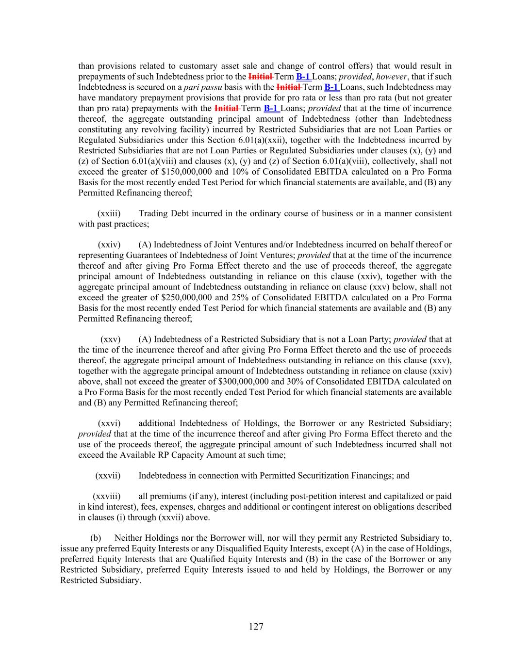 127 than provisions related to customary asset sale and change of control offers) that would result in prepayments of such Indebtedness prior to the Initial Term B-1 Loans; provided, however, that if such Indebtedness is secured on a pari passu basis with the Initial Term B-1 Loans, such Indebtedness may have mandatory prepayment provisions that provide for pro rata or less than pro rata (but not greater than pro rata) prepayments with the Initial Term B-1 Loans; provided that at the time of incurrence thereof, the aggregate outstanding principal amount of Indebtedness (other than Indebtedness constituting any revolving facility) incurred by Restricted Subsidiaries that are not Loan Parties or Regulated Subsidiaries under this Section 6.01(a)(xxii), together with the Indebtedness incurred by Restricted Subsidiaries that are not Loan Parties or Regulated Subsidiaries under clauses (x), (y) and (z) of Section 6.01(a)(viii) and clauses (x), (y) and (z) of Section 6.01(a)(viii), collectively, shall not exceed the greater of $150,000,000 and 10% of Consolidated EBITDA calculated on a Pro Forma Basis for the most recently ended Test Period for which financial statements are available, and (B) any Permitted Refinancing thereof; (xxiii) Trading Debt incurred in the ordinary course of business or in a manner consistent with past practices; (xxiv) (A) Indebtedness of Joint Ventures and/or Indebtedness incurred on behalf thereof or representing Guarantees of Indebtedness of Joint Ventures; provided that at the time of the incurrence thereof and after giving Pro Forma Effect thereto and the use of proceeds thereof, the aggregate principal amount of Indebtedness outstanding in reliance on this clause (xxiv), together with the aggregate principal amount of Indebtedness outstanding in reliance on clause (xxv) below, shall not exceed the greater of $250,000,000 and 25% of Consolidated EBITDA calculated on a Pro Forma Basis for the most recently ended Test Period for which financial statements are available and (B) any Permitted Refinancing thereof; (xxv) (A) Indebtedness of a Restricted Subsidiary that is not a Loan Party; provided that at the time of the incurrence thereof and after giving Pro Forma Effect thereto and the use of proceeds thereof, the aggregate principal amount of Indebtedness outstanding in reliance on this clause (xxv), together with the aggregate principal amount of Indebtedness outstanding in reliance on clause (xxiv) above, shall not exceed the greater of $300,000,000 and 30% of Consolidated EBITDA calculated on a Pro Forma Basis for the most recently ended Test Period for which financial statements are available and (B) any Permitted Refinancing thereof; (xxvi) additional Indebtedness of Holdings, the Borrower or any Restricted Subsidiary; provided that at the time of the incurrence thereof and after giving Pro Forma Effect thereto and the use of the proceeds thereof, the aggregate principal amount of such Indebtedness incurred shall not exceed the Available RP Capacity Amount at such time; (xxvii) Indebtedness in connection with Permitted Securitization Financings; and (xxviii) all premiums (if any), interest (including post-petition interest and capitalized or paid in kind interest), fees, expenses, charges and additional or contingent interest on obligations described in clauses (i) through (xxvii) above. (b) Neither Holdings nor the Borrower will, nor will they permit any Restricted Subsidiary to, issue any preferred Equity Interests or any Disqualified Equity Interests, except (A) in the case of Holdings, preferred Equity Interests that are Qualified Equity Interests and (B) in the case of the Borrower or any Restricted Subsidiary, preferred Equity Interests issued to and held by Holdings, the Borrower or any Restricted Subsidiary.