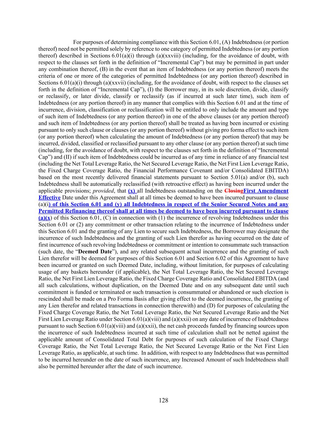 128 For purposes of determining compliance with this Section 6.01, (A) Indebtedness (or portion thereof) need not be permitted solely by reference to one category of permitted Indebtedness (or any portion thereof) described in Sections 6.01(a)(i) through (a)(xxviii) (including, for the avoidance of doubt, with respect to the clauses set forth in the definition of “Incremental Cap”) but may be permitted in part under any combination thereof, (B) in the event that an item of Indebtedness (or any portion thereof) meets the criteria of one or more of the categories of permitted Indebtedness (or any portion thereof) described in Sections 6.01(a)(i) through (a)(xxvii) (including, for the avoidance of doubt, with respect to the clauses set forth in the definition of “Incremental Cap”), (I) the Borrower may, in its sole discretion, divide, classify or reclassify, or later divide, classify or reclassify (as if incurred at such later time), such item of Indebtedness (or any portion thereof) in any manner that complies with this Section 6.01 and at the time of incurrence, division, classification or reclassification will be entitled to only include the amount and type of such item of Indebtedness (or any portion thereof) in one of the above clauses (or any portion thereof) and such item of Indebtedness (or any portion thereof) shall be treated as having been incurred or existing pursuant to only such clause or clauses (or any portion thereof) without giving pro forma effect to such item (or any portion thereof) when calculating the amount of Indebtedness (or any portion thereof) that may be incurred, divided, classified or reclassified pursuant to any other clause (or any portion thereof) at such time (including, for the avoidance of doubt, with respect to the clauses set forth in the definition of “Incremental Cap”) and (II) if such item of Indebtedness could be incurred as of any time in reliance of any financial test (including the Net Total Leverage Ratio, the Net Secured Leverage Ratio, the Net First Lien Leverage Ratio, the Fixed Charge Coverage Ratio, the Financial Performance Covenant and/or Consolidated EBITDA) based on the most recently delivered financial statements pursuant to Section 5.01(a) and/or (b), such Indebtedness shall be automatically reclassified (with retroactive effect) as having been incurred under the applicable provisions; provided, that (x) all Indebtedness outstanding on the ClosingFirst Amendment Effective Date under this Agreement shall at all times be deemed to have been incurred pursuant to clause (a)(i) of this Section 6.01 and (y) all Indebtedness in respect of the Senior Secured Notes and any Permitted Refinancing thereof shall at all times be deemed to have been incurred pursuant to clause (a)(x) of this Section 6.01, (C) in connection with (1) the incurrence of revolving Indebtedness under this Section 6.01 or (2) any commitment or other transaction relating to the incurrence of Indebtedness under this Section 6.01 and the granting of any Lien to secure such Indebtedness, the Borrower may designate the incurrence of such Indebtedness and the granting of such Lien therefor as having occurred on the date of first incurrence of such revolving Indebtedness or commitment or intention to consummate such transaction (such date, the “Deemed Date”), and any related subsequent actual incurrence and the granting of such Lien therefor will be deemed for purposes of this Section 6.01 and Section 6.02 of this Agreement to have been incurred or granted on such Deemed Date, including, without limitation, for purposes of calculating usage of any baskets hereunder (if applicable), the Net Total Leverage Ratio, the Net Secured Leverage Ratio, the Net First Lien Leverage Ratio, the Fixed Charge Coverage Ratio and Consolidated EBITDA (and all such calculations, without duplication, on the Deemed Date and on any subsequent date until such commitment is funded or terminated or such transaction is consummated or abandoned or such election is rescinded shall be made on a Pro Forma Basis after giving effect to the deemed incurrence, the granting of any Lien therefor and related transactions in connection therewith) and (D) for purposes of calculating the Fixed Charge Coverage Ratio, the Net Total Leverage Ratio, the Net Secured Leverage Ratio and the Net First Lien Leverage Ratio under Section 6.01(a)(viii) and (a)(xxii) on any date of incurrence of Indebtedness pursuant to such Section 6.01(a)(viii) and (a)(xxii), the net cash proceeds funded by financing sources upon the incurrence of such Indebtedness incurred at such time of calculation shall not be netted against the applicable amount of Consolidated Total Debt for purposes of such calculation of the Fixed Charge Coverage Ratio, the Net Total Leverage Ratio, the Net Secured Leverage Ratio or the Net First Lien Leverage Ratio, as applicable, at such time. In addition, with respect to any Indebtedness that was permitted to be incurred hereunder on the date of such incurrence, any Increased Amount of such Indebtedness shall also be permitted hereunder after the date of such incurrence.