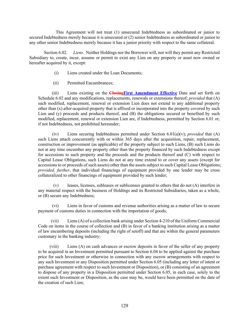 129 This Agreement will not treat (1) unsecured Indebtedness as subordinated or junior to secured Indebtedness merely because it is unsecured or (2) senior Indebtedness as subordinated or junior to any other senior Indebtedness merely because it has a junior priority with respect to the same collateral. Section 6.02. Liens. Neither Holdings nor the Borrower will, nor will they permit any Restricted Subsidiary to, create, incur, assume or permit to exist any Lien on any property or asset now owned or hereafter acquired by it, except: (i) Liens created under the Loan Documents; (ii) Permitted Encumbrances; (iii) Liens existing on the ClosingFirst Amendment Effective Date and set forth on Schedule 6.02 and any modifications, replacements, renewals or extensions thereof; provided that (A) such modified, replacement, renewal or extension Lien does not extend to any additional property other than (x) after-acquired property that is affixed or incorporated into the property covered by such Lien and (y) proceeds and products thereof, and (B) the obligations secured or benefited by such modified, replacement, renewal or extension Lien are, if Indebtedness, permitted by Section 6.01 or, if not Indebtedness, not prohibited hereunder; (iv) Liens securing Indebtedness permitted under Section 6.01(a)(v); provided that (A) such Liens attach concurrently with or within 365 days after the acquisition, repair, replacement, construction or improvement (as applicable) of the property subject to such Liens, (B) such Liens do not at any time encumber any property other than the property financed by such Indebtedness except for accessions to such property and the proceeds and the products thereof and (C) with respect to Capital Lease Obligations, such Liens do not at any time extend to or cover any assets (except for accessions to or proceeds of such assets) other than the assets subject to such Capital Lease Obligations; provided, further, that individual financings of equipment provided by one lender may be cross collateralized to other financings of equipment provided by such lender; (v) leases, licenses, subleases or sublicenses granted to others that do not (A) interfere in any material respect with the business of Holdings and its Restricted Subsidiaries, taken as a whole, or (B) secure any Indebtedness; (vi) Liens in favor of customs and revenue authorities arising as a matter of law to secure payment of customs duties in connection with the importation of goods; (vii) Liens (A) of a collection bank arising under Section 4-210 of the Uniform Commercial Code on items in the course of collection and (B) in favor of a banking institution arising as a matter of law encumbering deposits (including the right of setoff) and that are within the general parameters customary in the banking industry; (viii) Liens (A) on cash advances or escrow deposits in favor of the seller of any property to be acquired in an Investment permitted pursuant to Section 6.04 to be applied against the purchase price for such Investment or otherwise in connection with any escrow arrangements with respect to any such Investment or any Disposition permitted under Section 6.05 (including any letter of intent or purchase agreement with respect to such Investment or Disposition), or (B) consisting of an agreement to dispose of any property in a Disposition permitted under Section 6.05, in each case, solely to the extent such Investment or Disposition, as the case may be, would have been permitted on the date of the creation of such Lien;
