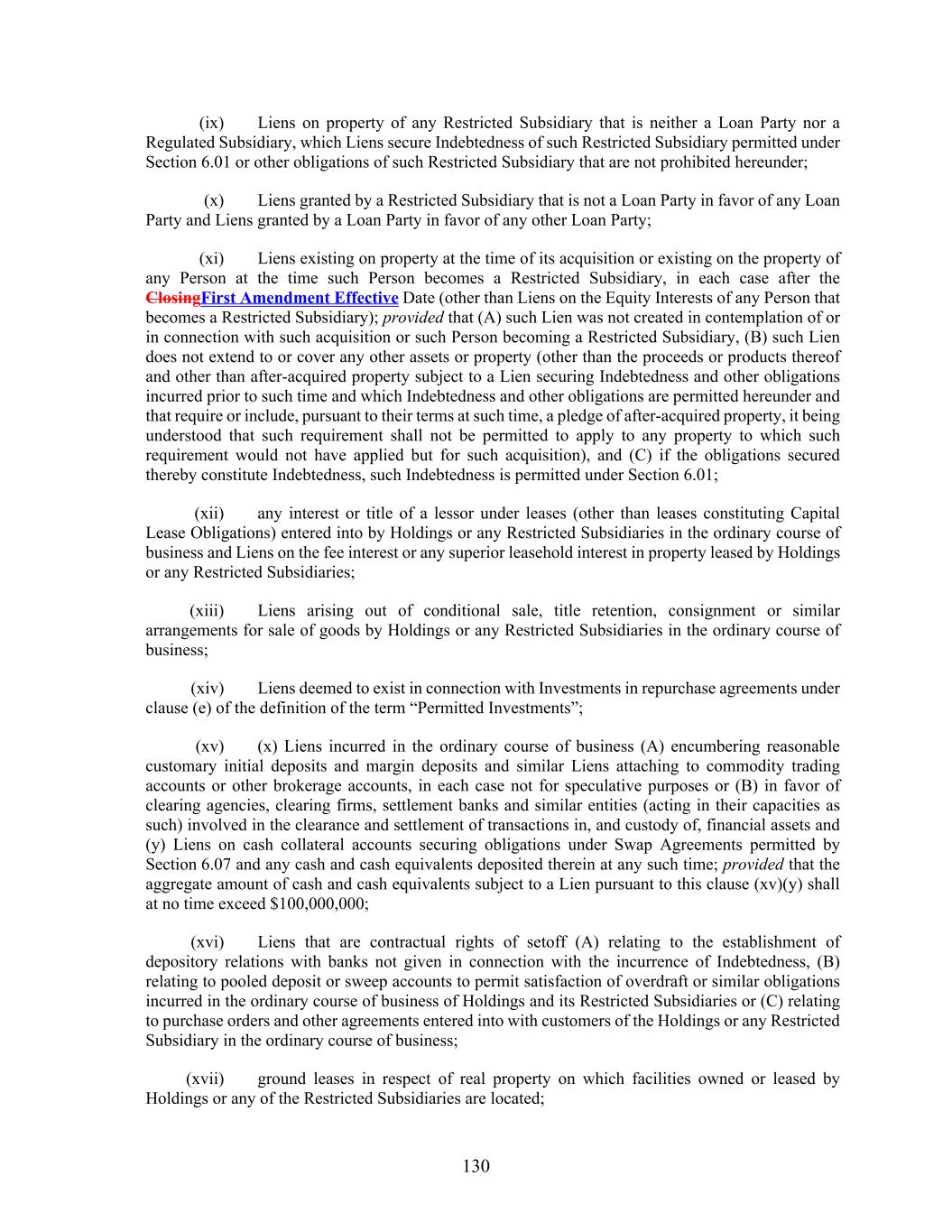 130 (ix) Liens on property of any Restricted Subsidiary that is neither a Loan Party nor a Regulated Subsidiary, which Liens secure Indebtedness of such Restricted Subsidiary permitted under Section 6.01 or other obligations of such Restricted Subsidiary that are not prohibited hereunder; (x) Liens granted by a Restricted Subsidiary that is not a Loan Party in favor of any Loan Party and Liens granted by a Loan Party in favor of any other Loan Party; (xi) Liens existing on property at the time of its acquisition or existing on the property of any Person at the time such Person becomes a Restricted Subsidiary, in each case after the ClosingFirst Amendment Effective Date (other than Liens on the Equity Interests of any Person that becomes a Restricted Subsidiary); provided that (A) such Lien was not created in contemplation of or in connection with such acquisition or such Person becoming a Restricted Subsidiary, (B) such Lien does not extend to or cover any other assets or property (other than the proceeds or products thereof and other than after-acquired property subject to a Lien securing Indebtedness and other obligations incurred prior to such time and which Indebtedness and other obligations are permitted hereunder and that require or include, pursuant to their terms at such time, a pledge of after-acquired property, it being understood that such requirement shall not be permitted to apply to any property to which such requirement would not have applied but for such acquisition), and (C) if the obligations secured thereby constitute Indebtedness, such Indebtedness is permitted under Section 6.01; (xii) any interest or title of a lessor under leases (other than leases constituting Capital Lease Obligations) entered into by Holdings or any Restricted Subsidiaries in the ordinary course of business and Liens on the fee interest or any superior leasehold interest in property leased by Holdings or any Restricted Subsidiaries; (xiii) Liens arising out of conditional sale, title retention, consignment or similar arrangements for sale of goods by Holdings or any Restricted Subsidiaries in the ordinary course of business; (xiv) Liens deemed to exist in connection with Investments in repurchase agreements under clause (e) of the definition of the term “Permitted Investments”; (xv) (x) Liens incurred in the ordinary course of business (A) encumbering reasonable customary initial deposits and margin deposits and similar Liens attaching to commodity trading accounts or other brokerage accounts, in each case not for speculative purposes or (B) in favor of clearing agencies, clearing firms, settlement banks and similar entities (acting in their capacities as such) involved in the clearance and settlement of transactions in, and custody of, financial assets and (y) Liens on cash collateral accounts securing obligations under Swap Agreements permitted by Section 6.07 and any cash and cash equivalents deposited therein at any such time; provided that the aggregate amount of cash and cash equivalents subject to a Lien pursuant to this clause (xv)(y) shall at no time exceed $100,000,000; (xvi) Liens that are contractual rights of setoff (A) relating to the establishment of depository relations with banks not given in connection with the incurrence of Indebtedness, (B) relating to pooled deposit or sweep accounts to permit satisfaction of overdraft or similar obligations incurred in the ordinary course of business of Holdings and its Restricted Subsidiaries or (C) relating to purchase orders and other agreements entered into with customers of the Holdings or any Restricted Subsidiary in the ordinary course of business; (xvii) ground leases in respect of real property on which facilities owned or leased by Holdings or any of the Restricted Subsidiaries are located;