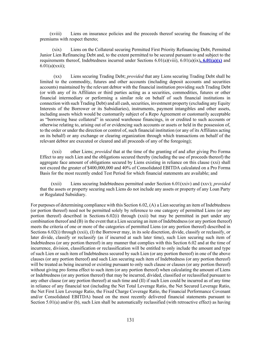 131 (xviii) Liens on insurance policies and the proceeds thereof securing the financing of the premiums with respect thereto; (xix) Liens on the Collateral securing Permitted First Priority Refinancing Debt, Permitted Junior Lien Refinancing Debt and, to the extent permitted to be secured pursuant to and subject to the requirements thereof, Indebtedness incurred under Sections 6.01(a)(viii), 6.01(a)(ix), 6.01(a)(x) and 6.01(a)(xxii); (xx) Liens securing Trading Debt; provided that any Liens securing Trading Debt shall be limited to the commodity, futures and other accounts (including deposit accounts and securities accounts) maintained by the relevant debtor with the financial institution providing such Trading Debt (or with any of its Affiliates or third parties acting as a securities, commodities, futures or other financial intermediary or performing a similar role on behalf of such financial institutions in connection with such Trading Debt) and all cash, securities, investment property (excluding any Equity Interests of the Borrower or its Subsidiaries), instruments, payment intangibles and other assets, including assets which would be customarily subject of a Repo Agreement or customarily acceptable as “borrowing base collateral” in secured warehouse financings, in or credited to such accounts or otherwise relating to, arising out of or evidencing such accounts or assets or held in the possession of, to the order or under the direction or control of, such financial institution (or any of its Affiliates acting on its behalf) or any exchange or clearing organization through which transactions on behalf of the relevant debtor are executed or cleared and all proceeds of any of the foregoing); (xxi) other Liens; provided that at the time of the granting of and after giving Pro Forma Effect to any such Lien and the obligations secured thereby (including the use of proceeds thereof) the aggregate face amount of obligations secured by Liens existing in reliance on this clause (xxi) shall not exceed the greater of $400,000,000 and 40% of Consolidated EBITDA calculated on a Pro Forma Basis for the most recently ended Test Period for which financial statements are available; and (xxii) Liens securing Indebtedness permitted under Section 6.01(xxiv) and (xxv); provided that the assets or property securing such Liens do not include any assets or property of any Loan Party or Regulated Subsidiary. For purposes of determining compliance with this Section 6.02, (A) a Lien securing an item of Indebtedness (or portion thereof) need not be permitted solely by reference to one category of permitted Liens (or any portion thereof) described in Sections 6.02(i) through (xxii) but may be permitted in part under any combination thereof and (B) in the event that a Lien securing an item of Indebtedness (or any portion thereof) meets the criteria of one or more of the categories of permitted Liens (or any portion thereof) described in Sections 6.02(i) through (xxii), (I) the Borrower may, in its sole discretion, divide, classify or reclassify, or later divide, classify or reclassify (as if incurred at such later time), such Lien securing such item of Indebtedness (or any portion thereof) in any manner that complies with this Section 6.02 and at the time of incurrence, division, classification or reclassification will be entitled to only include the amount and type of such Lien or such item of Indebtedness secured by such Lien (or any portion thereof) in one of the above clauses (or any portion thereof) and such Lien securing such item of Indebtedness (or any portion thereof) will be treated as being incurred or existing pursuant to only such clause or clauses (or any portion thereof) without giving pro forma effect to such item (or any portion thereof) when calculating the amount of Liens or Indebtedness (or any portion thereof) that may be incurred, divided, classified or reclassified pursuant to any other clause (or any portion thereof) at such time and (II) if such Lien could be incurred as of any time in reliance of any financial test (including the Net Total Leverage Ratio, the Net Secured Leverage Ratio, the Net First Lien Leverage Ratio, the Fixed Charge Coverage Ratio, the Financial Performance Covenant and/or Consolidated EBITDA) based on the most recently delivered financial statements pursuant to Section 5.01(a) and/or (b), such Lien shall be automatically reclassified (with retroactive effect) as having