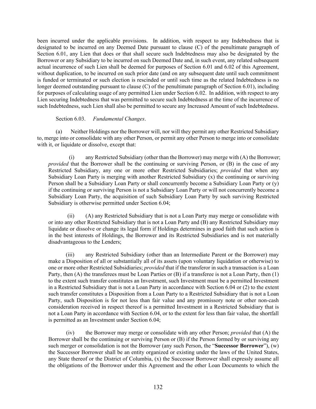 132 been incurred under the applicable provisions. In addition, with respect to any Indebtedness that is designated to be incurred on any Deemed Date pursuant to clause (C) of the penultimate paragraph of Section 6.01, any Lien that does or that shall secure such Indebtedness may also be designated by the Borrower or any Subsidiary to be incurred on such Deemed Date and, in such event, any related subsequent actual incurrence of such Lien shall be deemed for purposes of Section 6.01 and 6.02 of this Agreement, without duplication, to be incurred on such prior date (and on any subsequent date until such commitment is funded or terminated or such election is rescinded or until such time as the related Indebtedness is no longer deemed outstanding pursuant to clause (C) of the penultimate paragraph of Section 6.01), including for purposes of calculating usage of any permitted Lien under Section 6.02. In addition, with respect to any Lien securing Indebtedness that was permitted to secure such Indebtedness at the time of the incurrence of such Indebtedness, such Lien shall also be permitted to secure any Increased Amount of such Indebtedness. Section 6.03. Fundamental Changes. (a) Neither Holdings nor the Borrower will, nor will they permit any other Restricted Subsidiary to, merge into or consolidate with any other Person, or permit any other Person to merge into or consolidate with it, or liquidate or dissolve, except that: (i) any Restricted Subsidiary (other than the Borrower) may merge with (A) the Borrower; provided that the Borrower shall be the continuing or surviving Person, or (B) in the case of any Restricted Subsidiary, any one or more other Restricted Subsidiaries; provided that when any Subsidiary Loan Party is merging with another Restricted Subsidiary (x) the continuing or surviving Person shall be a Subsidiary Loan Party or shall concurrently become a Subsidiary Loan Party or (y) if the continuing or surviving Person is not a Subsidiary Loan Party or will not concurrently become a Subsidiary Loan Party, the acquisition of such Subsidiary Loan Party by such surviving Restricted Subsidiary is otherwise permitted under Section 6.04; (ii) (A) any Restricted Subsidiary that is not a Loan Party may merge or consolidate with or into any other Restricted Subsidiary that is not a Loan Party and (B) any Restricted Subsidiary may liquidate or dissolve or change its legal form if Holdings determines in good faith that such action is in the best interests of Holdings, the Borrower and its Restricted Subsidiaries and is not materially disadvantageous to the Lenders; (iii) any Restricted Subsidiary (other than an Intermediate Parent or the Borrower) may make a Disposition of all or substantially all of its assets (upon voluntary liquidation or otherwise) to one or more other Restricted Subsidiaries; provided that if the transferor in such a transaction is a Loan Party, then (A) the transferees must be Loan Parties or (B) if a transferee is not a Loan Party, then (1) to the extent such transfer constitutes an Investment, such Investment must be a permitted Investment in a Restricted Subsidiary that is not a Loan Party in accordance with Section 6.04 or (2) to the extent such transfer constitutes a Disposition from a Loan Party to a Restricted Subsidiary that is not a Loan Party, such Disposition is for not less than fair value and any promissory note or other non-cash consideration received in respect thereof is a permitted Investment in a Restricted Subsidiary that is not a Loan Party in accordance with Section 6.04, or to the extent for less than fair value, the shortfall is permitted as an Investment under Section 6.04; (iv) the Borrower may merge or consolidate with any other Person; provided that (A) the Borrower shall be the continuing or surviving Person or (B) if the Person formed by or surviving any such merger or consolidation is not the Borrower (any such Person, the “Successor Borrower”), (w) the Successor Borrower shall be an entity organized or existing under the laws of the United States, any State thereof or the District of Columbia, (x) the Successor Borrower shall expressly assume all the obligations of the Borrower under this Agreement and the other Loan Documents to which the