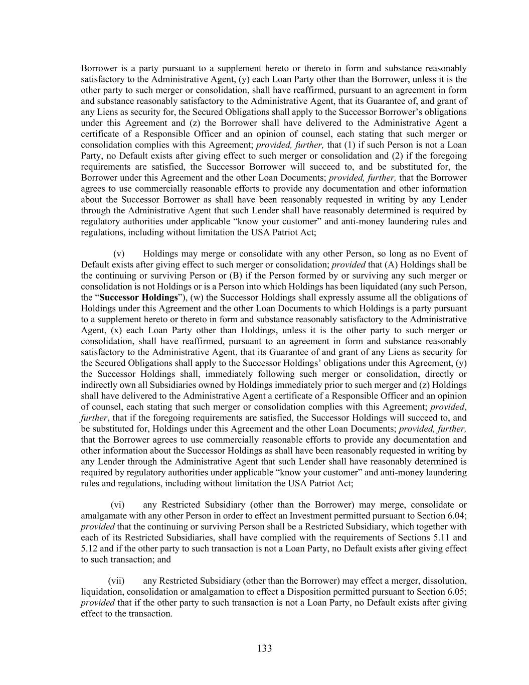 133 Borrower is a party pursuant to a supplement hereto or thereto in form and substance reasonably satisfactory to the Administrative Agent, (y) each Loan Party other than the Borrower, unless it is the other party to such merger or consolidation, shall have reaffirmed, pursuant to an agreement in form and substance reasonably satisfactory to the Administrative Agent, that its Guarantee of, and grant of any Liens as security for, the Secured Obligations shall apply to the Successor Borrower’s obligations under this Agreement and (z) the Borrower shall have delivered to the Administrative Agent a certificate of a Responsible Officer and an opinion of counsel, each stating that such merger or consolidation complies with this Agreement; provided, further, that (1) if such Person is not a Loan Party, no Default exists after giving effect to such merger or consolidation and (2) if the foregoing requirements are satisfied, the Successor Borrower will succeed to, and be substituted for, the Borrower under this Agreement and the other Loan Documents; provided, further, that the Borrower agrees to use commercially reasonable efforts to provide any documentation and other information about the Successor Borrower as shall have been reasonably requested in writing by any Lender through the Administrative Agent that such Lender shall have reasonably determined is required by regulatory authorities under applicable “know your customer” and anti-money laundering rules and regulations, including without limitation the USA Patriot Act; (v) Holdings may merge or consolidate with any other Person, so long as no Event of Default exists after giving effect to such merger or consolidation; provided that (A) Holdings shall be the continuing or surviving Person or (B) if the Person formed by or surviving any such merger or consolidation is not Holdings or is a Person into which Holdings has been liquidated (any such Person, the “Successor Holdings”), (w) the Successor Holdings shall expressly assume all the obligations of Holdings under this Agreement and the other Loan Documents to which Holdings is a party pursuant to a supplement hereto or thereto in form and substance reasonably satisfactory to the Administrative Agent, (x) each Loan Party other than Holdings, unless it is the other party to such merger or consolidation, shall have reaffirmed, pursuant to an agreement in form and substance reasonably satisfactory to the Administrative Agent, that its Guarantee of and grant of any Liens as security for the Secured Obligations shall apply to the Successor Holdings’ obligations under this Agreement, (y) the Successor Holdings shall, immediately following such merger or consolidation, directly or indirectly own all Subsidiaries owned by Holdings immediately prior to such merger and (z) Holdings shall have delivered to the Administrative Agent a certificate of a Responsible Officer and an opinion of counsel, each stating that such merger or consolidation complies with this Agreement; provided, further, that if the foregoing requirements are satisfied, the Successor Holdings will succeed to, and be substituted for, Holdings under this Agreement and the other Loan Documents; provided, further, that the Borrower agrees to use commercially reasonable efforts to provide any documentation and other information about the Successor Holdings as shall have been reasonably requested in writing by any Lender through the Administrative Agent that such Lender shall have reasonably determined is required by regulatory authorities under applicable “know your customer” and anti-money laundering rules and regulations, including without limitation the USA Patriot Act; (vi) any Restricted Subsidiary (other than the Borrower) may merge, consolidate or amalgamate with any other Person in order to effect an Investment permitted pursuant to Section 6.04; provided that the continuing or surviving Person shall be a Restricted Subsidiary, which together with each of its Restricted Subsidiaries, shall have complied with the requirements of Sections 5.11 and 5.12 and if the other party to such transaction is not a Loan Party, no Default exists after giving effect to such transaction; and (vii) any Restricted Subsidiary (other than the Borrower) may effect a merger, dissolution, liquidation, consolidation or amalgamation to effect a Disposition permitted pursuant to Section 6.05; provided that if the other party to such transaction is not a Loan Party, no Default exists after giving effect to the transaction.