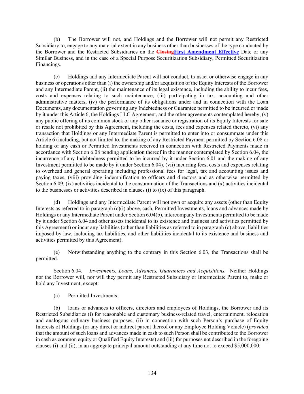 134 (b) The Borrower will not, and Holdings and the Borrower will not permit any Restricted Subsidiary to, engage to any material extent in any business other than businesses of the type conducted by the Borrower and the Restricted Subsidiaries on the ClosingFirst Amendment Effective Date or any Similar Business, and in the case of a Special Purpose Securitization Subsidiary, Permitted Securitization Financings. (c) Holdings and any Intermediate Parent will not conduct, transact or otherwise engage in any business or operations other than (i) the ownership and/or acquisition of the Equity Interests of the Borrower and any Intermediate Parent, (ii) the maintenance of its legal existence, including the ability to incur fees, costs and expenses relating to such maintenance, (iii) participating in tax, accounting and other administrative matters, (iv) the performance of its obligations under and in connection with the Loan Documents, any documentation governing any Indebtedness or Guarantee permitted to be incurred or made by it under this Article 6, the Holdings LLC Agreement, and the other agreements contemplated hereby, (v) any public offering of its common stock or any other issuance or registration of its Equity Interests for sale or resale not prohibited by this Agreement, including the costs, fees and expenses related thereto, (vi) any transaction that Holdings or any Intermediate Parent is permitted to enter into or consummate under this Article 6 (including, but not limited to, the making of any Restricted Payment permitted by Section 6.08 or holding of any cash or Permitted Investments received in connection with Restricted Payments made in accordance with Section 6.08 pending application thereof in the manner contemplated by Section 6.04, the incurrence of any Indebtedness permitted to be incurred by it under Section 6.01 and the making of any Investment permitted to be made by it under Section 6.04), (vii) incurring fees, costs and expenses relating to overhead and general operating including professional fees for legal, tax and accounting issues and paying taxes, (viii) providing indemnification to officers and directors and as otherwise permitted by Section 6.09, (ix) activities incidental to the consummation of the Transactions and (x) activities incidental to the businesses or activities described in clauses (i) to (ix) of this paragraph. (d) Holdings and any Intermediate Parent will not own or acquire any assets (other than Equity Interests as referred to in paragraph (c)(i) above, cash, Permitted Investments, loans and advances made by Holdings or any Intermediate Parent under Section 6.04(b), intercompany Investments permitted to be made by it under Section 6.04 and other assets incidental to its existence and business and activities permitted by this Agreement) or incur any liabilities (other than liabilities as referred to in paragraph (c) above, liabilities imposed by law, including tax liabilities, and other liabilities incidental to its existence and business and activities permitted by this Agreement). (e) Notwithstanding anything to the contrary in this Section 6.03, the Transactions shall be permitted. Section 6.04. Investments, Loans, Advances, Guarantees and Acquisitions. Neither Holdings nor the Borrower will, nor will they permit any Restricted Subsidiary or Intermediate Parent to, make or hold any Investment, except: (a) Permitted Investments; (b) loans or advances to officers, directors and employees of Holdings, the Borrower and its Restricted Subsidiaries (i) for reasonable and customary business-related travel, entertainment, relocation and analogous ordinary business purposes, (ii) in connection with such Person’s purchase of Equity Interests of Holdings (or any direct or indirect parent thereof or any Employee Holding Vehicle) (provided that the amount of such loans and advances made in cash to such Person shall be contributed to the Borrower in cash as common equity or Qualified Equity Interests) and (iii) for purposes not described in the foregoing clauses (i) and (ii), in an aggregate principal amount outstanding at any time not to exceed $5,000,000;