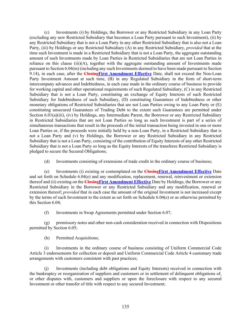 135 (c) Investments (i) by Holdings, the Borrower or any Restricted Subsidiary in any Loan Party (excluding any new Restricted Subsidiary that becomes a Loan Party pursuant to such Investment), (ii) by any Restricted Subsidiary that is not a Loan Party in any other Restricted Subsidiary that is also not a Loan Party, (iii) by Holdings or any Restricted Subsidiary (A) in any Restricted Subsidiary, provided that at the time such Investment is made in a Restricted Subsidiary that is not a Loan Party, the aggregate outstanding amount of such Investments made by Loan Parties in Restricted Subsidiaries that are not Loan Parties in reliance on this clause (iii)(A), together with the aggregate outstanding amount of Investments made pursuant to Section 6.04(m) (including any such Investments deemed to have been made pursuant to Section 9.14), in each case, after the ClosingFirst Amendment Effective Date, shall not exceed the Non-Loan Party Investment Amount at such time, (B) in any Regulated Subsidiary in the form of short-term intercompany advances and Indebtedness, in each case made in the ordinary course of business to provide for working capital and other operational requirements of such Regulated Subsidiary, (C) in any Restricted Subsidiary that is not a Loan Party, constituting an exchange of Equity Interests of such Restricted Subsidiary for Indebtedness of such Subsidiary, (D) constituting Guarantees of Indebtedness or other monetary obligations of Restricted Subsidiaries that are not Loan Parties owing to any Loan Party or (E) constituting unsecured Guarantees of Trading Debt to the extent such Guarantees are permitted under Section 6.01(a)(iii), (iv) by Holdings, any Intermediate Parent, the Borrower or any Restricted Subsidiary in Restricted Subsidiaries that are not Loan Parties so long as such Investment is part of a series of simultaneous transactions that result in the proceeds of the initial transaction being invested in one or more Loan Parties or, if the proceeds were initially held by a non-Loan Party, in a Restricted Subsidiary that is not a Loan Party and (v) by Holdings, the Borrower or any Restricted Subsidiary in any Restricted Subsidiary that is not a Loan Party, consisting of the contribution of Equity Interests of any other Restricted Subsidiary that is not a Loan Party so long as the Equity Interests of the transferee Restricted Subsidiary is pledged to secure the Secured Obligations; (d) Investments consisting of extensions of trade credit in the ordinary course of business; (e) Investments (i) existing or contemplated on the ClosingFirst Amendment Effective Date and set forth on Schedule 6.04(e) and any modification, replacement, renewal, reinvestment or extension thereof and (ii) existing on the ClosingFirst Amendment Effective Date by Holdings, the Borrower or any Restricted Subsidiary in the Borrower or any Restricted Subsidiary and any modification, renewal or extension thereof; provided that in each case the amount of the original Investment is not increased except by the terms of such Investment to the extent as set forth on Schedule 6.04(e) or as otherwise permitted by this Section 6.04; (f) Investments in Swap Agreements permitted under Section 6.07; (g) promissory notes and other non-cash consideration received in connection with Dispositions permitted by Section 6.05; (h) Permitted Acquisitions; (i) Investments in the ordinary course of business consisting of Uniform Commercial Code Article 3 endorsements for collection or deposit and Uniform Commercial Code Article 4 customary trade arrangements with customers consistent with past practices; (j) Investments (including debt obligations and Equity Interests) received in connection with the bankruptcy or reorganization of suppliers and customers or in settlement of delinquent obligations of, or other disputes with, customers and suppliers or upon the foreclosure with respect to any secured Investment or other transfer of title with respect to any secured Investment;