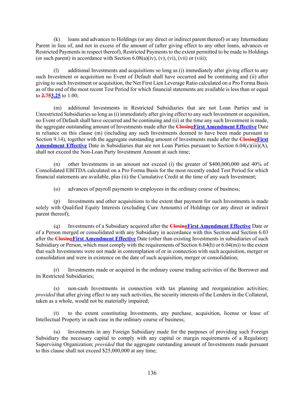 136 (k) loans and advances to Holdings (or any direct or indirect parent thereof) or any Intermediate Parent in lieu of, and not in excess of the amount of (after giving effect to any other loans, advances or Restricted Payments in respect thereof), Restricted Payments to the extent permitted to be made to Holdings (or such parent) in accordance with Section 6.08(a)(iv), (v), (vi), (vii) or (viii); (l) additional Investments and acquisitions so long as (i) immediately after giving effect to any such Investment or acquisition no Event of Default shall have occurred and be continuing and (ii) after giving to such Investment or acquisition, the Net First Lien Leverage Ratio calculated on a Pro Forma Basis as of the end of the most recent Test Period for which financial statements are available is less than or equal to 2.753.25 to 1.00; (m) additional Investments in Restricted Subsidiaries that are not Loan Parties and in Unrestricted Subsidiaries so long as (i) immediately after giving effect to any such Investment or acquisition, no Event of Default shall have occurred and be continuing and (ii) at the time any such Investment is made, the aggregate outstanding amount of Investments made after the ClosingFirst Amendment Effective Date in reliance on this clause (m) (including any such Investments deemed to have been made pursuant to Section 9.14), together with the aggregate outstanding amount of Investments made after the ClosingFirst Amendment Effective Date in Subsidiaries that are not Loan Parties pursuant to Section 6.04(c)(iii)(A), shall not exceed the Non-Loan Party Investment Amount at such time; (n) other Investments in an amount not exceed (i) the greater of $400,000,000 and 40% of Consolidated EBITDA calculated on a Pro Forma Basis for the most recently ended Test Period for which financial statements are available, plus (ii) the Cumulative Credit at the time of any such Investment; (o) advances of payroll payments to employees in the ordinary course of business; (p) Investments and other acquisitions to the extent that payment for such Investments is made solely with Qualified Equity Interests (excluding Cure Amounts) of Holdings (or any direct or indirect parent thereof); (q) Investments of a Subsidiary acquired after the ClosingFirst Amendment Effective Date or of a Person merged or consolidated with any Subsidiary in accordance with this Section and Section 6.03 after the ClosingFirst Amendment Effective Date (other than existing Investments in subsidiaries of such Subsidiary or Person, which must comply with the requirements of Section 6.04(h) or 6.04(m)) to the extent that such Investments were not made in contemplation of or in connection with such acquisition, merger or consolidation and were in existence on the date of such acquisition, merger or consolidation; (r) Investments made or acquired in the ordinary course trading activities of the Borrower and its Restricted Subsidiaries; (s) non-cash Investments in connection with tax planning and reorganization activities; provided that after giving effect to any such activities, the security interests of the Lenders in the Collateral, taken as a whole, would not be materially impaired; (t) to the extent constituting Investments, any purchase, acquisition, license or lease of Intellectual Property in each case in the ordinary course of business; (u) Investments in any Foreign Subsidiary made for the purposes of providing such Foreign Subsidiary the necessary capital to comply with any capital or margin requirements of a Regulatory Supervising Organization; provided that the aggregate outstanding amount of Investments made pursuant to this clause shall not exceed $25,000,000 at any time;