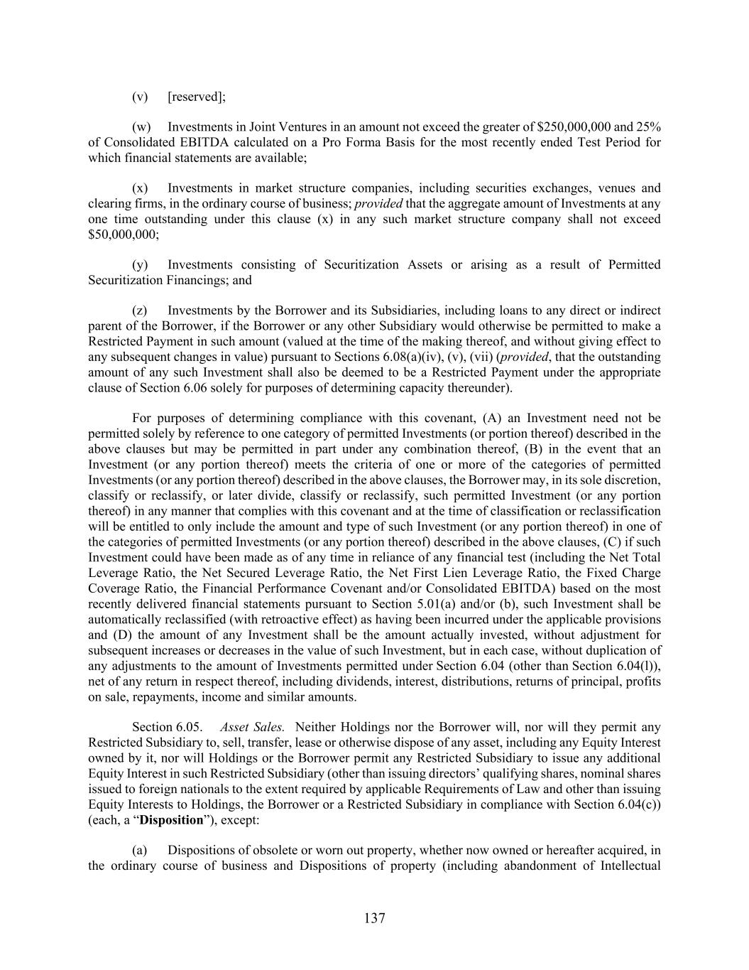 137 (v) [reserved]; (w) Investments in Joint Ventures in an amount not exceed the greater of $250,000,000 and 25% of Consolidated EBITDA calculated on a Pro Forma Basis for the most recently ended Test Period for which financial statements are available; (x) Investments in market structure companies, including securities exchanges, venues and clearing firms, in the ordinary course of business; provided that the aggregate amount of Investments at any one time outstanding under this clause (x) in any such market structure company shall not exceed $50,000,000; (y) Investments consisting of Securitization Assets or arising as a result of Permitted Securitization Financings; and (z) Investments by the Borrower and its Subsidiaries, including loans to any direct or indirect parent of the Borrower, if the Borrower or any other Subsidiary would otherwise be permitted to make a Restricted Payment in such amount (valued at the time of the making thereof, and without giving effect to any subsequent changes in value) pursuant to Sections 6.08(a)(iv), (v), (vii) (provided, that the outstanding amount of any such Investment shall also be deemed to be a Restricted Payment under the appropriate clause of Section 6.06 solely for purposes of determining capacity thereunder). For purposes of determining compliance with this covenant, (A) an Investment need not be permitted solely by reference to one category of permitted Investments (or portion thereof) described in the above clauses but may be permitted in part under any combination thereof, (B) in the event that an Investment (or any portion thereof) meets the criteria of one or more of the categories of permitted Investments (or any portion thereof) described in the above clauses, the Borrower may, in its sole discretion, classify or reclassify, or later divide, classify or reclassify, such permitted Investment (or any portion thereof) in any manner that complies with this covenant and at the time of classification or reclassification will be entitled to only include the amount and type of such Investment (or any portion thereof) in one of the categories of permitted Investments (or any portion thereof) described in the above clauses, (C) if such Investment could have been made as of any time in reliance of any financial test (including the Net Total Leverage Ratio, the Net Secured Leverage Ratio, the Net First Lien Leverage Ratio, the Fixed Charge Coverage Ratio, the Financial Performance Covenant and/or Consolidated EBITDA) based on the most recently delivered financial statements pursuant to Section 5.01(a) and/or (b), such Investment shall be automatically reclassified (with retroactive effect) as having been incurred under the applicable provisions and (D) the amount of any Investment shall be the amount actually invested, without adjustment for subsequent increases or decreases in the value of such Investment, but in each case, without duplication of any adjustments to the amount of Investments permitted under Section 6.04 (other than Section 6.04(l)), net of any return in respect thereof, including dividends, interest, distributions, returns of principal, profits on sale, repayments, income and similar amounts. Section 6.05. Asset Sales. Neither Holdings nor the Borrower will, nor will they permit any Restricted Subsidiary to, sell, transfer, lease or otherwise dispose of any asset, including any Equity Interest owned by it, nor will Holdings or the Borrower permit any Restricted Subsidiary to issue any additional Equity Interest in such Restricted Subsidiary (other than issuing directors’ qualifying shares, nominal shares issued to foreign nationals to the extent required by applicable Requirements of Law and other than issuing Equity Interests to Holdings, the Borrower or a Restricted Subsidiary in compliance with Section 6.04(c)) (each, a “Disposition”), except: (a) Dispositions of obsolete or worn out property, whether now owned or hereafter acquired, in the ordinary course of business and Dispositions of property (including abandonment of Intellectual
