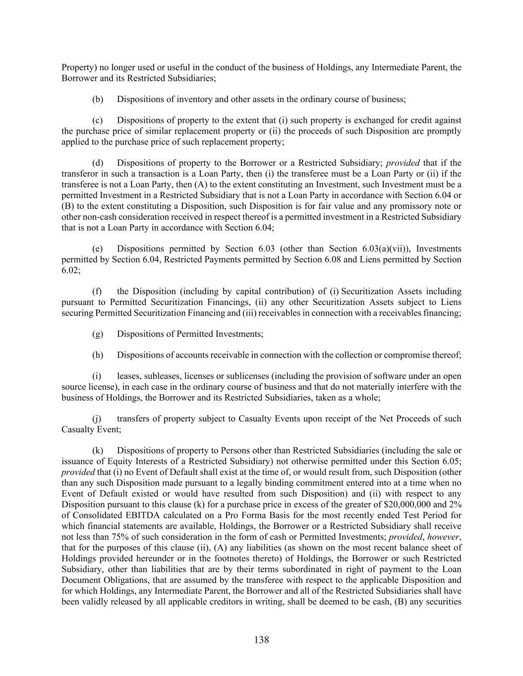 138 Property) no longer used or useful in the conduct of the business of Holdings, any Intermediate Parent, the Borrower and its Restricted Subsidiaries; (b) Dispositions of inventory and other assets in the ordinary course of business; (c) Dispositions of property to the extent that (i) such property is exchanged for credit against the purchase price of similar replacement property or (ii) the proceeds of such Disposition are promptly applied to the purchase price of such replacement property; (d) Dispositions of property to the Borrower or a Restricted Subsidiary; provided that if the transferor in such a transaction is a Loan Party, then (i) the transferee must be a Loan Party or (ii) if the transferee is not a Loan Party, then (A) to the extent constituting an Investment, such Investment must be a permitted Investment in a Restricted Subsidiary that is not a Loan Party in accordance with Section 6.04 or (B) to the extent constituting a Disposition, such Disposition is for fair value and any promissory note or other non-cash consideration received in respect thereof is a permitted investment in a Restricted Subsidiary that is not a Loan Party in accordance with Section 6.04; (e) Dispositions permitted by Section 6.03 (other than Section 6.03(a)(vii)), Investments permitted by Section 6.04, Restricted Payments permitted by Section 6.08 and Liens permitted by Section 6.02; (f) the Disposition (including by capital contribution) of (i) Securitization Assets including pursuant to Permitted Securitization Financings, (ii) any other Securitization Assets subject to Liens securing Permitted Securitization Financing and (iii) receivables in connection with a receivables financing; (g) Dispositions of Permitted Investments; (h) Dispositions of accounts receivable in connection with the collection or compromise thereof; (i) leases, subleases, licenses or sublicenses (including the provision of software under an open source license), in each case in the ordinary course of business and that do not materially interfere with the business of Holdings, the Borrower and its Restricted Subsidiaries, taken as a whole; (j) transfers of property subject to Casualty Events upon receipt of the Net Proceeds of such Casualty Event; (k) Dispositions of property to Persons other than Restricted Subsidiaries (including the sale or issuance of Equity Interests of a Restricted Subsidiary) not otherwise permitted under this Section 6.05; provided that (i) no Event of Default shall exist at the time of, or would result from, such Disposition (other than any such Disposition made pursuant to a legally binding commitment entered into at a time when no Event of Default existed or would have resulted from such Disposition) and (ii) with respect to any Disposition pursuant to this clause (k) for a purchase price in excess of the greater of $20,000,000 and 2% of Consolidated EBITDA calculated on a Pro Forma Basis for the most recently ended Test Period for which financial statements are available, Holdings, the Borrower or a Restricted Subsidiary shall receive not less than 75% of such consideration in the form of cash or Permitted Investments; provided, however, that for the purposes of this clause (ii), (A) any liabilities (as shown on the most recent balance sheet of Holdings provided hereunder or in the footnotes thereto) of Holdings, the Borrower or such Restricted Subsidiary, other than liabilities that are by their terms subordinated in right of payment to the Loan Document Obligations, that are assumed by the transferee with respect to the applicable Disposition and for which Holdings, any Intermediate Parent, the Borrower and all of the Restricted Subsidiaries shall have been validly released by all applicable creditors in writing, shall be deemed to be cash, (B) any securities
