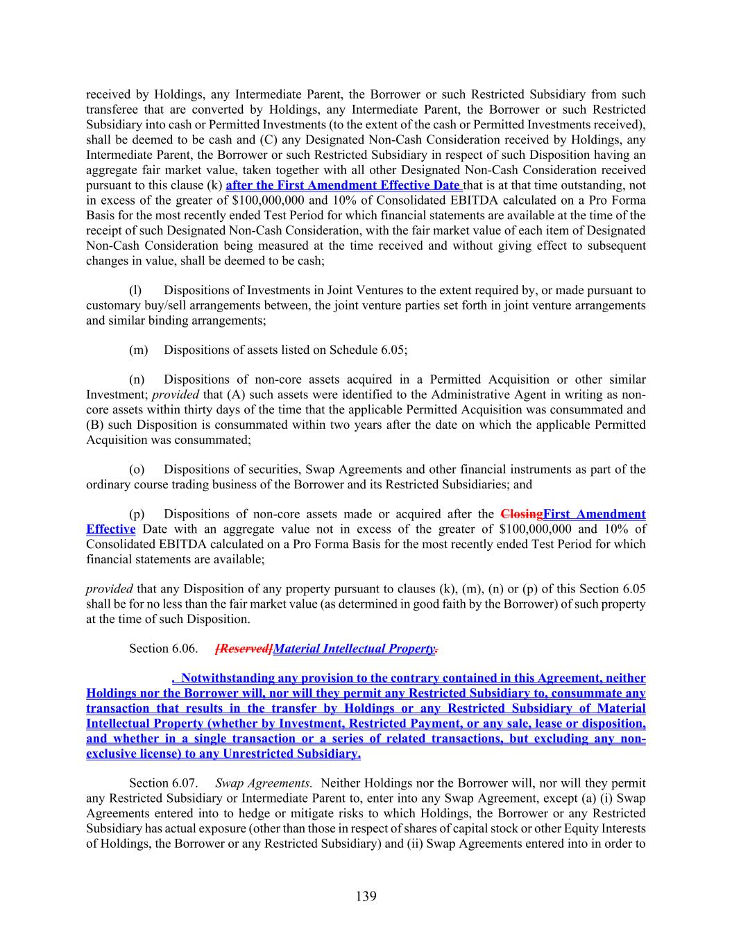 139 received by Holdings, any Intermediate Parent, the Borrower or such Restricted Subsidiary from such transferee that are converted by Holdings, any Intermediate Parent, the Borrower or such Restricted Subsidiary into cash or Permitted Investments (to the extent of the cash or Permitted Investments received), shall be deemed to be cash and (C) any Designated Non-Cash Consideration received by Holdings, any Intermediate Parent, the Borrower or such Restricted Subsidiary in respect of such Disposition having an aggregate fair market value, taken together with all other Designated Non-Cash Consideration received pursuant to this clause (k) after the First Amendment Effective Date that is at that time outstanding, not in excess of the greater of $100,000,000 and 10% of Consolidated EBITDA calculated on a Pro Forma Basis for the most recently ended Test Period for which financial statements are available at the time of the receipt of such Designated Non-Cash Consideration, with the fair market value of each item of Designated Non-Cash Consideration being measured at the time received and without giving effect to subsequent changes in value, shall be deemed to be cash; (l) Dispositions of Investments in Joint Ventures to the extent required by, or made pursuant to customary buy/sell arrangements between, the joint venture parties set forth in joint venture arrangements and similar binding arrangements; (m) Dispositions of assets listed on Schedule 6.05; (n) Dispositions of non-core assets acquired in a Permitted Acquisition or other similar Investment; provided that (A) such assets were identified to the Administrative Agent in writing as non- core assets within thirty days of the time that the applicable Permitted Acquisition was consummated and (B) such Disposition is consummated within two years after the date on which the applicable Permitted Acquisition was consummated; (o) Dispositions of securities, Swap Agreements and other financial instruments as part of the ordinary course trading business of the Borrower and its Restricted Subsidiaries; and (p) Dispositions of non-core assets made or acquired after the ClosingFirst Amendment Effective Date with an aggregate value not in excess of the greater of $100,000,000 and 10% of Consolidated EBITDA calculated on a Pro Forma Basis for the most recently ended Test Period for which financial statements are available; provided that any Disposition of any property pursuant to clauses (k), (m), (n) or (p) of this Section 6.05 shall be for no less than the fair market value (as determined in good faith by the Borrower) of such property at the time of such Disposition. Section 6.06. [Reserved]Material Intellectual Property. . Notwithstanding any provision to the contrary contained in this Agreement, neither Holdings nor the Borrower will, nor will they permit any Restricted Subsidiary to, consummate any transaction that results in the transfer by Holdings or any Restricted Subsidiary of Material Intellectual Property (whether by Investment, Restricted Payment, or any sale, lease or disposition, and whether in a single transaction or a series of related transactions, but excluding any non- exclusive license) to any Unrestricted Subsidiary. Section 6.07. Swap Agreements. Neither Holdings nor the Borrower will, nor will they permit any Restricted Subsidiary or Intermediate Parent to, enter into any Swap Agreement, except (a) (i) Swap Agreements entered into to hedge or mitigate risks to which Holdings, the Borrower or any Restricted Subsidiary has actual exposure (other than those in respect of shares of capital stock or other Equity Interests of Holdings, the Borrower or any Restricted Subsidiary) and (ii) Swap Agreements entered into in order to
