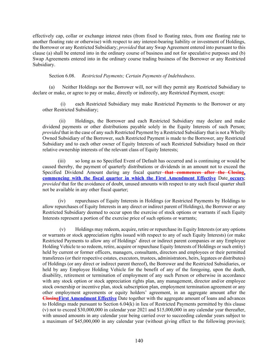 140 effectively cap, collar or exchange interest rates (from fixed to floating rates, from one floating rate to another floating rate or otherwise) with respect to any interest-bearing liability or investment of Holdings, the Borrower or any Restricted Subsidiary; provided that any Swap Agreement entered into pursuant to this clause (a) shall be entered into in the ordinary course of business and not for speculative purposes and (b) Swap Agreements entered into in the ordinary course trading business of the Borrower or any Restricted Subsidiary. Section 6.08. Restricted Payments; Certain Payments of Indebtedness. (a) Neither Holdings nor the Borrower will, nor will they permit any Restricted Subsidiary to declare or make, or agree to pay or make, directly or indirectly, any Restricted Payment, except: (i) each Restricted Subsidiary may make Restricted Payments to the Borrower or any other Restricted Subsidiary; (ii) Holdings, the Borrower and each Restricted Subsidiary may declare and make dividend payments or other distributions payable solely in the Equity Interests of such Person; provided that in the case of any such Restricted Payment by a Restricted Subsidiary that is not a Wholly Owned Subsidiary of the Borrower, such Restricted Payment is made to the Borrower, any Restricted Subsidiary and to each other owner of Equity Interests of such Restricted Subsidiary based on their relative ownership interests of the relevant class of Equity Interests; (iii) so long as no Specified Event of Default has occurred and is continuing or would be caused thereby, the payment of quarterly distributions or dividends in an amount not to exceed the Specified Dividend Amount during any fiscal quarter that commences after the Closing, commencing with the fiscal quarter in which the First Amendment Effective Date occurs; provided that for the avoidance of doubt, unused amounts with respect to any such fiscal quarter shall not be available in any other fiscal quarter; (iv) repurchases of Equity Interests in Holdings (or Restricted Payments by Holdings to allow repurchases of Equity Interests in any direct or indirect parent of Holdings), the Borrower or any Restricted Subsidiary deemed to occur upon the exercise of stock options or warrants if such Equity Interests represent a portion of the exercise price of such options or warrants; (v) Holdings may redeem, acquire, retire or repurchase its Equity Interests (or any options or warrants or stock appreciation rights issued with respect to any of such Equity Interests) (or make Restricted Payments to allow any of Holdings’ direct or indirect parent companies or any Employee Holding Vehicle to so redeem, retire, acquire or repurchase Equity Interests of Holdings or such entity) held by current or former officers, managers, consultants, directors and employees or their permitted transferees (or their respective estates, executors, trustees, administrators, heirs, legatees or distributes) of Holdings (or any direct or indirect parent thereof), the Borrower and the Restricted Subsidiaries, or held by any Employee Holding Vehicle for the benefit of any of the foregoing, upon the death, disability, retirement or termination of employment of any such Person or otherwise in accordance with any stock option or stock appreciation rights plan, any management, director and/or employee stock ownership or incentive plan, stock subscription plan, employment termination agreement or any other employment agreements or equity holders’ agreement, in an aggregate amount after the ClosingFirst Amendment Effective Date together with the aggregate amount of loans and advances to Holdings made pursuant to Section 6.04(k) in lieu of Restricted Payments permitted by this clause (v) not to exceed $30,000,000 in calendar year 2021 and $15,000,000 in any calendar year thereafter, with unused amounts in any calendar year being carried over to succeeding calendar years subject to a maximum of $45,000,000 in any calendar year (without giving effect to the following proviso);