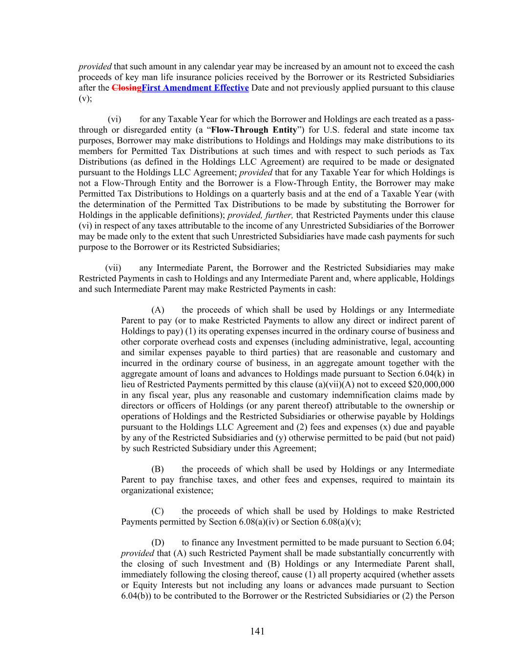 141 provided that such amount in any calendar year may be increased by an amount not to exceed the cash proceeds of key man life insurance policies received by the Borrower or its Restricted Subsidiaries after the ClosingFirst Amendment Effective Date and not previously applied pursuant to this clause (v); (vi) for any Taxable Year for which the Borrower and Holdings are each treated as a pass- through or disregarded entity (a “Flow-Through Entity”) for U.S. federal and state income tax purposes, Borrower may make distributions to Holdings and Holdings may make distributions to its members for Permitted Tax Distributions at such times and with respect to such periods as Tax Distributions (as defined in the Holdings LLC Agreement) are required to be made or designated pursuant to the Holdings LLC Agreement; provided that for any Taxable Year for which Holdings is not a Flow-Through Entity and the Borrower is a Flow-Through Entity, the Borrower may make Permitted Tax Distributions to Holdings on a quarterly basis and at the end of a Taxable Year (with the determination of the Permitted Tax Distributions to be made by substituting the Borrower for Holdings in the applicable definitions); provided, further, that Restricted Payments under this clause (vi) in respect of any taxes attributable to the income of any Unrestricted Subsidiaries of the Borrower may be made only to the extent that such Unrestricted Subsidiaries have made cash payments for such purpose to the Borrower or its Restricted Subsidiaries; (vii) any Intermediate Parent, the Borrower and the Restricted Subsidiaries may make Restricted Payments in cash to Holdings and any Intermediate Parent and, where applicable, Holdings and such Intermediate Parent may make Restricted Payments in cash: (A) the proceeds of which shall be used by Holdings or any Intermediate Parent to pay (or to make Restricted Payments to allow any direct or indirect parent of Holdings to pay) (1) its operating expenses incurred in the ordinary course of business and other corporate overhead costs and expenses (including administrative, legal, accounting and similar expenses payable to third parties) that are reasonable and customary and incurred in the ordinary course of business, in an aggregate amount together with the aggregate amount of loans and advances to Holdings made pursuant to Section 6.04(k) in lieu of Restricted Payments permitted by this clause (a)(vii)(A) not to exceed $20,000,000 in any fiscal year, plus any reasonable and customary indemnification claims made by directors or officers of Holdings (or any parent thereof) attributable to the ownership or operations of Holdings and the Restricted Subsidiaries or otherwise payable by Holdings pursuant to the Holdings LLC Agreement and (2) fees and expenses (x) due and payable by any of the Restricted Subsidiaries and (y) otherwise permitted to be paid (but not paid) by such Restricted Subsidiary under this Agreement; (B) the proceeds of which shall be used by Holdings or any Intermediate Parent to pay franchise taxes, and other fees and expenses, required to maintain its organizational existence; (C) the proceeds of which shall be used by Holdings to make Restricted Payments permitted by Section 6.08(a)(iv) or Section 6.08(a)(v); (D) to finance any Investment permitted to be made pursuant to Section 6.04; provided that (A) such Restricted Payment shall be made substantially concurrently with the closing of such Investment and (B) Holdings or any Intermediate Parent shall, immediately following the closing thereof, cause (1) all property acquired (whether assets or Equity Interests but not including any loans or advances made pursuant to Section 6.04(b)) to be contributed to the Borrower or the Restricted Subsidiaries or (2) the Person