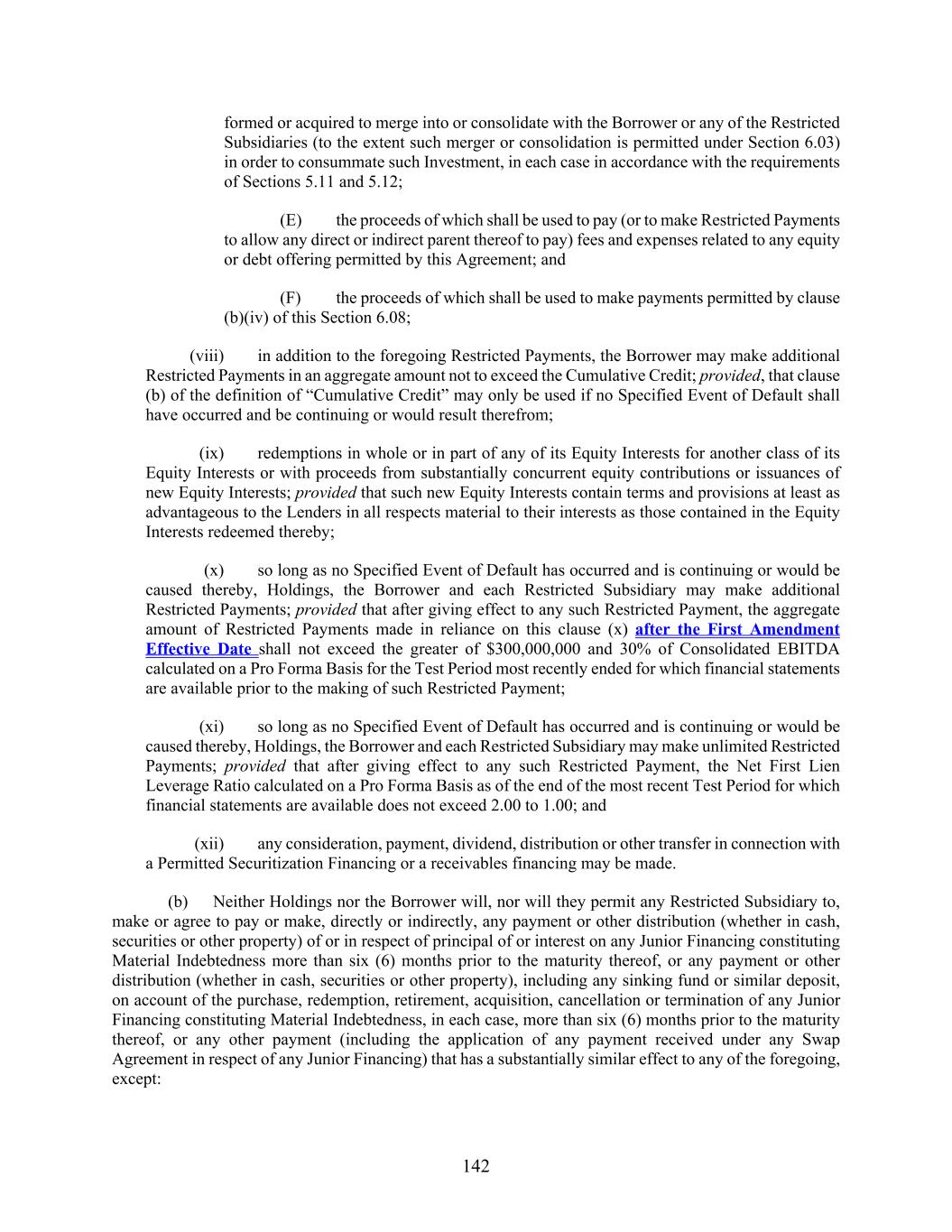 142 formed or acquired to merge into or consolidate with the Borrower or any of the Restricted Subsidiaries (to the extent such merger or consolidation is permitted under Section 6.03) in order to consummate such Investment, in each case in accordance with the requirements of Sections 5.11 and 5.12; (E) the proceeds of which shall be used to pay (or to make Restricted Payments to allow any direct or indirect parent thereof to pay) fees and expenses related to any equity or debt offering permitted by this Agreement; and (F) the proceeds of which shall be used to make payments permitted by clause (b)(iv) of this Section 6.08; (viii) in addition to the foregoing Restricted Payments, the Borrower may make additional Restricted Payments in an aggregate amount not to exceed the Cumulative Credit; provided, that clause (b) of the definition of “Cumulative Credit” may only be used if no Specified Event of Default shall have occurred and be continuing or would result therefrom; (ix) redemptions in whole or in part of any of its Equity Interests for another class of its Equity Interests or with proceeds from substantially concurrent equity contributions or issuances of new Equity Interests; provided that such new Equity Interests contain terms and provisions at least as advantageous to the Lenders in all respects material to their interests as those contained in the Equity Interests redeemed thereby; (x) so long as no Specified Event of Default has occurred and is continuing or would be caused thereby, Holdings, the Borrower and each Restricted Subsidiary may make additional Restricted Payments; provided that after giving effect to any such Restricted Payment, the aggregate amount of Restricted Payments made in reliance on this clause (x) after the First Amendment Effective Date shall not exceed the greater of $300,000,000 and 30% of Consolidated EBITDA calculated on a Pro Forma Basis for the Test Period most recently ended for which financial statements are available prior to the making of such Restricted Payment; (xi) so long as no Specified Event of Default has occurred and is continuing or would be caused thereby, Holdings, the Borrower and each Restricted Subsidiary may make unlimited Restricted Payments; provided that after giving effect to any such Restricted Payment, the Net First Lien Leverage Ratio calculated on a Pro Forma Basis as of the end of the most recent Test Period for which financial statements are available does not exceed 2.00 to 1.00; and (xii) any consideration, payment, dividend, distribution or other transfer in connection with a Permitted Securitization Financing or a receivables financing may be made. (b) Neither Holdings nor the Borrower will, nor will they permit any Restricted Subsidiary to, make or agree to pay or make, directly or indirectly, any payment or other distribution (whether in cash, securities or other property) of or in respect of principal of or interest on any Junior Financing constituting Material Indebtedness more than six (6) months prior to the maturity thereof, or any payment or other distribution (whether in cash, securities or other property), including any sinking fund or similar deposit, on account of the purchase, redemption, retirement, acquisition, cancellation or termination of any Junior Financing constituting Material Indebtedness, in each case, more than six (6) months prior to the maturity thereof, or any other payment (including the application of any payment received under any Swap Agreement in respect of any Junior Financing) that has a substantially similar effect to any of the foregoing, except: