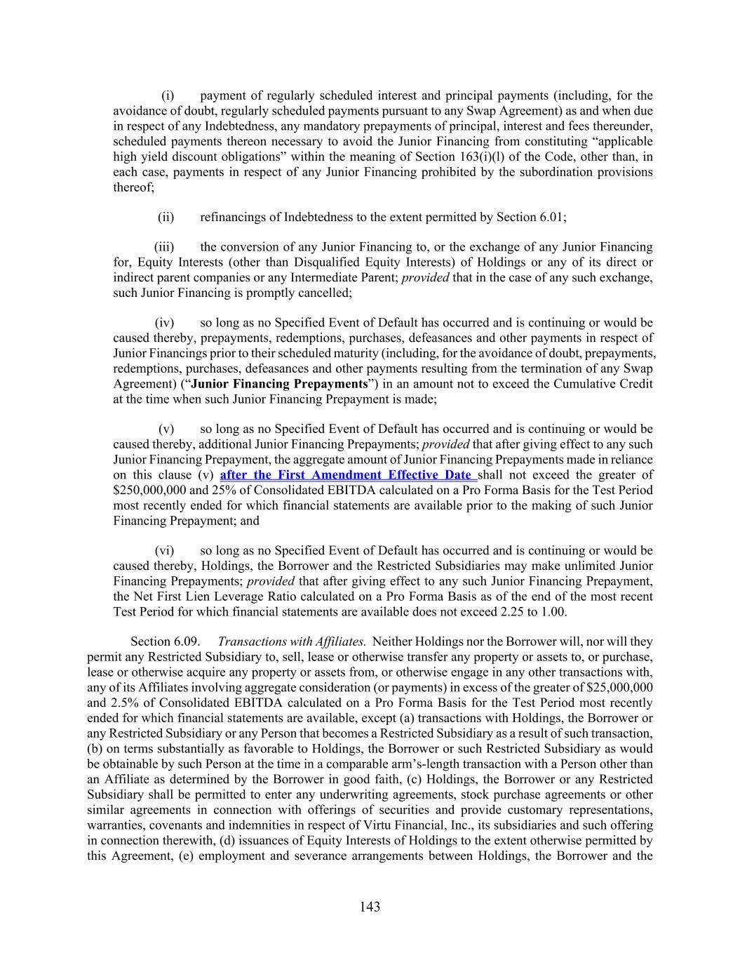 143 (i) payment of regularly scheduled interest and principal payments (including, for the avoidance of doubt, regularly scheduled payments pursuant to any Swap Agreement) as and when due in respect of any Indebtedness, any mandatory prepayments of principal, interest and fees thereunder, scheduled payments thereon necessary to avoid the Junior Financing from constituting “applicable high yield discount obligations” within the meaning of Section 163(i)(l) of the Code, other than, in each case, payments in respect of any Junior Financing prohibited by the subordination provisions thereof; (ii) refinancings of Indebtedness to the extent permitted by Section 6.01; (iii) the conversion of any Junior Financing to, or the exchange of any Junior Financing for, Equity Interests (other than Disqualified Equity Interests) of Holdings or any of its direct or indirect parent companies or any Intermediate Parent; provided that in the case of any such exchange, such Junior Financing is promptly cancelled; (iv) so long as no Specified Event of Default has occurred and is continuing or would be caused thereby, prepayments, redemptions, purchases, defeasances and other payments in respect of Junior Financings prior to their scheduled maturity (including, for the avoidance of doubt, prepayments, redemptions, purchases, defeasances and other payments resulting from the termination of any Swap Agreement) (“Junior Financing Prepayments”) in an amount not to exceed the Cumulative Credit at the time when such Junior Financing Prepayment is made; (v) so long as no Specified Event of Default has occurred and is continuing or would be caused thereby, additional Junior Financing Prepayments; provided that after giving effect to any such Junior Financing Prepayment, the aggregate amount of Junior Financing Prepayments made in reliance on this clause (v) after the First Amendment Effective Date shall not exceed the greater of $250,000,000 and 25% of Consolidated EBITDA calculated on a Pro Forma Basis for the Test Period most recently ended for which financial statements are available prior to the making of such Junior Financing Prepayment; and (vi) so long as no Specified Event of Default has occurred and is continuing or would be caused thereby, Holdings, the Borrower and the Restricted Subsidiaries may make unlimited Junior Financing Prepayments; provided that after giving effect to any such Junior Financing Prepayment, the Net First Lien Leverage Ratio calculated on a Pro Forma Basis as of the end of the most recent Test Period for which financial statements are available does not exceed 2.25 to 1.00. Section 6.09. Transactions with Affiliates. Neither Holdings nor the Borrower will, nor will they permit any Restricted Subsidiary to, sell, lease or otherwise transfer any property or assets to, or purchase, lease or otherwise acquire any property or assets from, or otherwise engage in any other transactions with, any of its Affiliates involving aggregate consideration (or payments) in excess of the greater of $25,000,000 and 2.5% of Consolidated EBITDA calculated on a Pro Forma Basis for the Test Period most recently ended for which financial statements are available, except (a) transactions with Holdings, the Borrower or any Restricted Subsidiary or any Person that becomes a Restricted Subsidiary as a result of such transaction, (b) on terms substantially as favorable to Holdings, the Borrower or such Restricted Subsidiary as would be obtainable by such Person at the time in a comparable arm’s-length transaction with a Person other than an Affiliate as determined by the Borrower in good faith, (c) Holdings, the Borrower or any Restricted Subsidiary shall be permitted to enter any underwriting agreements, stock purchase agreements or other similar agreements in connection with offerings of securities and provide customary representations, warranties, covenants and indemnities in respect of Virtu Financial, Inc., its subsidiaries and such offering in connection therewith, (d) issuances of Equity Interests of Holdings to the extent otherwise permitted by this Agreement, (e) employment and severance arrangements between Holdings, the Borrower and the