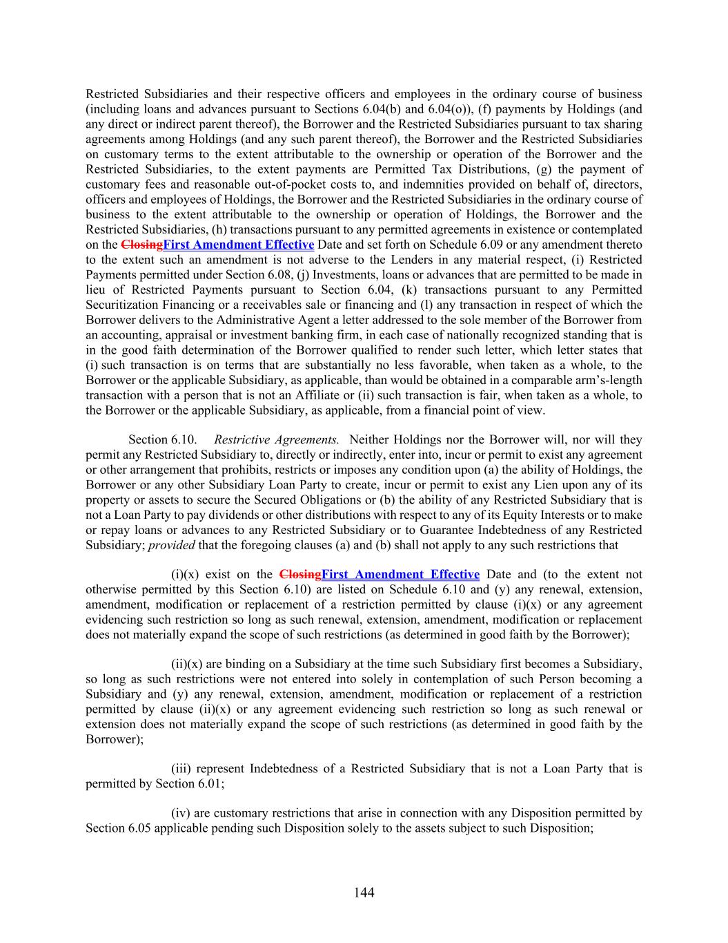 144 Restricted Subsidiaries and their respective officers and employees in the ordinary course of business (including loans and advances pursuant to Sections 6.04(b) and 6.04(o)), (f) payments by Holdings (and any direct or indirect parent thereof), the Borrower and the Restricted Subsidiaries pursuant to tax sharing agreements among Holdings (and any such parent thereof), the Borrower and the Restricted Subsidiaries on customary terms to the extent attributable to the ownership or operation of the Borrower and the Restricted Subsidiaries, to the extent payments are Permitted Tax Distributions, (g) the payment of customary fees and reasonable out-of-pocket costs to, and indemnities provided on behalf of, directors, officers and employees of Holdings, the Borrower and the Restricted Subsidiaries in the ordinary course of business to the extent attributable to the ownership or operation of Holdings, the Borrower and the Restricted Subsidiaries, (h) transactions pursuant to any permitted agreements in existence or contemplated on the ClosingFirst Amendment Effective Date and set forth on Schedule 6.09 or any amendment thereto to the extent such an amendment is not adverse to the Lenders in any material respect, (i) Restricted Payments permitted under Section 6.08, (j) Investments, loans or advances that are permitted to be made in lieu of Restricted Payments pursuant to Section 6.04, (k) transactions pursuant to any Permitted Securitization Financing or a receivables sale or financing and (l) any transaction in respect of which the Borrower delivers to the Administrative Agent a letter addressed to the sole member of the Borrower from an accounting, appraisal or investment banking firm, in each case of nationally recognized standing that is in the good faith determination of the Borrower qualified to render such letter, which letter states that (i) such transaction is on terms that are substantially no less favorable, when taken as a whole, to the Borrower or the applicable Subsidiary, as applicable, than would be obtained in a comparable arm’s-length transaction with a person that is not an Affiliate or (ii) such transaction is fair, when taken as a whole, to the Borrower or the applicable Subsidiary, as applicable, from a financial point of view. Section 6.10. Restrictive Agreements. Neither Holdings nor the Borrower will, nor will they permit any Restricted Subsidiary to, directly or indirectly, enter into, incur or permit to exist any agreement or other arrangement that prohibits, restricts or imposes any condition upon (a) the ability of Holdings, the Borrower or any other Subsidiary Loan Party to create, incur or permit to exist any Lien upon any of its property or assets to secure the Secured Obligations or (b) the ability of any Restricted Subsidiary that is not a Loan Party to pay dividends or other distributions with respect to any of its Equity Interests or to make or repay loans or advances to any Restricted Subsidiary or to Guarantee Indebtedness of any Restricted Subsidiary; provided that the foregoing clauses (a) and (b) shall not apply to any such restrictions that (i)(x) exist on the ClosingFirst Amendment Effective Date and (to the extent not otherwise permitted by this Section 6.10) are listed on Schedule 6.10 and (y) any renewal, extension, amendment, modification or replacement of a restriction permitted by clause (i)(x) or any agreement evidencing such restriction so long as such renewal, extension, amendment, modification or replacement does not materially expand the scope of such restrictions (as determined in good faith by the Borrower); (ii)(x) are binding on a Subsidiary at the time such Subsidiary first becomes a Subsidiary, so long as such restrictions were not entered into solely in contemplation of such Person becoming a Subsidiary and (y) any renewal, extension, amendment, modification or replacement of a restriction permitted by clause (ii)(x) or any agreement evidencing such restriction so long as such renewal or extension does not materially expand the scope of such restrictions (as determined in good faith by the Borrower); (iii) represent Indebtedness of a Restricted Subsidiary that is not a Loan Party that is permitted by Section 6.01; (iv) are customary restrictions that arise in connection with any Disposition permitted by Section 6.05 applicable pending such Disposition solely to the assets subject to such Disposition;