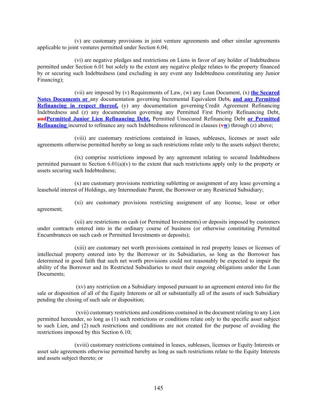 145 (v) are customary provisions in joint venture agreements and other similar agreements applicable to joint ventures permitted under Section 6.04; (vi) are negative pledges and restrictions on Liens in favor of any holder of Indebtedness permitted under Section 6.01 but solely to the extent any negative pledge relates to the property financed by or securing such Indebtedness (and excluding in any event any Indebtedness constituting any Junior Financing); (vii) are imposed by (v) Requirements of Law, (w) any Loan Document, (x) the Secured Notes Documents or any documentation governing Incremental Equivalent Debt, and any Permitted Refinancing in respect thereof, (y) any documentation governing Credit Agreement Refinancing Indebtedness and (z) any documentation governing any Permitted First Priority Refinancing Debt, andPermitted Junior Lien Refinancing Debt, Permitted Unsecured Refinancing Debt or Permitted Refinancing incurred to refinance any such Indebtedness referenced in clauses (vw) through (z) above; (viii) are customary restrictions contained in leases, subleases, licenses or asset sale agreements otherwise permitted hereby so long as such restrictions relate only to the assets subject thereto; (ix) comprise restrictions imposed by any agreement relating to secured Indebtedness permitted pursuant to Section 6.01(a)(v) to the extent that such restrictions apply only to the property or assets securing such Indebtedness; (x) are customary provisions restricting subletting or assignment of any lease governing a leasehold interest of Holdings, any Intermediate Parent, the Borrower or any Restricted Subsidiary; (xi) are customary provisions restricting assignment of any license, lease or other agreement; (xii) are restrictions on cash (or Permitted Investments) or deposits imposed by customers under contracts entered into in the ordinary course of business (or otherwise constituting Permitted Encumbrances on such cash or Permitted Investments or deposits); (xiii) are customary net worth provisions contained in real property leases or licenses of intellectual property entered into by the Borrower or its Subsidiaries, so long as the Borrower has determined in good faith that such net worth provisions could not reasonably be expected to impair the ability of the Borrower and its Restricted Subsidiaries to meet their ongoing obligations under the Loan Documents; (xv) any restriction on a Subsidiary imposed pursuant to an agreement entered into for the sale or disposition of all of the Equity Interests or all or substantially all of the assets of such Subsidiary pending the closing of such sale or disposition; (xvii) customary restrictions and conditions contained in the document relating to any Lien permitted hereunder, so long as (1) such restrictions or conditions relate only to the specific asset subject to such Lien, and (2) such restrictions and conditions are not created for the purpose of avoiding the restrictions imposed by this Section 6.10; (xviii) customary restrictions contained in leases, subleases, licenses or Equity Interests or asset sale agreements otherwise permitted hereby as long as such restrictions relate to the Equity Interests and assets subject thereto; or