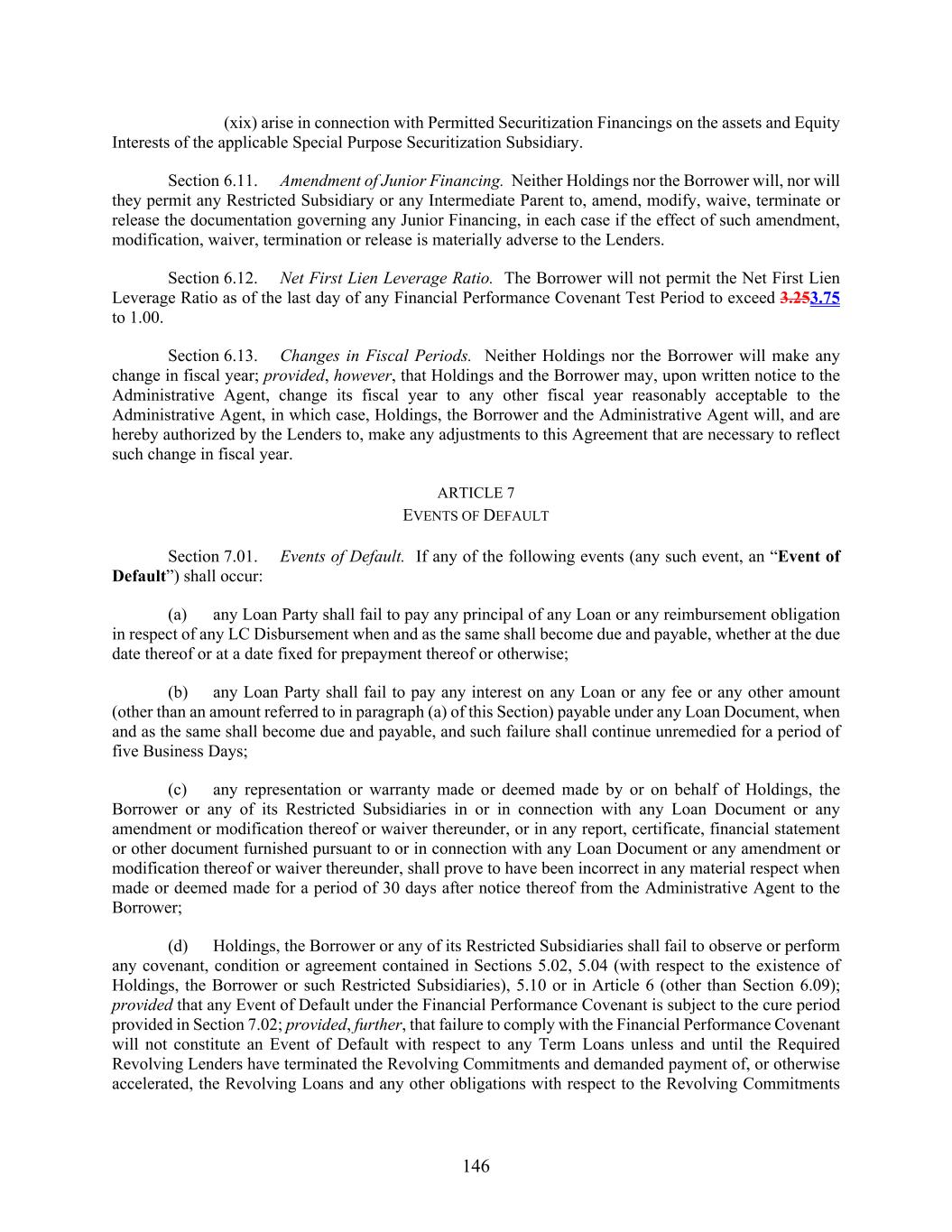 146 (xix) arise in connection with Permitted Securitization Financings on the assets and Equity Interests of the applicable Special Purpose Securitization Subsidiary. Section 6.11. Amendment of Junior Financing. Neither Holdings nor the Borrower will, nor will they permit any Restricted Subsidiary or any Intermediate Parent to, amend, modify, waive, terminate or release the documentation governing any Junior Financing, in each case if the effect of such amendment, modification, waiver, termination or release is materially adverse to the Lenders. Section 6.12. Net First Lien Leverage Ratio. The Borrower will not permit the Net First Lien Leverage Ratio as of the last day of any Financial Performance Covenant Test Period to exceed 3.253.75 to 1.00. Section 6.13. Changes in Fiscal Periods. Neither Holdings nor the Borrower will make any change in fiscal year; provided, however, that Holdings and the Borrower may, upon written notice to the Administrative Agent, change its fiscal year to any other fiscal year reasonably acceptable to the Administrative Agent, in which case, Holdings, the Borrower and the Administrative Agent will, and are hereby authorized by the Lenders to, make any adjustments to this Agreement that are necessary to reflect such change in fiscal year. ARTICLE 7 EVENTS OF DEFAULT Section 7.01. Events of Default. If any of the following events (any such event, an “Event of Default”) shall occur: (a) any Loan Party shall fail to pay any principal of any Loan or any reimbursement obligation in respect of any LC Disbursement when and as the same shall become due and payable, whether at the due date thereof or at a date fixed for prepayment thereof or otherwise; (b) any Loan Party shall fail to pay any interest on any Loan or any fee or any other amount (other than an amount referred to in paragraph (a) of this Section) payable under any Loan Document, when and as the same shall become due and payable, and such failure shall continue unremedied for a period of five Business Days; (c) any representation or warranty made or deemed made by or on behalf of Holdings, the Borrower or any of its Restricted Subsidiaries in or in connection with any Loan Document or any amendment or modification thereof or waiver thereunder, or in any report, certificate, financial statement or other document furnished pursuant to or in connection with any Loan Document or any amendment or modification thereof or waiver thereunder, shall prove to have been incorrect in any material respect when made or deemed made for a period of 30 days after notice thereof from the Administrative Agent to the Borrower; (d) Holdings, the Borrower or any of its Restricted Subsidiaries shall fail to observe or perform any covenant, condition or agreement contained in Sections 5.02, 5.04 (with respect to the existence of Holdings, the Borrower or such Restricted Subsidiaries), 5.10 or in Article 6 (other than Section 6.09); provided that any Event of Default under the Financial Performance Covenant is subject to the cure period provided in Section 7.02; provided, further, that failure to comply with the Financial Performance Covenant will not constitute an Event of Default with respect to any Term Loans unless and until the Required Revolving Lenders have terminated the Revolving Commitments and demanded payment of, or otherwise accelerated, the Revolving Loans and any other obligations with respect to the Revolving Commitments