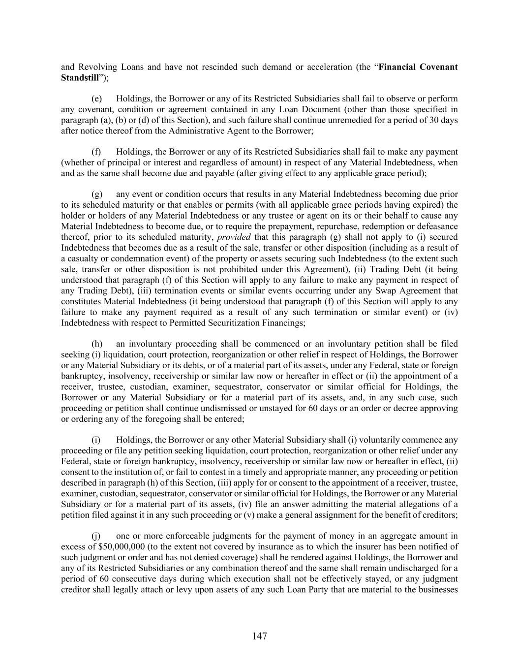 147 and Revolving Loans and have not rescinded such demand or acceleration (the “Financial Covenant Standstill”); (e) Holdings, the Borrower or any of its Restricted Subsidiaries shall fail to observe or perform any covenant, condition or agreement contained in any Loan Document (other than those specified in paragraph (a), (b) or (d) of this Section), and such failure shall continue unremedied for a period of 30 days after notice thereof from the Administrative Agent to the Borrower; (f) Holdings, the Borrower or any of its Restricted Subsidiaries shall fail to make any payment (whether of principal or interest and regardless of amount) in respect of any Material Indebtedness, when and as the same shall become due and payable (after giving effect to any applicable grace period); (g) any event or condition occurs that results in any Material Indebtedness becoming due prior to its scheduled maturity or that enables or permits (with all applicable grace periods having expired) the holder or holders of any Material Indebtedness or any trustee or agent on its or their behalf to cause any Material Indebtedness to become due, or to require the prepayment, repurchase, redemption or defeasance thereof, prior to its scheduled maturity, provided that this paragraph (g) shall not apply to (i) secured Indebtedness that becomes due as a result of the sale, transfer or other disposition (including as a result of a casualty or condemnation event) of the property or assets securing such Indebtedness (to the extent such sale, transfer or other disposition is not prohibited under this Agreement), (ii) Trading Debt (it being understood that paragraph (f) of this Section will apply to any failure to make any payment in respect of any Trading Debt), (iii) termination events or similar events occurring under any Swap Agreement that constitutes Material Indebtedness (it being understood that paragraph (f) of this Section will apply to any failure to make any payment required as a result of any such termination or similar event) or (iv) Indebtedness with respect to Permitted Securitization Financings; (h) an involuntary proceeding shall be commenced or an involuntary petition shall be filed seeking (i) liquidation, court protection, reorganization or other relief in respect of Holdings, the Borrower or any Material Subsidiary or its debts, or of a material part of its assets, under any Federal, state or foreign bankruptcy, insolvency, receivership or similar law now or hereafter in effect or (ii) the appointment of a receiver, trustee, custodian, examiner, sequestrator, conservator or similar official for Holdings, the Borrower or any Material Subsidiary or for a material part of its assets, and, in any such case, such proceeding or petition shall continue undismissed or unstayed for 60 days or an order or decree approving or ordering any of the foregoing shall be entered; (i) Holdings, the Borrower or any other Material Subsidiary shall (i) voluntarily commence any proceeding or file any petition seeking liquidation, court protection, reorganization or other relief under any Federal, state or foreign bankruptcy, insolvency, receivership or similar law now or hereafter in effect, (ii) consent to the institution of, or fail to contest in a timely and appropriate manner, any proceeding or petition described in paragraph (h) of this Section, (iii) apply for or consent to the appointment of a receiver, trustee, examiner, custodian, sequestrator, conservator or similar official for Holdings, the Borrower or any Material Subsidiary or for a material part of its assets, (iv) file an answer admitting the material allegations of a petition filed against it in any such proceeding or (v) make a general assignment for the benefit of creditors; (j) one or more enforceable judgments for the payment of money in an aggregate amount in excess of $50,000,000 (to the extent not covered by insurance as to which the insurer has been notified of such judgment or order and has not denied coverage) shall be rendered against Holdings, the Borrower and any of its Restricted Subsidiaries or any combination thereof and the same shall remain undischarged for a period of 60 consecutive days during which execution shall not be effectively stayed, or any judgment creditor shall legally attach or levy upon assets of any such Loan Party that are material to the businesses