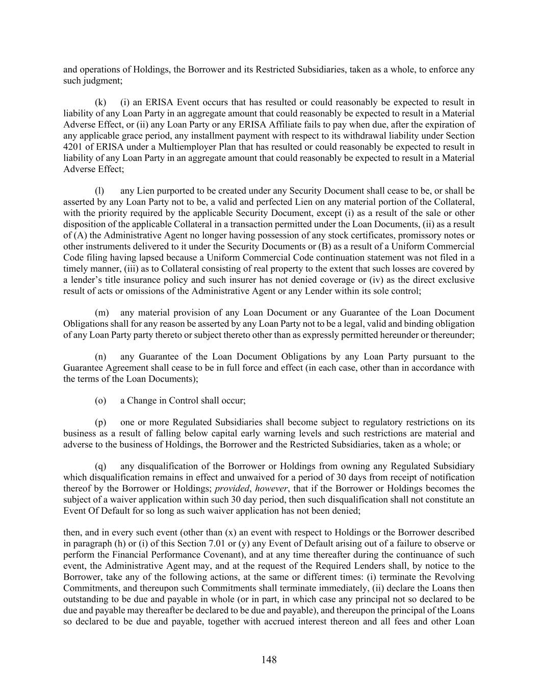 148 and operations of Holdings, the Borrower and its Restricted Subsidiaries, taken as a whole, to enforce any such judgment; (k) (i) an ERISA Event occurs that has resulted or could reasonably be expected to result in liability of any Loan Party in an aggregate amount that could reasonably be expected to result in a Material Adverse Effect, or (ii) any Loan Party or any ERISA Affiliate fails to pay when due, after the expiration of any applicable grace period, any installment payment with respect to its withdrawal liability under Section 4201 of ERISA under a Multiemployer Plan that has resulted or could reasonably be expected to result in liability of any Loan Party in an aggregate amount that could reasonably be expected to result in a Material Adverse Effect; (l) any Lien purported to be created under any Security Document shall cease to be, or shall be asserted by any Loan Party not to be, a valid and perfected Lien on any material portion of the Collateral, with the priority required by the applicable Security Document, except (i) as a result of the sale or other disposition of the applicable Collateral in a transaction permitted under the Loan Documents, (ii) as a result of (A) the Administrative Agent no longer having possession of any stock certificates, promissory notes or other instruments delivered to it under the Security Documents or (B) as a result of a Uniform Commercial Code filing having lapsed because a Uniform Commercial Code continuation statement was not filed in a timely manner, (iii) as to Collateral consisting of real property to the extent that such losses are covered by a lender’s title insurance policy and such insurer has not denied coverage or (iv) as the direct exclusive result of acts or omissions of the Administrative Agent or any Lender within its sole control; (m) any material provision of any Loan Document or any Guarantee of the Loan Document Obligations shall for any reason be asserted by any Loan Party not to be a legal, valid and binding obligation of any Loan Party party thereto or subject thereto other than as expressly permitted hereunder or thereunder; (n) any Guarantee of the Loan Document Obligations by any Loan Party pursuant to the Guarantee Agreement shall cease to be in full force and effect (in each case, other than in accordance with the terms of the Loan Documents); (o) a Change in Control shall occur; (p) one or more Regulated Subsidiaries shall become subject to regulatory restrictions on its business as a result of falling below capital early warning levels and such restrictions are material and adverse to the business of Holdings, the Borrower and the Restricted Subsidiaries, taken as a whole; or (q) any disqualification of the Borrower or Holdings from owning any Regulated Subsidiary which disqualification remains in effect and unwaived for a period of 30 days from receipt of notification thereof by the Borrower or Holdings; provided, however, that if the Borrower or Holdings becomes the subject of a waiver application within such 30 day period, then such disqualification shall not constitute an Event Of Default for so long as such waiver application has not been denied; then, and in every such event (other than (x) an event with respect to Holdings or the Borrower described in paragraph (h) or (i) of this Section 7.01 or (y) any Event of Default arising out of a failure to observe or perform the Financial Performance Covenant), and at any time thereafter during the continuance of such event, the Administrative Agent may, and at the request of the Required Lenders shall, by notice to the Borrower, take any of the following actions, at the same or different times: (i) terminate the Revolving Commitments, and thereupon such Commitments shall terminate immediately, (ii) declare the Loans then outstanding to be due and payable in whole (or in part, in which case any principal not so declared to be due and payable may thereafter be declared to be due and payable), and thereupon the principal of the Loans so declared to be due and payable, together with accrued interest thereon and all fees and other Loan