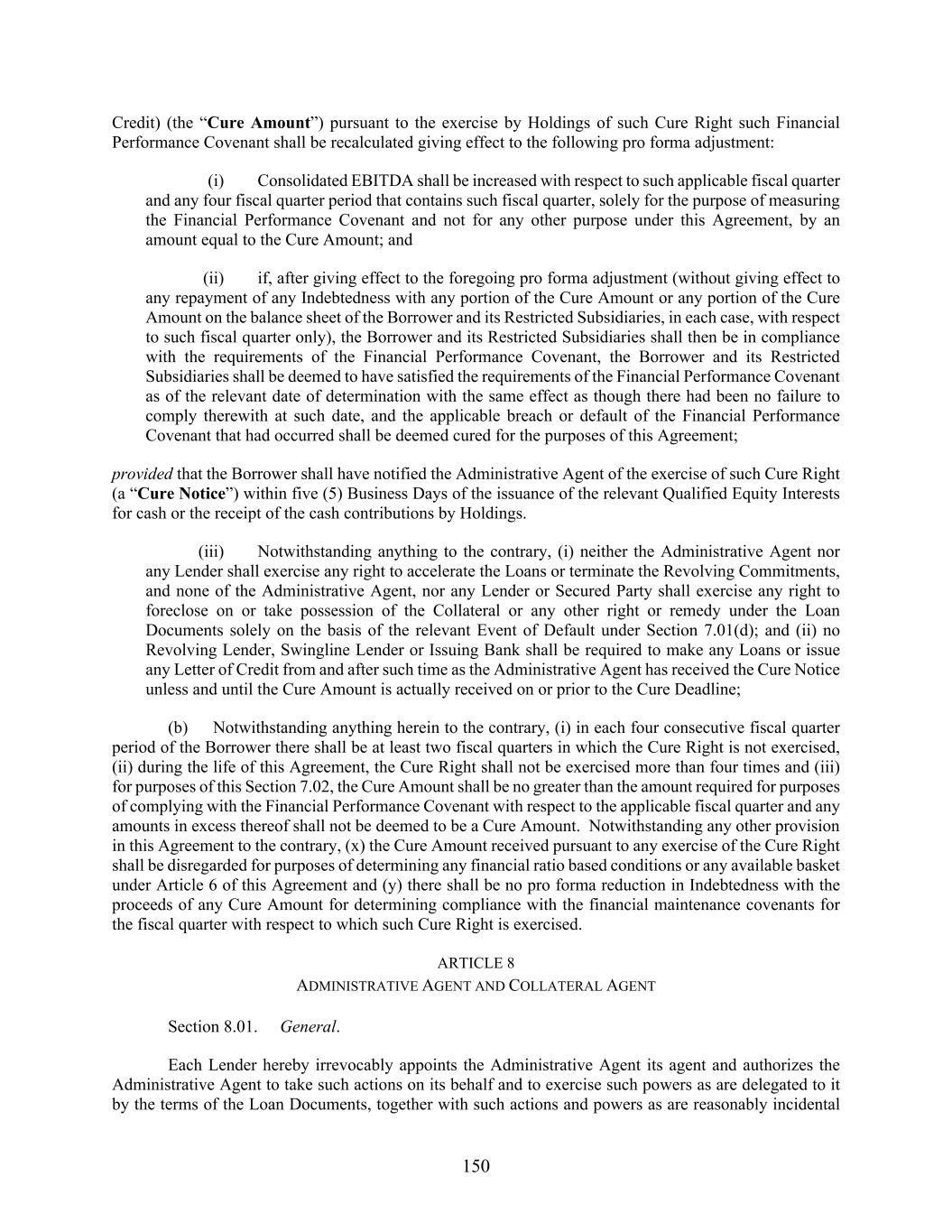 150 Credit) (the “Cure Amount”) pursuant to the exercise by Holdings of such Cure Right such Financial Performance Covenant shall be recalculated giving effect to the following pro forma adjustment: (i) Consolidated EBITDA shall be increased with respect to such applicable fiscal quarter and any four fiscal quarter period that contains such fiscal quarter, solely for the purpose of measuring the Financial Performance Covenant and not for any other purpose under this Agreement, by an amount equal to the Cure Amount; and (ii) if, after giving effect to the foregoing pro forma adjustment (without giving effect to any repayment of any Indebtedness with any portion of the Cure Amount or any portion of the Cure Amount on the balance sheet of the Borrower and its Restricted Subsidiaries, in each case, with respect to such fiscal quarter only), the Borrower and its Restricted Subsidiaries shall then be in compliance with the requirements of the Financial Performance Covenant, the Borrower and its Restricted Subsidiaries shall be deemed to have satisfied the requirements of the Financial Performance Covenant as of the relevant date of determination with the same effect as though there had been no failure to comply therewith at such date, and the applicable breach or default of the Financial Performance Covenant that had occurred shall be deemed cured for the purposes of this Agreement; provided that the Borrower shall have notified the Administrative Agent of the exercise of such Cure Right (a “Cure Notice”) within five (5) Business Days of the issuance of the relevant Qualified Equity Interests for cash or the receipt of the cash contributions by Holdings. (iii) Notwithstanding anything to the contrary, (i) neither the Administrative Agent nor any Lender shall exercise any right to accelerate the Loans or terminate the Revolving Commitments, and none of the Administrative Agent, nor any Lender or Secured Party shall exercise any right to foreclose on or take possession of the Collateral or any other right or remedy under the Loan Documents solely on the basis of the relevant Event of Default under Section 7.01(d); and (ii) no Revolving Lender, Swingline Lender or Issuing Bank shall be required to make any Loans or issue any Letter of Credit from and after such time as the Administrative Agent has received the Cure Notice unless and until the Cure Amount is actually received on or prior to the Cure Deadline; (b) Notwithstanding anything herein to the contrary, (i) in each four consecutive fiscal quarter period of the Borrower there shall be at least two fiscal quarters in which the Cure Right is not exercised, (ii) during the life of this Agreement, the Cure Right shall not be exercised more than four times and (iii) for purposes of this Section 7.02, the Cure Amount shall be no greater than the amount required for purposes of complying with the Financial Performance Covenant with respect to the applicable fiscal quarter and any amounts in excess thereof shall not be deemed to be a Cure Amount. Notwithstanding any other provision in this Agreement to the contrary, (x) the Cure Amount received pursuant to any exercise of the Cure Right shall be disregarded for purposes of determining any financial ratio based conditions or any available basket under Article 6 of this Agreement and (y) there shall be no pro forma reduction in Indebtedness with the proceeds of any Cure Amount for determining compliance with the financial maintenance covenants for the fiscal quarter with respect to which such Cure Right is exercised. ARTICLE 8 ADMINISTRATIVE AGENT AND COLLATERAL AGENT Section 8.01. General. Each Lender hereby irrevocably appoints the Administrative Agent its agent and authorizes the Administrative Agent to take such actions on its behalf and to exercise such powers as are delegated to it by the terms of the Loan Documents, together with such actions and powers as are reasonably incidental
