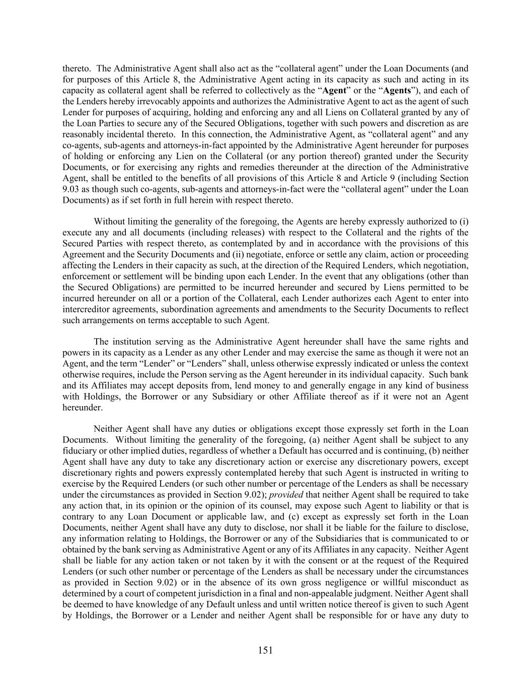 151 thereto. The Administrative Agent shall also act as the “collateral agent” under the Loan Documents (and for purposes of this Article 8, the Administrative Agent acting in its capacity as such and acting in its capacity as collateral agent shall be referred to collectively as the “Agent” or the “Agents”), and each of the Lenders hereby irrevocably appoints and authorizes the Administrative Agent to act as the agent of such Lender for purposes of acquiring, holding and enforcing any and all Liens on Collateral granted by any of the Loan Parties to secure any of the Secured Obligations, together with such powers and discretion as are reasonably incidental thereto. In this connection, the Administrative Agent, as “collateral agent” and any co-agents, sub-agents and attorneys-in-fact appointed by the Administrative Agent hereunder for purposes of holding or enforcing any Lien on the Collateral (or any portion thereof) granted under the Security Documents, or for exercising any rights and remedies thereunder at the direction of the Administrative Agent, shall be entitled to the benefits of all provisions of this Article 8 and Article 9 (including Section 9.03 as though such co-agents, sub-agents and attorneys-in-fact were the “collateral agent” under the Loan Documents) as if set forth in full herein with respect thereto. Without limiting the generality of the foregoing, the Agents are hereby expressly authorized to (i) execute any and all documents (including releases) with respect to the Collateral and the rights of the Secured Parties with respect thereto, as contemplated by and in accordance with the provisions of this Agreement and the Security Documents and (ii) negotiate, enforce or settle any claim, action or proceeding affecting the Lenders in their capacity as such, at the direction of the Required Lenders, which negotiation, enforcement or settlement will be binding upon each Lender. In the event that any obligations (other than the Secured Obligations) are permitted to be incurred hereunder and secured by Liens permitted to be incurred hereunder on all or a portion of the Collateral, each Lender authorizes each Agent to enter into intercreditor agreements, subordination agreements and amendments to the Security Documents to reflect such arrangements on terms acceptable to such Agent. The institution serving as the Administrative Agent hereunder shall have the same rights and powers in its capacity as a Lender as any other Lender and may exercise the same as though it were not an Agent, and the term “Lender” or “Lenders” shall, unless otherwise expressly indicated or unless the context otherwise requires, include the Person serving as the Agent hereunder in its individual capacity. Such bank and its Affiliates may accept deposits from, lend money to and generally engage in any kind of business with Holdings, the Borrower or any Subsidiary or other Affiliate thereof as if it were not an Agent hereunder. Neither Agent shall have any duties or obligations except those expressly set forth in the Loan Documents. Without limiting the generality of the foregoing, (a) neither Agent shall be subject to any fiduciary or other implied duties, regardless of whether a Default has occurred and is continuing, (b) neither Agent shall have any duty to take any discretionary action or exercise any discretionary powers, except discretionary rights and powers expressly contemplated hereby that such Agent is instructed in writing to exercise by the Required Lenders (or such other number or percentage of the Lenders as shall be necessary under the circumstances as provided in Section 9.02); provided that neither Agent shall be required to take any action that, in its opinion or the opinion of its counsel, may expose such Agent to liability or that is contrary to any Loan Document or applicable law, and (c) except as expressly set forth in the Loan Documents, neither Agent shall have any duty to disclose, nor shall it be liable for the failure to disclose, any information relating to Holdings, the Borrower or any of the Subsidiaries that is communicated to or obtained by the bank serving as Administrative Agent or any of its Affiliates in any capacity. Neither Agent shall be liable for any action taken or not taken by it with the consent or at the request of the Required Lenders (or such other number or percentage of the Lenders as shall be necessary under the circumstances as provided in Section 9.02) or in the absence of its own gross negligence or willful misconduct as determined by a court of competent jurisdiction in a final and non-appealable judgment. Neither Agent shall be deemed to have knowledge of any Default unless and until written notice thereof is given to such Agent by Holdings, the Borrower or a Lender and neither Agent shall be responsible for or have any duty to