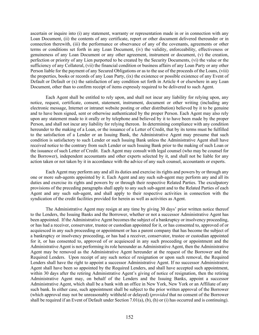 152 ascertain or inquire into (i) any statement, warranty or representation made in or in connection with any Loan Document, (ii) the contents of any certificate, report or other document delivered thereunder or in connection therewith, (iii) the performance or observance of any of the covenants, agreements or other terms or conditions set forth in any Loan Document, (iv) the validity, enforceability, effectiveness or genuineness of any Loan Document or any other agreement, instrument or document, (v) the creation, perfection or priority of any Lien purported to be created by the Security Documents, (vi) the value or the sufficiency of any Collateral, (vii) the financial condition or business affairs of any Loan Party or any other Person liable for the payment of any Secured Obligations or as to the use of the proceeds of the Loans, (viii) the properties, books or records of any Loan Party, (ix) the existence or possible existence of any Event of Default or Default or (x) the satisfaction of any condition set forth in Article 4 or elsewhere in any Loan Document, other than to confirm receipt of items expressly required to be delivered to such Agent. Each Agent shall be entitled to rely upon, and shall not incur any liability for relying upon, any notice, request, certificate, consent, statement, instrument, document or other writing (including any electronic message, Internet or intranet website posting or other distribution) believed by it to be genuine and to have been signed, sent or otherwise authenticated by the proper Person. Each Agent may also rely upon any statement made to it orally or by telephone and believed by it to have been made by the proper Person, and shall not incur any liability for relying thereon. In determining compliance with any condition hereunder to the making of a Loan, or the issuance of a Letter of Credit, that by its terms must be fulfilled to the satisfaction of a Lender or an Issuing Bank, the Administrative Agent may presume that such condition is satisfactory to such Lender or such Issuing Bank unless the Administrative Agent shall have received notice to the contrary from such Lender or such Issuing Bank prior to the making of such Loan or the issuance of such Letter of Credit. Each Agent may consult with legal counsel (who may be counsel for the Borrower), independent accountants and other experts selected by it, and shall not be liable for any action taken or not taken by it in accordance with the advice of any such counsel, accountants or experts. Each Agent may perform any and all its duties and exercise its rights and powers by or through any one or more sub-agents appointed by it. Each Agent and any such sub-agent may perform any and all its duties and exercise its rights and powers by or through their respective Related Parties. The exculpatory provisions of the preceding paragraphs shall apply to any such sub-agent and to the Related Parties of each Agent and any such sub-agent, and shall apply to their respective activities in connection with the syndication of the credit facilities provided for herein as well as activities as Agent. The Administrative Agent may resign at any time by giving 30 days’ prior written notice thereof to the Lenders, the Issuing Banks and the Borrower, whether or not a successor Administrative Agent has been appointed. If the Administrative Agent becomes the subject of a bankruptcy or insolvency proceeding, or has had a receiver, conservator, trustee or custodian appointed for it, or has consented to, approved of or acquiesced in any such proceeding or appointment or has a parent company that has become the subject of a bankruptcy or insolvency proceeding, or has had a receiver, conservator, trustee or custodian appointed for it, or has consented to, approved of or acquiesced in any such proceeding or appointment and the Administrative Agent is not performing its role hereunder as Administrative Agent, then the Administrative Agent may be removed as the Administrative Agent hereunder at the request of the Borrower and the Required Lenders. Upon receipt of any such notice of resignation or upon such removal, the Required Lenders shall have the right to appoint a successor Administrative Agent. If no successor Administrative Agent shall have been so appointed by the Required Lenders, and shall have accepted such appointment, within 30 days after the retiring Administrative Agent’s giving of notice of resignation, then the retiring Administrative Agent may, on behalf of the Lenders and the Issuing Banks, appoint a successor Administrative Agent, which shall be a bank with an office in New York, New York or an Affiliate of any such bank. In either case, such appointment shall be subject to the prior written approval of the Borrower (which approval may not be unreasonably withheld or delayed) (provided that no consent of the Borrower shall be required if an Event of Default under Section 7.01(a), (b), (h) or (i) has occurred and is continuing).