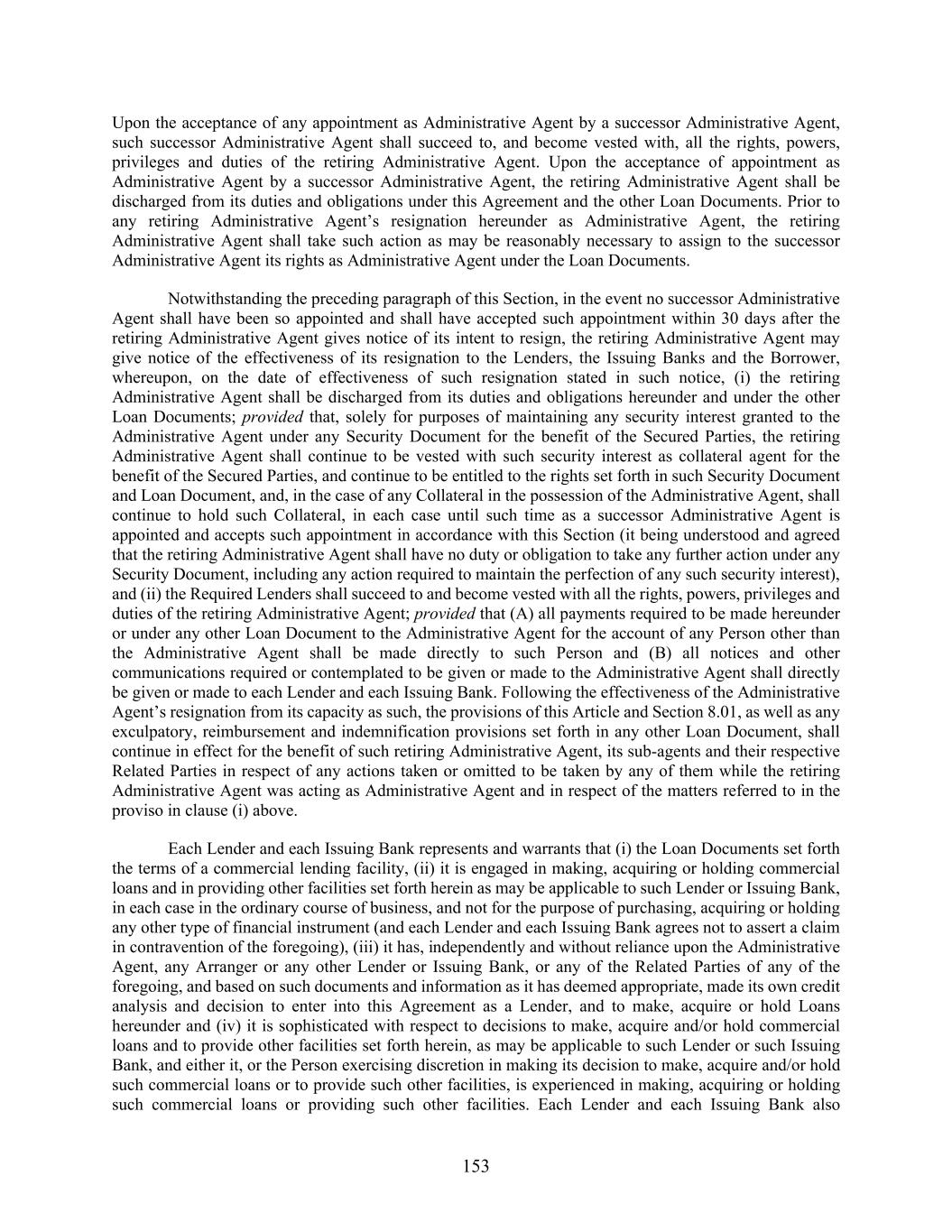 153 Upon the acceptance of any appointment as Administrative Agent by a successor Administrative Agent, such successor Administrative Agent shall succeed to, and become vested with, all the rights, powers, privileges and duties of the retiring Administrative Agent. Upon the acceptance of appointment as Administrative Agent by a successor Administrative Agent, the retiring Administrative Agent shall be discharged from its duties and obligations under this Agreement and the other Loan Documents. Prior to any retiring Administrative Agent’s resignation hereunder as Administrative Agent, the retiring Administrative Agent shall take such action as may be reasonably necessary to assign to the successor Administrative Agent its rights as Administrative Agent under the Loan Documents. Notwithstanding the preceding paragraph of this Section, in the event no successor Administrative Agent shall have been so appointed and shall have accepted such appointment within 30 days after the retiring Administrative Agent gives notice of its intent to resign, the retiring Administrative Agent may give notice of the effectiveness of its resignation to the Lenders, the Issuing Banks and the Borrower, whereupon, on the date of effectiveness of such resignation stated in such notice, (i) the retiring Administrative Agent shall be discharged from its duties and obligations hereunder and under the other Loan Documents; provided that, solely for purposes of maintaining any security interest granted to the Administrative Agent under any Security Document for the benefit of the Secured Parties, the retiring Administrative Agent shall continue to be vested with such security interest as collateral agent for the benefit of the Secured Parties, and continue to be entitled to the rights set forth in such Security Document and Loan Document, and, in the case of any Collateral in the possession of the Administrative Agent, shall continue to hold such Collateral, in each case until such time as a successor Administrative Agent is appointed and accepts such appointment in accordance with this Section (it being understood and agreed that the retiring Administrative Agent shall have no duty or obligation to take any further action under any Security Document, including any action required to maintain the perfection of any such security interest), and (ii) the Required Lenders shall succeed to and become vested with all the rights, powers, privileges and duties of the retiring Administrative Agent; provided that (A) all payments required to be made hereunder or under any other Loan Document to the Administrative Agent for the account of any Person other than the Administrative Agent shall be made directly to such Person and (B) all notices and other communications required or contemplated to be given or made to the Administrative Agent shall directly be given or made to each Lender and each Issuing Bank. Following the effectiveness of the Administrative Agent’s resignation from its capacity as such, the provisions of this Article and Section 8.01, as well as any exculpatory, reimbursement and indemnification provisions set forth in any other Loan Document, shall continue in effect for the benefit of such retiring Administrative Agent, its sub-agents and their respective Related Parties in respect of any actions taken or omitted to be taken by any of them while the retiring Administrative Agent was acting as Administrative Agent and in respect of the matters referred to in the proviso in clause (i) above. Each Lender and each Issuing Bank represents and warrants that (i) the Loan Documents set forth the terms of a commercial lending facility, (ii) it is engaged in making, acquiring or holding commercial loans and in providing other facilities set forth herein as may be applicable to such Lender or Issuing Bank, in each case in the ordinary course of business, and not for the purpose of purchasing, acquiring or holding any other type of financial instrument (and each Lender and each Issuing Bank agrees not to assert a claim in contravention of the foregoing), (iii) it has, independently and without reliance upon the Administrative Agent, any Arranger or any other Lender or Issuing Bank, or any of the Related Parties of any of the foregoing, and based on such documents and information as it has deemed appropriate, made its own credit analysis and decision to enter into this Agreement as a Lender, and to make, acquire or hold Loans hereunder and (iv) it is sophisticated with respect to decisions to make, acquire and/or hold commercial loans and to provide other facilities set forth herein, as may be applicable to such Lender or such Issuing Bank, and either it, or the Person exercising discretion in making its decision to make, acquire and/or hold such commercial loans or to provide such other facilities, is experienced in making, acquiring or holding such commercial loans or providing such other facilities. Each Lender and each Issuing Bank also