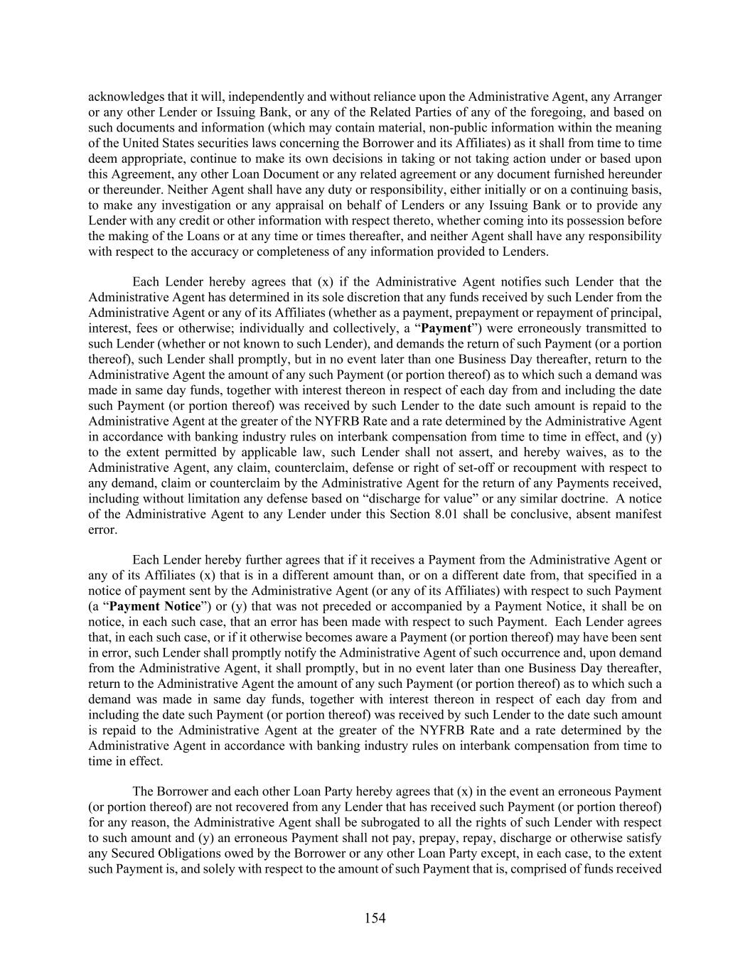 154 acknowledges that it will, independently and without reliance upon the Administrative Agent, any Arranger or any other Lender or Issuing Bank, or any of the Related Parties of any of the foregoing, and based on such documents and information (which may contain material, non-public information within the meaning of the United States securities laws concerning the Borrower and its Affiliates) as it shall from time to time deem appropriate, continue to make its own decisions in taking or not taking action under or based upon this Agreement, any other Loan Document or any related agreement or any document furnished hereunder or thereunder. Neither Agent shall have any duty or responsibility, either initially or on a continuing basis, to make any investigation or any appraisal on behalf of Lenders or any Issuing Bank or to provide any Lender with any credit or other information with respect thereto, whether coming into its possession before the making of the Loans or at any time or times thereafter, and neither Agent shall have any responsibility with respect to the accuracy or completeness of any information provided to Lenders. Each Lender hereby agrees that (x) if the Administrative Agent notifies such Lender that the Administrative Agent has determined in its sole discretion that any funds received by such Lender from the Administrative Agent or any of its Affiliates (whether as a payment, prepayment or repayment of principal, interest, fees or otherwise; individually and collectively, a “Payment”) were erroneously transmitted to such Lender (whether or not known to such Lender), and demands the return of such Payment (or a portion thereof), such Lender shall promptly, but in no event later than one Business Day thereafter, return to the Administrative Agent the amount of any such Payment (or portion thereof) as to which such a demand was made in same day funds, together with interest thereon in respect of each day from and including the date such Payment (or portion thereof) was received by such Lender to the date such amount is repaid to the Administrative Agent at the greater of the NYFRB Rate and a rate determined by the Administrative Agent in accordance with banking industry rules on interbank compensation from time to time in effect, and (y) to the extent permitted by applicable law, such Lender shall not assert, and hereby waives, as to the Administrative Agent, any claim, counterclaim, defense or right of set-off or recoupment with respect to any demand, claim or counterclaim by the Administrative Agent for the return of any Payments received, including without limitation any defense based on “discharge for value” or any similar doctrine. A notice of the Administrative Agent to any Lender under this Section 8.01 shall be conclusive, absent manifest error. Each Lender hereby further agrees that if it receives a Payment from the Administrative Agent or any of its Affiliates (x) that is in a different amount than, or on a different date from, that specified in a notice of payment sent by the Administrative Agent (or any of its Affiliates) with respect to such Payment (a “Payment Notice”) or (y) that was not preceded or accompanied by a Payment Notice, it shall be on notice, in each such case, that an error has been made with respect to such Payment. Each Lender agrees that, in each such case, or if it otherwise becomes aware a Payment (or portion thereof) may have been sent in error, such Lender shall promptly notify the Administrative Agent of such occurrence and, upon demand from the Administrative Agent, it shall promptly, but in no event later than one Business Day thereafter, return to the Administrative Agent the amount of any such Payment (or portion thereof) as to which such a demand was made in same day funds, together with interest thereon in respect of each day from and including the date such Payment (or portion thereof) was received by such Lender to the date such amount is repaid to the Administrative Agent at the greater of the NYFRB Rate and a rate determined by the Administrative Agent in accordance with banking industry rules on interbank compensation from time to time in effect. The Borrower and each other Loan Party hereby agrees that (x) in the event an erroneous Payment (or portion thereof) are not recovered from any Lender that has received such Payment (or portion thereof) for any reason, the Administrative Agent shall be subrogated to all the rights of such Lender with respect to such amount and (y) an erroneous Payment shall not pay, prepay, repay, discharge or otherwise satisfy any Secured Obligations owed by the Borrower or any other Loan Party except, in each case, to the extent such Payment is, and solely with respect to the amount of such Payment that is, comprised of funds received