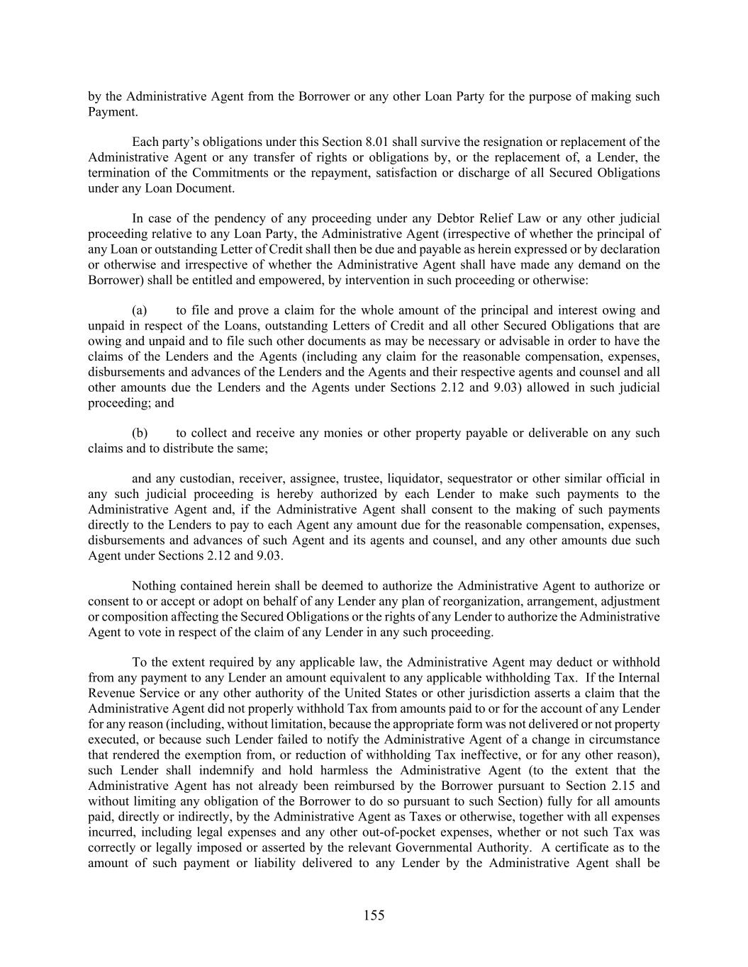155 by the Administrative Agent from the Borrower or any other Loan Party for the purpose of making such Payment. Each party’s obligations under this Section 8.01 shall survive the resignation or replacement of the Administrative Agent or any transfer of rights or obligations by, or the replacement of, a Lender, the termination of the Commitments or the repayment, satisfaction or discharge of all Secured Obligations under any Loan Document. In case of the pendency of any proceeding under any Debtor Relief Law or any other judicial proceeding relative to any Loan Party, the Administrative Agent (irrespective of whether the principal of any Loan or outstanding Letter of Credit shall then be due and payable as herein expressed or by declaration or otherwise and irrespective of whether the Administrative Agent shall have made any demand on the Borrower) shall be entitled and empowered, by intervention in such proceeding or otherwise: (a) to file and prove a claim for the whole amount of the principal and interest owing and unpaid in respect of the Loans, outstanding Letters of Credit and all other Secured Obligations that are owing and unpaid and to file such other documents as may be necessary or advisable in order to have the claims of the Lenders and the Agents (including any claim for the reasonable compensation, expenses, disbursements and advances of the Lenders and the Agents and their respective agents and counsel and all other amounts due the Lenders and the Agents under Sections 2.12 and 9.03) allowed in such judicial proceeding; and (b) to collect and receive any monies or other property payable or deliverable on any such claims and to distribute the same; and any custodian, receiver, assignee, trustee, liquidator, sequestrator or other similar official in any such judicial proceeding is hereby authorized by each Lender to make such payments to the Administrative Agent and, if the Administrative Agent shall consent to the making of such payments directly to the Lenders to pay to each Agent any amount due for the reasonable compensation, expenses, disbursements and advances of such Agent and its agents and counsel, and any other amounts due such Agent under Sections 2.12 and 9.03. Nothing contained herein shall be deemed to authorize the Administrative Agent to authorize or consent to or accept or adopt on behalf of any Lender any plan of reorganization, arrangement, adjustment or composition affecting the Secured Obligations or the rights of any Lender to authorize the Administrative Agent to vote in respect of the claim of any Lender in any such proceeding. To the extent required by any applicable law, the Administrative Agent may deduct or withhold from any payment to any Lender an amount equivalent to any applicable withholding Tax. If the Internal Revenue Service or any other authority of the United States or other jurisdiction asserts a claim that the Administrative Agent did not properly withhold Tax from amounts paid to or for the account of any Lender for any reason (including, without limitation, because the appropriate form was not delivered or not property executed, or because such Lender failed to notify the Administrative Agent of a change in circumstance that rendered the exemption from, or reduction of withholding Tax ineffective, or for any other reason), such Lender shall indemnify and hold harmless the Administrative Agent (to the extent that the Administrative Agent has not already been reimbursed by the Borrower pursuant to Section 2.15 and without limiting any obligation of the Borrower to do so pursuant to such Section) fully for all amounts paid, directly or indirectly, by the Administrative Agent as Taxes or otherwise, together with all expenses incurred, including legal expenses and any other out-of-pocket expenses, whether or not such Tax was correctly or legally imposed or asserted by the relevant Governmental Authority. A certificate as to the amount of such payment or liability delivered to any Lender by the Administrative Agent shall be