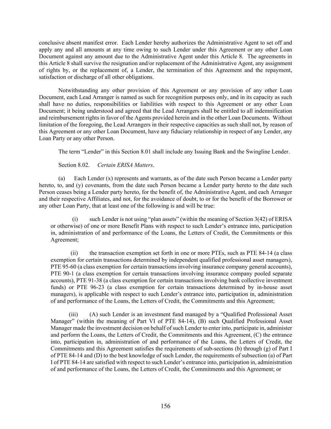 156 conclusive absent manifest error. Each Lender hereby authorizes the Administrative Agent to set off and apply any and all amounts at any time owing to such Lender under this Agreement or any other Loan Document against any amount due to the Administrative Agent under this Article 8. The agreements in this Article 8 shall survive the resignation and/or replacement of the Administrative Agent, any assignment of rights by, or the replacement of, a Lender, the termination of this Agreement and the repayment, satisfaction or discharge of all other obligations. Notwithstanding any other provision of this Agreement or any provision of any other Loan Document, each Lead Arranger is named as such for recognition purposes only, and in its capacity as such shall have no duties, responsibilities or liabilities with respect to this Agreement or any other Loan Document; it being understood and agreed that the Lead Arrangers shall be entitled to all indemnification and reimbursement rights in favor of the Agents provided herein and in the other Loan Documents. Without limitation of the foregoing, the Lead Arrangers in their respective capacities as such shall not, by reason of this Agreement or any other Loan Document, have any fiduciary relationship in respect of any Lender, any Loan Party or any other Person. The term “Lender” in this Section 8.01 shall include any Issuing Bank and the Swingline Lender. Section 8.02. Certain ERISA Matters. (a) Each Lender (x) represents and warrants, as of the date such Person became a Lender party hereto, to, and (y) covenants, from the date such Person became a Lender party hereto to the date such Person ceases being a Lender party hereto, for the benefit of, the Administrative Agent, and each Arranger and their respective Affiliates, and not, for the avoidance of doubt, to or for the benefit of the Borrower or any other Loan Party, that at least one of the following is and will be true: (i) such Lender is not using “plan assets” (within the meaning of Section 3(42) of ERISA or otherwise) of one or more Benefit Plans with respect to such Lender’s entrance into, participation in, administration of and performance of the Loans, the Letters of Credit, the Commitments or this Agreement; (ii) the transaction exemption set forth in one or more PTEs, such as PTE 84-14 (a class exemption for certain transactions determined by independent qualified professional asset managers), PTE 95-60 (a class exemption for certain transactions involving insurance company general accounts), PTE 90-1 (a class exemption for certain transactions involving insurance company pooled separate accounts), PTE 91-38 (a class exemption for certain transactions involving bank collective investment funds) or PTE 96-23 (a class exemption for certain transactions determined by in-house asset managers), is applicable with respect to such Lender’s entrance into, participation in, administration of and performance of the Loans, the Letters of Credit, the Commitments and this Agreement; (iii) (A) such Lender is an investment fund managed by a “Qualified Professional Asset Manager” (within the meaning of Part VI of PTE 84-14), (B) such Qualified Professional Asset Manager made the investment decision on behalf of such Lender to enter into, participate in, administer and perform the Loans, the Letters of Credit, the Commitments and this Agreement, (C) the entrance into, participation in, administration of and performance of the Loans, the Letters of Credit, the Commitments and this Agreement satisfies the requirements of sub-sections (b) through (g) of Part I of PTE 84-14 and (D) to the best knowledge of such Lender, the requirements of subsection (a) of Part I of PTE 84-14 are satisfied with respect to such Lender’s entrance into, participation in, administration of and performance of the Loans, the Letters of Credit, the Commitments and this Agreement; or