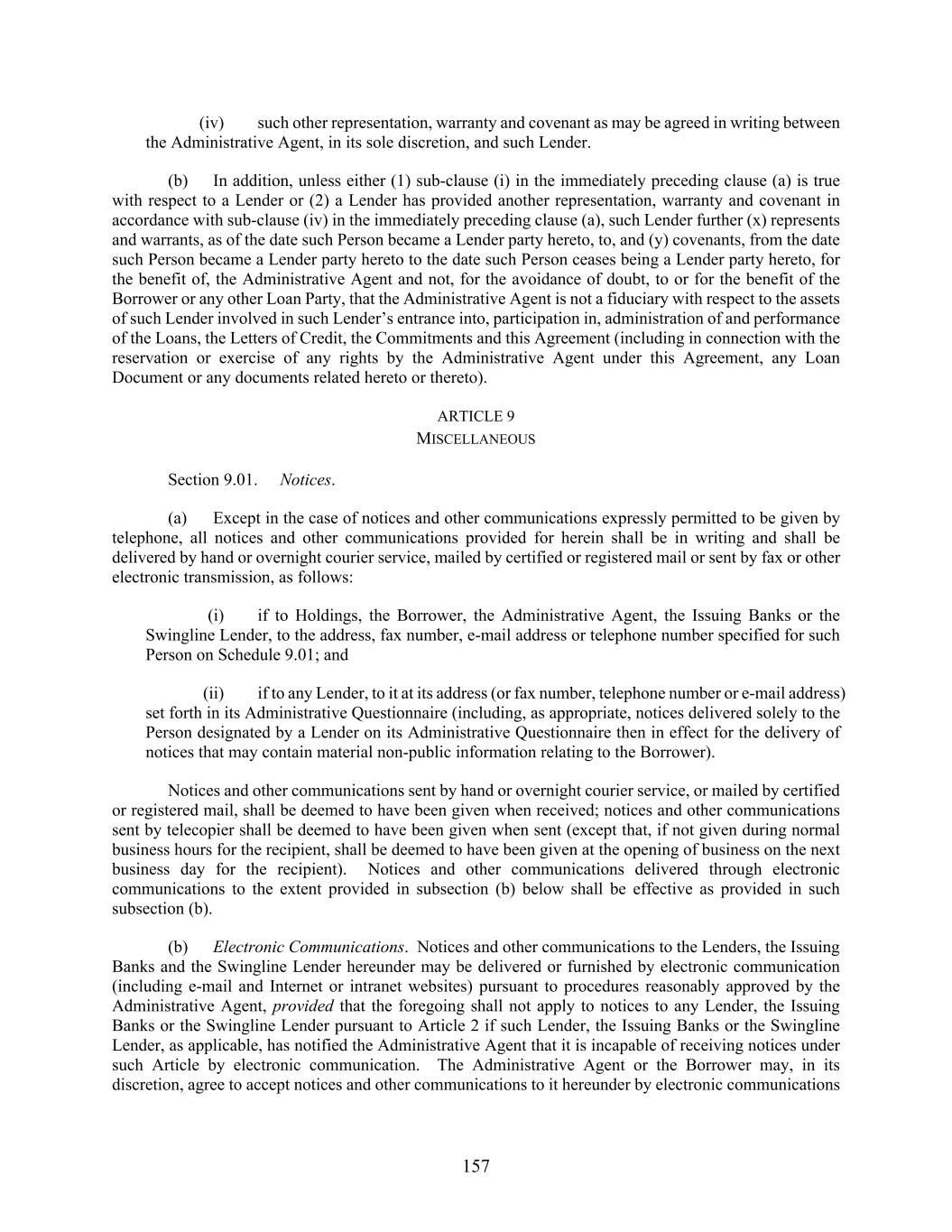 157 (iv) such other representation, warranty and covenant as may be agreed in writing between the Administrative Agent, in its sole discretion, and such Lender. (b) In addition, unless either (1) sub-clause (i) in the immediately preceding clause (a) is true with respect to a Lender or (2) a Lender has provided another representation, warranty and covenant in accordance with sub-clause (iv) in the immediately preceding clause (a), such Lender further (x) represents and warrants, as of the date such Person became a Lender party hereto, to, and (y) covenants, from the date such Person became a Lender party hereto to the date such Person ceases being a Lender party hereto, for the benefit of, the Administrative Agent and not, for the avoidance of doubt, to or for the benefit of the Borrower or any other Loan Party, that the Administrative Agent is not a fiduciary with respect to the assets of such Lender involved in such Lender’s entrance into, participation in, administration of and performance of the Loans, the Letters of Credit, the Commitments and this Agreement (including in connection with the reservation or exercise of any rights by the Administrative Agent under this Agreement, any Loan Document or any documents related hereto or thereto). ARTICLE 9 MISCELLANEOUS Section 9.01. Notices. (a) Except in the case of notices and other communications expressly permitted to be given by telephone, all notices and other communications provided for herein shall be in writing and shall be delivered by hand or overnight courier service, mailed by certified or registered mail or sent by fax or other electronic transmission, as follows: (i) if to Holdings, the Borrower, the Administrative Agent, the Issuing Banks or the Swingline Lender, to the address, fax number, e-mail address or telephone number specified for such Person on Schedule 9.01; and (ii) if to any Lender, to it at its address (or fax number, telephone number or e-mail address) set forth in its Administrative Questionnaire (including, as appropriate, notices delivered solely to the Person designated by a Lender on its Administrative Questionnaire then in effect for the delivery of notices that may contain material non-public information relating to the Borrower). Notices and other communications sent by hand or overnight courier service, or mailed by certified or registered mail, shall be deemed to have been given when received; notices and other communications sent by telecopier shall be deemed to have been given when sent (except that, if not given during normal business hours for the recipient, shall be deemed to have been given at the opening of business on the next business day for the recipient). Notices and other communications delivered through electronic communications to the extent provided in subsection (b) below shall be effective as provided in such subsection (b). (b) Electronic Communications. Notices and other communications to the Lenders, the Issuing Banks and the Swingline Lender hereunder may be delivered or furnished by electronic communication (including e-mail and Internet or intranet websites) pursuant to procedures reasonably approved by the Administrative Agent, provided that the foregoing shall not apply to notices to any Lender, the Issuing Banks or the Swingline Lender pursuant to Article 2 if such Lender, the Issuing Banks or the Swingline Lender, as applicable, has notified the Administrative Agent that it is incapable of receiving notices under such Article by electronic communication. The Administrative Agent or the Borrower may, in its discretion, agree to accept notices and other communications to it hereunder by electronic communications