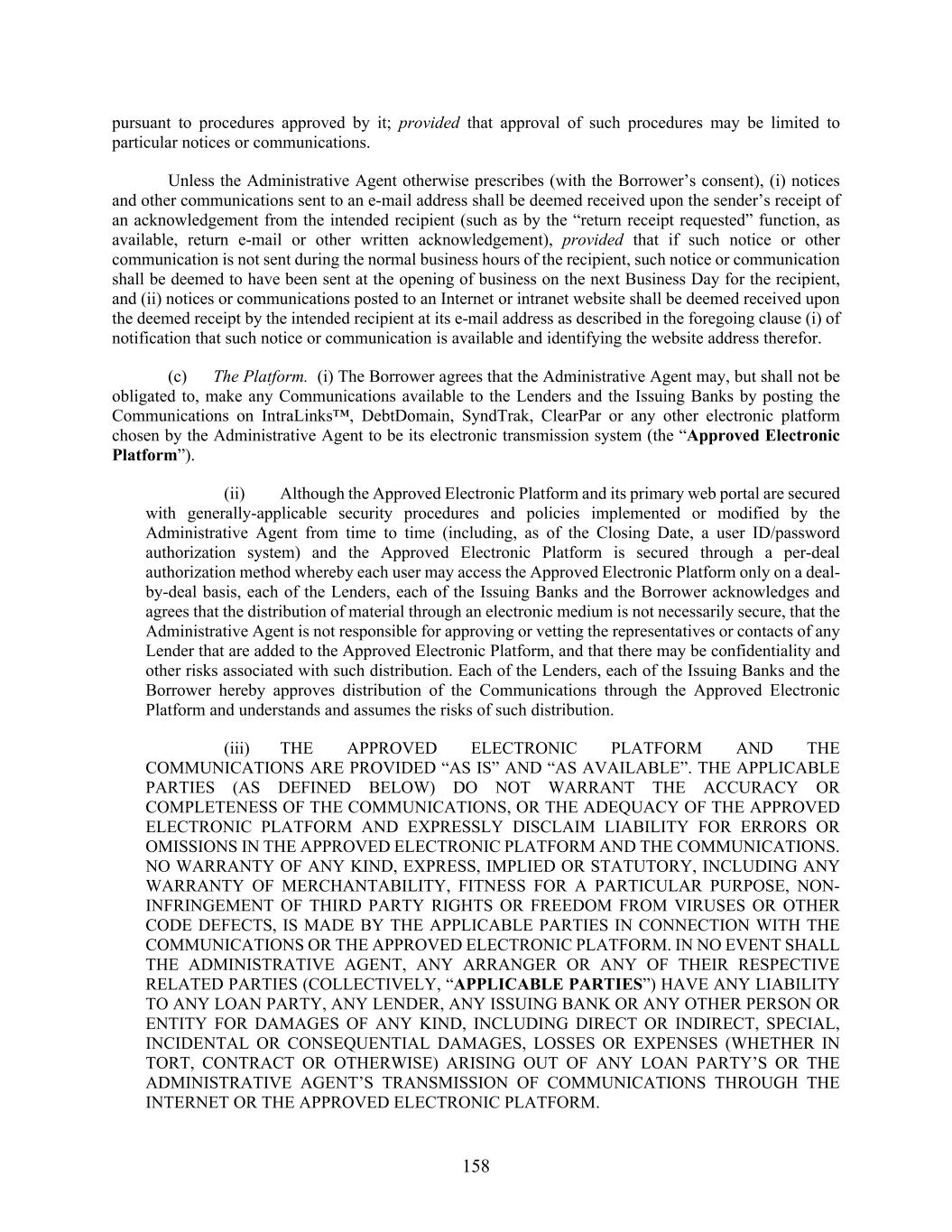 158 pursuant to procedures approved by it; provided that approval of such procedures may be limited to particular notices or communications. Unless the Administrative Agent otherwise prescribes (with the Borrower’s consent), (i) notices and other communications sent to an e-mail address shall be deemed received upon the sender’s receipt of an acknowledgement from the intended recipient (such as by the “return receipt requested” function, as available, return e-mail or other written acknowledgement), provided that if such notice or other communication is not sent during the normal business hours of the recipient, such notice or communication shall be deemed to have been sent at the opening of business on the next Business Day for the recipient, and (ii) notices or communications posted to an Internet or intranet website shall be deemed received upon the deemed receipt by the intended recipient at its e-mail address as described in the foregoing clause (i) of notification that such notice or communication is available and identifying the website address therefor. (c) The Platform. (i) The Borrower agrees that the Administrative Agent may, but shall not be obligated to, make any Communications available to the Lenders and the Issuing Banks by posting the Communications on IntraLinks™, DebtDomain, SyndTrak, ClearPar or any other electronic platform chosen by the Administrative Agent to be its electronic transmission system (the “Approved Electronic Platform”). (ii) Although the Approved Electronic Platform and its primary web portal are secured with generally-applicable security procedures and policies implemented or modified by the Administrative Agent from time to time (including, as of the Closing Date, a user ID/password authorization system) and the Approved Electronic Platform is secured through a per-deal authorization method whereby each user may access the Approved Electronic Platform only on a deal- by-deal basis, each of the Lenders, each of the Issuing Banks and the Borrower acknowledges and agrees that the distribution of material through an electronic medium is not necessarily secure, that the Administrative Agent is not responsible for approving or vetting the representatives or contacts of any Lender that are added to the Approved Electronic Platform, and that there may be confidentiality and other risks associated with such distribution. Each of the Lenders, each of the Issuing Banks and the Borrower hereby approves distribution of the Communications through the Approved Electronic Platform and understands and assumes the risks of such distribution. (iii) THE APPROVED ELECTRONIC PLATFORM AND THE COMMUNICATIONS ARE PROVIDED “AS IS” AND “AS AVAILABLE”. THE APPLICABLE PARTIES (AS DEFINED BELOW) DO NOT WARRANT THE ACCURACY OR COMPLETENESS OF THE COMMUNICATIONS, OR THE ADEQUACY OF THE APPROVED ELECTRONIC PLATFORM AND EXPRESSLY DISCLAIM LIABILITY FOR ERRORS OR OMISSIONS IN THE APPROVED ELECTRONIC PLATFORM AND THE COMMUNICATIONS. NO WARRANTY OF ANY KIND, EXPRESS, IMPLIED OR STATUTORY, INCLUDING ANY WARRANTY OF MERCHANTABILITY, FITNESS FOR A PARTICULAR PURPOSE, NON- INFRINGEMENT OF THIRD PARTY RIGHTS OR FREEDOM FROM VIRUSES OR OTHER CODE DEFECTS, IS MADE BY THE APPLICABLE PARTIES IN CONNECTION WITH THE COMMUNICATIONS OR THE APPROVED ELECTRONIC PLATFORM. IN NO EVENT SHALL THE ADMINISTRATIVE AGENT, ANY ARRANGER OR ANY OF THEIR RESPECTIVE RELATED PARTIES (COLLECTIVELY, “APPLICABLE PARTIES”) HAVE ANY LIABILITY TO ANY LOAN PARTY, ANY LENDER, ANY ISSUING BANK OR ANY OTHER PERSON OR ENTITY FOR DAMAGES OF ANY KIND, INCLUDING DIRECT OR INDIRECT, SPECIAL, INCIDENTAL OR CONSEQUENTIAL DAMAGES, LOSSES OR EXPENSES (WHETHER IN TORT, CONTRACT OR OTHERWISE) ARISING OUT OF ANY LOAN PARTY’S OR THE ADMINISTRATIVE AGENT’S TRANSMISSION OF COMMUNICATIONS THROUGH THE INTERNET OR THE APPROVED ELECTRONIC PLATFORM.