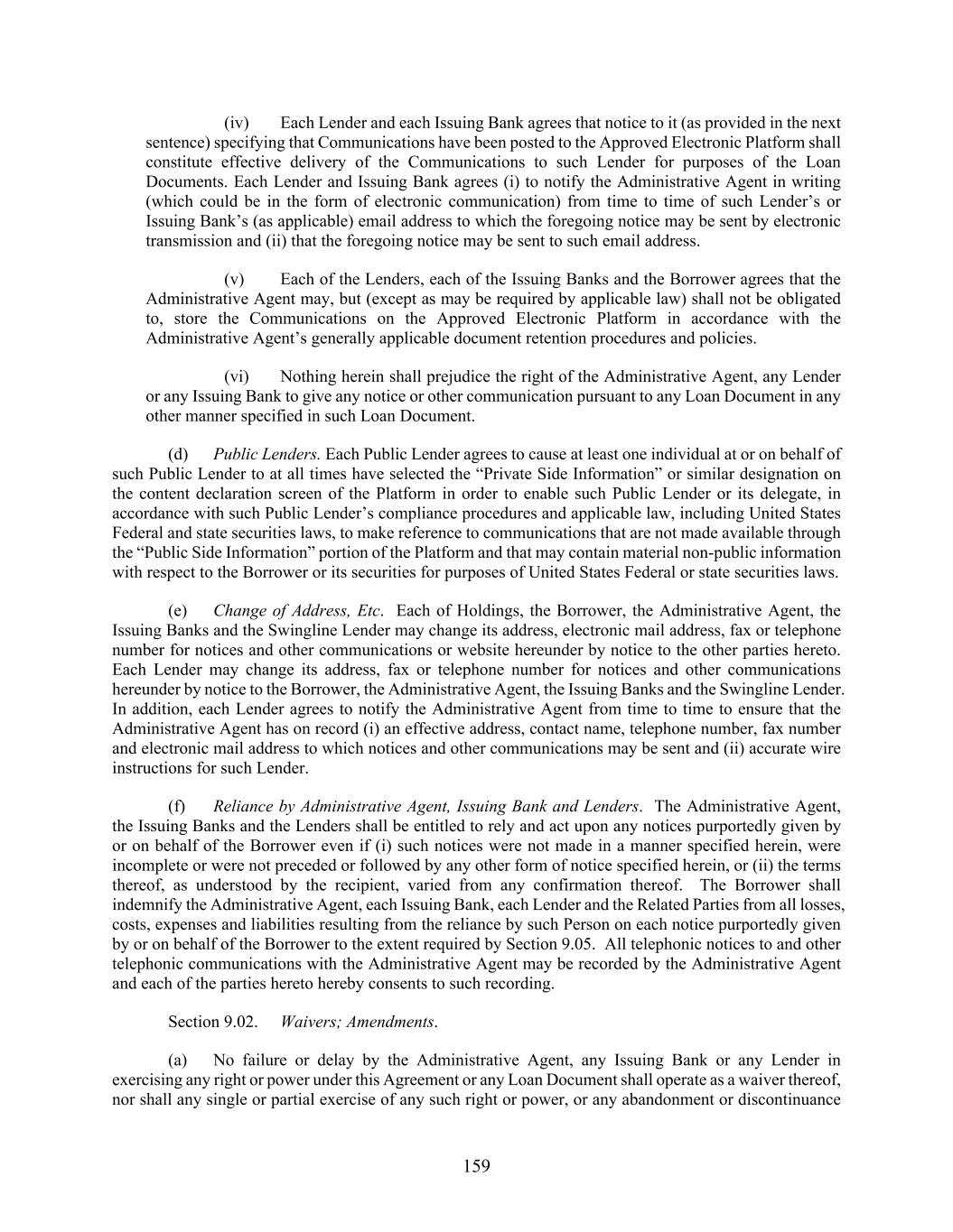 159 (iv) Each Lender and each Issuing Bank agrees that notice to it (as provided in the next sentence) specifying that Communications have been posted to the Approved Electronic Platform shall constitute effective delivery of the Communications to such Lender for purposes of the Loan Documents. Each Lender and Issuing Bank agrees (i) to notify the Administrative Agent in writing (which could be in the form of electronic communication) from time to time of such Lender’s or Issuing Bank’s (as applicable) email address to which the foregoing notice may be sent by electronic transmission and (ii) that the foregoing notice may be sent to such email address. (v) Each of the Lenders, each of the Issuing Banks and the Borrower agrees that the Administrative Agent may, but (except as may be required by applicable law) shall not be obligated to, store the Communications on the Approved Electronic Platform in accordance with the Administrative Agent’s generally applicable document retention procedures and policies. (vi) Nothing herein shall prejudice the right of the Administrative Agent, any Lender or any Issuing Bank to give any notice or other communication pursuant to any Loan Document in any other manner specified in such Loan Document. (d) Public Lenders. Each Public Lender agrees to cause at least one individual at or on behalf of such Public Lender to at all times have selected the “Private Side Information” or similar designation on the content declaration screen of the Platform in order to enable such Public Lender or its delegate, in accordance with such Public Lender’s compliance procedures and applicable law, including United States Federal and state securities laws, to make reference to communications that are not made available through the “Public Side Information” portion of the Platform and that may contain material non-public information with respect to the Borrower or its securities for purposes of United States Federal or state securities laws. (e) Change of Address, Etc. Each of Holdings, the Borrower, the Administrative Agent, the Issuing Banks and the Swingline Lender may change its address, electronic mail address, fax or telephone number for notices and other communications or website hereunder by notice to the other parties hereto. Each Lender may change its address, fax or telephone number for notices and other communications hereunder by notice to the Borrower, the Administrative Agent, the Issuing Banks and the Swingline Lender. In addition, each Lender agrees to notify the Administrative Agent from time to time to ensure that the Administrative Agent has on record (i) an effective address, contact name, telephone number, fax number and electronic mail address to which notices and other communications may be sent and (ii) accurate wire instructions for such Lender. (f) Reliance by Administrative Agent, Issuing Bank and Lenders. The Administrative Agent, the Issuing Banks and the Lenders shall be entitled to rely and act upon any notices purportedly given by or on behalf of the Borrower even if (i) such notices were not made in a manner specified herein, were incomplete or were not preceded or followed by any other form of notice specified herein, or (ii) the terms thereof, as understood by the recipient, varied from any confirmation thereof. The Borrower shall indemnify the Administrative Agent, each Issuing Bank, each Lender and the Related Parties from all losses, costs, expenses and liabilities resulting from the reliance by such Person on each notice purportedly given by or on behalf of the Borrower to the extent required by Section 9.05. All telephonic notices to and other telephonic communications with the Administrative Agent may be recorded by the Administrative Agent and each of the parties hereto hereby consents to such recording. Section 9.02. Waivers; Amendments. (a) No failure or delay by the Administrative Agent, any Issuing Bank or any Lender in exercising any right or power under this Agreement or any Loan Document shall operate as a waiver thereof, nor shall any single or partial exercise of any such right or power, or any abandonment or discontinuance