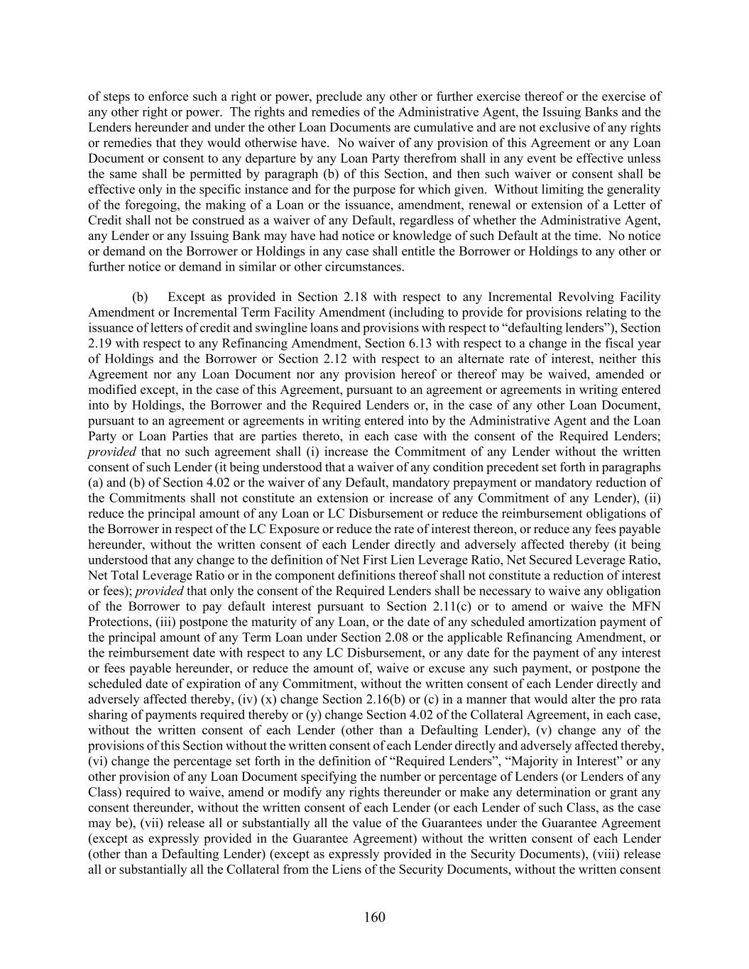 160 of steps to enforce such a right or power, preclude any other or further exercise thereof or the exercise of any other right or power. The rights and remedies of the Administrative Agent, the Issuing Banks and the Lenders hereunder and under the other Loan Documents are cumulative and are not exclusive of any rights or remedies that they would otherwise have. No waiver of any provision of this Agreement or any Loan Document or consent to any departure by any Loan Party therefrom shall in any event be effective unless the same shall be permitted by paragraph (b) of this Section, and then such waiver or consent shall be effective only in the specific instance and for the purpose for which given. Without limiting the generality of the foregoing, the making of a Loan or the issuance, amendment, renewal or extension of a Letter of Credit shall not be construed as a waiver of any Default, regardless of whether the Administrative Agent, any Lender or any Issuing Bank may have had notice or knowledge of such Default at the time. No notice or demand on the Borrower or Holdings in any case shall entitle the Borrower or Holdings to any other or further notice or demand in similar or other circumstances. (b) Except as provided in Section 2.18 with respect to any Incremental Revolving Facility Amendment or Incremental Term Facility Amendment (including to provide for provisions relating to the issuance of letters of credit and swingline loans and provisions with respect to “defaulting lenders”), Section 2.19 with respect to any Refinancing Amendment, Section 6.13 with respect to a change in the fiscal year of Holdings and the Borrower or Section 2.12 with respect to an alternate rate of interest, neither this Agreement nor any Loan Document nor any provision hereof or thereof may be waived, amended or modified except, in the case of this Agreement, pursuant to an agreement or agreements in writing entered into by Holdings, the Borrower and the Required Lenders or, in the case of any other Loan Document, pursuant to an agreement or agreements in writing entered into by the Administrative Agent and the Loan Party or Loan Parties that are parties thereto, in each case with the consent of the Required Lenders; provided that no such agreement shall (i) increase the Commitment of any Lender without the written consent of such Lender (it being understood that a waiver of any condition precedent set forth in paragraphs (a) and (b) of Section 4.02 or the waiver of any Default, mandatory prepayment or mandatory reduction of the Commitments shall not constitute an extension or increase of any Commitment of any Lender), (ii) reduce the principal amount of any Loan or LC Disbursement or reduce the reimbursement obligations of the Borrower in respect of the LC Exposure or reduce the rate of interest thereon, or reduce any fees payable hereunder, without the written consent of each Lender directly and adversely affected thereby (it being understood that any change to the definition of Net First Lien Leverage Ratio, Net Secured Leverage Ratio, Net Total Leverage Ratio or in the component definitions thereof shall not constitute a reduction of interest or fees); provided that only the consent of the Required Lenders shall be necessary to waive any obligation of the Borrower to pay default interest pursuant to Section 2.11(c) or to amend or waive the MFN Protections, (iii) postpone the maturity of any Loan, or the date of any scheduled amortization payment of the principal amount of any Term Loan under Section 2.08 or the applicable Refinancing Amendment, or the reimbursement date with respect to any LC Disbursement, or any date for the payment of any interest or fees payable hereunder, or reduce the amount of, waive or excuse any such payment, or postpone the scheduled date of expiration of any Commitment, without the written consent of each Lender directly and adversely affected thereby, (iv) (x) change Section 2.16(b) or (c) in a manner that would alter the pro rata sharing of payments required thereby or (y) change Section 4.02 of the Collateral Agreement, in each case, without the written consent of each Lender (other than a Defaulting Lender), (v) change any of the provisions of this Section without the written consent of each Lender directly and adversely affected thereby, (vi) change the percentage set forth in the definition of “Required Lenders”, “Majority in Interest” or any other provision of any Loan Document specifying the number or percentage of Lenders (or Lenders of any Class) required to waive, amend or modify any rights thereunder or make any determination or grant any consent thereunder, without the written consent of each Lender (or each Lender of such Class, as the case may be), (vii) release all or substantially all the value of the Guarantees under the Guarantee Agreement (except as expressly provided in the Guarantee Agreement) without the written consent of each Lender (other than a Defaulting Lender) (except as expressly provided in the Security Documents), (viii) release all or substantially all the Collateral from the Liens of the Security Documents, without the written consent