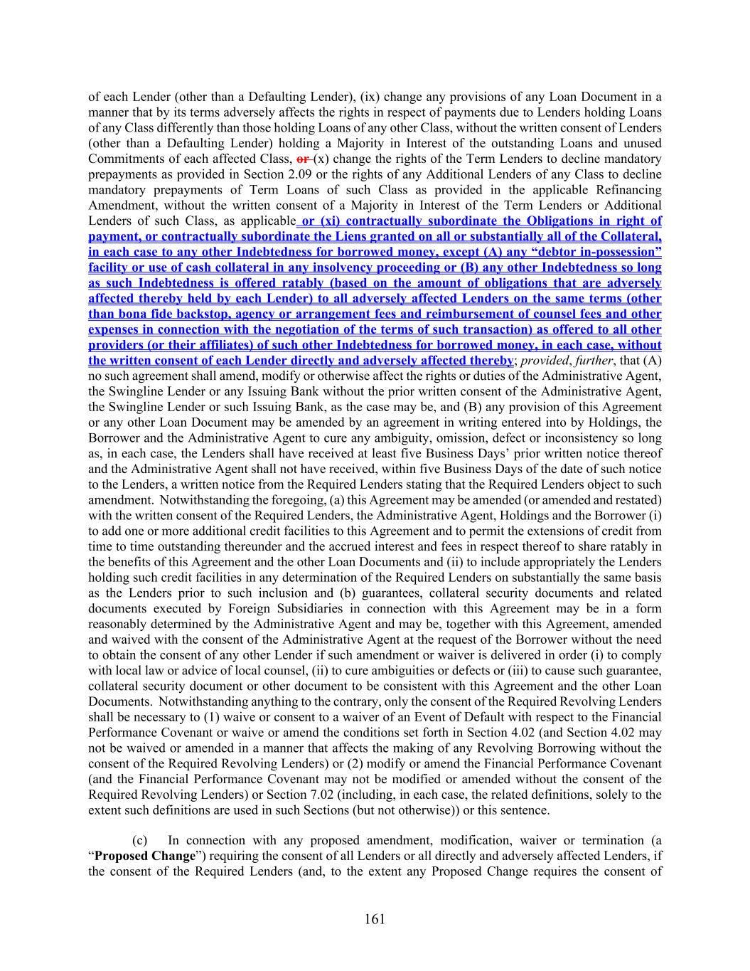 161 of each Lender (other than a Defaulting Lender), (ix) change any provisions of any Loan Document in a manner that by its terms adversely affects the rights in respect of payments due to Lenders holding Loans of any Class differently than those holding Loans of any other Class, without the written consent of Lenders (other than a Defaulting Lender) holding a Majority in Interest of the outstanding Loans and unused Commitments of each affected Class, or (x) change the rights of the Term Lenders to decline mandatory prepayments as provided in Section 2.09 or the rights of any Additional Lenders of any Class to decline mandatory prepayments of Term Loans of such Class as provided in the applicable Refinancing Amendment, without the written consent of a Majority in Interest of the Term Lenders or Additional Lenders of such Class, as applicable or (xi) contractually subordinate the Obligations in right of payment, or contractually subordinate the Liens granted on all or substantially all of the Collateral, in each case to any other Indebtedness for borrowed money, except (A) any “debtor in-possession” facility or use of cash collateral in any insolvency proceeding or (B) any other Indebtedness so long as such Indebtedness is offered ratably (based on the amount of obligations that are adversely affected thereby held by each Lender) to all adversely affected Lenders on the same terms (other than bona fide backstop, agency or arrangement fees and reimbursement of counsel fees and other expenses in connection with the negotiation of the terms of such transaction) as offered to all other providers (or their affiliates) of such other Indebtedness for borrowed money, in each case, without the written consent of each Lender directly and adversely affected thereby; provided, further, that (A) no such agreement shall amend, modify or otherwise affect the rights or duties of the Administrative Agent, the Swingline Lender or any Issuing Bank without the prior written consent of the Administrative Agent, the Swingline Lender or such Issuing Bank, as the case may be, and (B) any provision of this Agreement or any other Loan Document may be amended by an agreement in writing entered into by Holdings, the Borrower and the Administrative Agent to cure any ambiguity, omission, defect or inconsistency so long as, in each case, the Lenders shall have received at least five Business Days’ prior written notice thereof and the Administrative Agent shall not have received, within five Business Days of the date of such notice to the Lenders, a written notice from the Required Lenders stating that the Required Lenders object to such amendment. Notwithstanding the foregoing, (a) this Agreement may be amended (or amended and restated) with the written consent of the Required Lenders, the Administrative Agent, Holdings and the Borrower (i) to add one or more additional credit facilities to this Agreement and to permit the extensions of credit from time to time outstanding thereunder and the accrued interest and fees in respect thereof to share ratably in the benefits of this Agreement and the other Loan Documents and (ii) to include appropriately the Lenders holding such credit facilities in any determination of the Required Lenders on substantially the same basis as the Lenders prior to such inclusion and (b) guarantees, collateral security documents and related documents executed by Foreign Subsidiaries in connection with this Agreement may be in a form reasonably determined by the Administrative Agent and may be, together with this Agreement, amended and waived with the consent of the Administrative Agent at the request of the Borrower without the need to obtain the consent of any other Lender if such amendment or waiver is delivered in order (i) to comply with local law or advice of local counsel, (ii) to cure ambiguities or defects or (iii) to cause such guarantee, collateral security document or other document to be consistent with this Agreement and the other Loan Documents. Notwithstanding anything to the contrary, only the consent of the Required Revolving Lenders shall be necessary to (1) waive or consent to a waiver of an Event of Default with respect to the Financial Performance Covenant or waive or amend the conditions set forth in Section 4.02 (and Section 4.02 may not be waived or amended in a manner that affects the making of any Revolving Borrowing without the consent of the Required Revolving Lenders) or (2) modify or amend the Financial Performance Covenant (and the Financial Performance Covenant may not be modified or amended without the consent of the Required Revolving Lenders) or Section 7.02 (including, in each case, the related definitions, solely to the extent such definitions are used in such Sections (but not otherwise)) or this sentence. (c) In connection with any proposed amendment, modification, waiver or termination (a “Proposed Change”) requiring the consent of all Lenders or all directly and adversely affected Lenders, if the consent of the Required Lenders (and, to the extent any Proposed Change requires the consent of