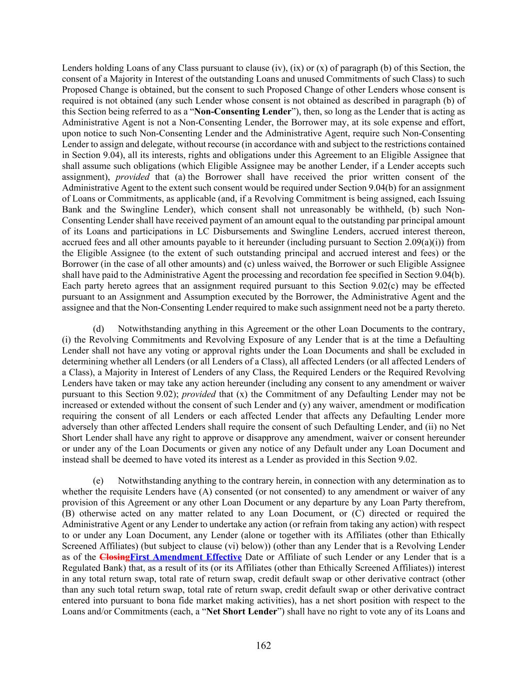 162 Lenders holding Loans of any Class pursuant to clause (iv), (ix) or (x) of paragraph (b) of this Section, the consent of a Majority in Interest of the outstanding Loans and unused Commitments of such Class) to such Proposed Change is obtained, but the consent to such Proposed Change of other Lenders whose consent is required is not obtained (any such Lender whose consent is not obtained as described in paragraph (b) of this Section being referred to as a “Non-Consenting Lender”), then, so long as the Lender that is acting as Administrative Agent is not a Non-Consenting Lender, the Borrower may, at its sole expense and effort, upon notice to such Non-Consenting Lender and the Administrative Agent, require such Non-Consenting Lender to assign and delegate, without recourse (in accordance with and subject to the restrictions contained in Section 9.04), all its interests, rights and obligations under this Agreement to an Eligible Assignee that shall assume such obligations (which Eligible Assignee may be another Lender, if a Lender accepts such assignment), provided that (a) the Borrower shall have received the prior written consent of the Administrative Agent to the extent such consent would be required under Section 9.04(b) for an assignment of Loans or Commitments, as applicable (and, if a Revolving Commitment is being assigned, each Issuing Bank and the Swingline Lender), which consent shall not unreasonably be withheld, (b) such Non- Consenting Lender shall have received payment of an amount equal to the outstanding par principal amount of its Loans and participations in LC Disbursements and Swingline Lenders, accrued interest thereon, accrued fees and all other amounts payable to it hereunder (including pursuant to Section 2.09(a)(i)) from the Eligible Assignee (to the extent of such outstanding principal and accrued interest and fees) or the Borrower (in the case of all other amounts) and (c) unless waived, the Borrower or such Eligible Assignee shall have paid to the Administrative Agent the processing and recordation fee specified in Section 9.04(b). Each party hereto agrees that an assignment required pursuant to this Section 9.02(c) may be effected pursuant to an Assignment and Assumption executed by the Borrower, the Administrative Agent and the assignee and that the Non-Consenting Lender required to make such assignment need not be a party thereto. (d) Notwithstanding anything in this Agreement or the other Loan Documents to the contrary, (i) the Revolving Commitments and Revolving Exposure of any Lender that is at the time a Defaulting Lender shall not have any voting or approval rights under the Loan Documents and shall be excluded in determining whether all Lenders (or all Lenders of a Class), all affected Lenders (or all affected Lenders of a Class), a Majority in Interest of Lenders of any Class, the Required Lenders or the Required Revolving Lenders have taken or may take any action hereunder (including any consent to any amendment or waiver pursuant to this Section 9.02); provided that (x) the Commitment of any Defaulting Lender may not be increased or extended without the consent of such Lender and (y) any waiver, amendment or modification requiring the consent of all Lenders or each affected Lender that affects any Defaulting Lender more adversely than other affected Lenders shall require the consent of such Defaulting Lender, and (ii) no Net Short Lender shall have any right to approve or disapprove any amendment, waiver or consent hereunder or under any of the Loan Documents or given any notice of any Default under any Loan Document and instead shall be deemed to have voted its interest as a Lender as provided in this Section 9.02. (e) Notwithstanding anything to the contrary herein, in connection with any determination as to whether the requisite Lenders have (A) consented (or not consented) to any amendment or waiver of any provision of this Agreement or any other Loan Document or any departure by any Loan Party therefrom, (B) otherwise acted on any matter related to any Loan Document, or (C) directed or required the Administrative Agent or any Lender to undertake any action (or refrain from taking any action) with respect to or under any Loan Document, any Lender (alone or together with its Affiliates (other than Ethically Screened Affiliates) (but subject to clause (vi) below)) (other than any Lender that is a Revolving Lender as of the ClosingFirst Amendment Effective Date or Affiliate of such Lender or any Lender that is a Regulated Bank) that, as a result of its (or its Affiliates (other than Ethically Screened Affiliates)) interest in any total return swap, total rate of return swap, credit default swap or other derivative contract (other than any such total return swap, total rate of return swap, credit default swap or other derivative contract entered into pursuant to bona fide market making activities), has a net short position with respect to the Loans and/or Commitments (each, a “Net Short Lender”) shall have no right to vote any of its Loans and