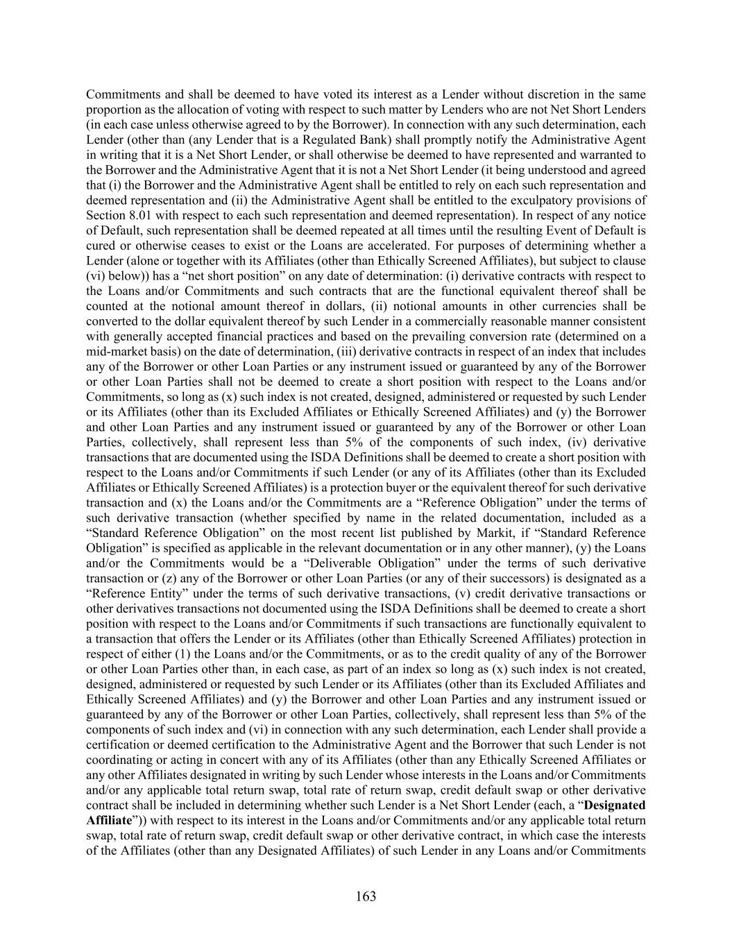 163 Commitments and shall be deemed to have voted its interest as a Lender without discretion in the same proportion as the allocation of voting with respect to such matter by Lenders who are not Net Short Lenders (in each case unless otherwise agreed to by the Borrower). In connection with any such determination, each Lender (other than (any Lender that is a Regulated Bank) shall promptly notify the Administrative Agent in writing that it is a Net Short Lender, or shall otherwise be deemed to have represented and warranted to the Borrower and the Administrative Agent that it is not a Net Short Lender (it being understood and agreed that (i) the Borrower and the Administrative Agent shall be entitled to rely on each such representation and deemed representation and (ii) the Administrative Agent shall be entitled to the exculpatory provisions of Section 8.01 with respect to each such representation and deemed representation). In respect of any notice of Default, such representation shall be deemed repeated at all times until the resulting Event of Default is cured or otherwise ceases to exist or the Loans are accelerated. For purposes of determining whether a Lender (alone or together with its Affiliates (other than Ethically Screened Affiliates), but subject to clause (vi) below)) has a “net short position” on any date of determination: (i) derivative contracts with respect to the Loans and/or Commitments and such contracts that are the functional equivalent thereof shall be counted at the notional amount thereof in dollars, (ii) notional amounts in other currencies shall be converted to the dollar equivalent thereof by such Lender in a commercially reasonable manner consistent with generally accepted financial practices and based on the prevailing conversion rate (determined on a mid-market basis) on the date of determination, (iii) derivative contracts in respect of an index that includes any of the Borrower or other Loan Parties or any instrument issued or guaranteed by any of the Borrower or other Loan Parties shall not be deemed to create a short position with respect to the Loans and/or Commitments, so long as (x) such index is not created, designed, administered or requested by such Lender or its Affiliates (other than its Excluded Affiliates or Ethically Screened Affiliates) and (y) the Borrower and other Loan Parties and any instrument issued or guaranteed by any of the Borrower or other Loan Parties, collectively, shall represent less than 5% of the components of such index, (iv) derivative transactions that are documented using the ISDA Definitions shall be deemed to create a short position with respect to the Loans and/or Commitments if such Lender (or any of its Affiliates (other than its Excluded Affiliates or Ethically Screened Affiliates) is a protection buyer or the equivalent thereof for such derivative transaction and (x) the Loans and/or the Commitments are a “Reference Obligation” under the terms of such derivative transaction (whether specified by name in the related documentation, included as a “Standard Reference Obligation” on the most recent list published by Markit, if “Standard Reference Obligation” is specified as applicable in the relevant documentation or in any other manner), (y) the Loans and/or the Commitments would be a “Deliverable Obligation” under the terms of such derivative transaction or (z) any of the Borrower or other Loan Parties (or any of their successors) is designated as a “Reference Entity” under the terms of such derivative transactions, (v) credit derivative transactions or other derivatives transactions not documented using the ISDA Definitions shall be deemed to create a short position with respect to the Loans and/or Commitments if such transactions are functionally equivalent to a transaction that offers the Lender or its Affiliates (other than Ethically Screened Affiliates) protection in respect of either (1) the Loans and/or the Commitments, or as to the credit quality of any of the Borrower or other Loan Parties other than, in each case, as part of an index so long as (x) such index is not created, designed, administered or requested by such Lender or its Affiliates (other than its Excluded Affiliates and Ethically Screened Affiliates) and (y) the Borrower and other Loan Parties and any instrument issued or guaranteed by any of the Borrower or other Loan Parties, collectively, shall represent less than 5% of the components of such index and (vi) in connection with any such determination, each Lender shall provide a certification or deemed certification to the Administrative Agent and the Borrower that such Lender is not coordinating or acting in concert with any of its Affiliates (other than any Ethically Screened Affiliates or any other Affiliates designated in writing by such Lender whose interests in the Loans and/or Commitments and/or any applicable total return swap, total rate of return swap, credit default swap or other derivative contract shall be included in determining whether such Lender is a Net Short Lender (each, a “Designated Affiliate”)) with respect to its interest in the Loans and/or Commitments and/or any applicable total return swap, total rate of return swap, credit default swap or other derivative contract, in which case the interests of the Affiliates (other than any Designated Affiliates) of such Lender in any Loans and/or Commitments