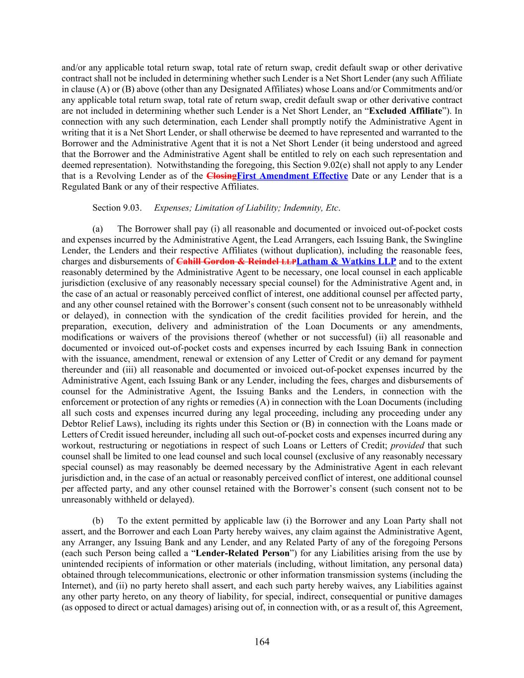 164 and/or any applicable total return swap, total rate of return swap, credit default swap or other derivative contract shall not be included in determining whether such Lender is a Net Short Lender (any such Affiliate in clause (A) or (B) above (other than any Designated Affiliates) whose Loans and/or Commitments and/or any applicable total return swap, total rate of return swap, credit default swap or other derivative contract are not included in determining whether such Lender is a Net Short Lender, an “Excluded Affiliate”). In connection with any such determination, each Lender shall promptly notify the Administrative Agent in writing that it is a Net Short Lender, or shall otherwise be deemed to have represented and warranted to the Borrower and the Administrative Agent that it is not a Net Short Lender (it being understood and agreed that the Borrower and the Administrative Agent shall be entitled to rely on each such representation and deemed representation). Notwithstanding the foregoing, this Section 9.02(e) shall not apply to any Lender that is a Revolving Lender as of the ClosingFirst Amendment Effective Date or any Lender that is a Regulated Bank or any of their respective Affiliates. Section 9.03. Expenses; Limitation of Liability; Indemnity, Etc. (a) The Borrower shall pay (i) all reasonable and documented or invoiced out-of-pocket costs and expenses incurred by the Administrative Agent, the Lead Arrangers, each Issuing Bank, the Swingline Lender, the Lenders and their respective Affiliates (without duplication), including the reasonable fees, charges and disbursements of Cahill Gordon & Reindel LLPLatham & Watkins LLP and to the extent reasonably determined by the Administrative Agent to be necessary, one local counsel in each applicable jurisdiction (exclusive of any reasonably necessary special counsel) for the Administrative Agent and, in the case of an actual or reasonably perceived conflict of interest, one additional counsel per affected party, and any other counsel retained with the Borrower’s consent (such consent not to be unreasonably withheld or delayed), in connection with the syndication of the credit facilities provided for herein, and the preparation, execution, delivery and administration of the Loan Documents or any amendments, modifications or waivers of the provisions thereof (whether or not successful) (ii) all reasonable and documented or invoiced out-of-pocket costs and expenses incurred by each Issuing Bank in connection with the issuance, amendment, renewal or extension of any Letter of Credit or any demand for payment thereunder and (iii) all reasonable and documented or invoiced out-of-pocket expenses incurred by the Administrative Agent, each Issuing Bank or any Lender, including the fees, charges and disbursements of counsel for the Administrative Agent, the Issuing Banks and the Lenders, in connection with the enforcement or protection of any rights or remedies (A) in connection with the Loan Documents (including all such costs and expenses incurred during any legal proceeding, including any proceeding under any Debtor Relief Laws), including its rights under this Section or (B) in connection with the Loans made or Letters of Credit issued hereunder, including all such out-of-pocket costs and expenses incurred during any workout, restructuring or negotiations in respect of such Loans or Letters of Credit; provided that such counsel shall be limited to one lead counsel and such local counsel (exclusive of any reasonably necessary special counsel) as may reasonably be deemed necessary by the Administrative Agent in each relevant jurisdiction and, in the case of an actual or reasonably perceived conflict of interest, one additional counsel per affected party, and any other counsel retained with the Borrower’s consent (such consent not to be unreasonably withheld or delayed). (b) To the extent permitted by applicable law (i) the Borrower and any Loan Party shall not assert, and the Borrower and each Loan Party hereby waives, any claim against the Administrative Agent, any Arranger, any Issuing Bank and any Lender, and any Related Party of any of the foregoing Persons (each such Person being called a “Lender-Related Person”) for any Liabilities arising from the use by unintended recipients of information or other materials (including, without limitation, any personal data) obtained through telecommunications, electronic or other information transmission systems (including the Internet), and (ii) no party hereto shall assert, and each such party hereby waives, any Liabilities against any other party hereto, on any theory of liability, for special, indirect, consequential or punitive damages (as opposed to direct or actual damages) arising out of, in connection with, or as a result of, this Agreement,
