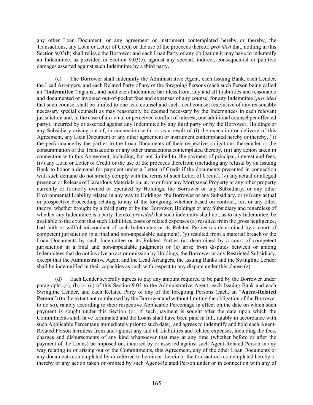 165 any other Loan Document, or any agreement or instrument contemplated hereby or thereby, the Transactions, any Loan or Letter of Credit or the use of the proceeds thereof; provided that, nothing in this Section 9.03(b) shall relieve the Borrower and each Loan Party of any obligation it may have to indemnify an Indemnitee, as provided in Section 9.03(c), against any special, indirect, consequential or punitive damages asserted against such Indemnitee by a third party. (c) The Borrower shall indemnify the Administrative Agent, each Issuing Bank, each Lender, the Lead Arrangers, and each Related Party of any of the foregoing Persons (each such Person being called an “Indemnitee”) against, and hold each Indemnitee harmless from, any and all Liabilities and reasonable and documented or invoiced out-of-pocket fees and expenses of any counsel for any Indemnitee (provided that such counsel shall be limited to one lead counsel and such local counsel (exclusive of any reasonably necessary special counsel) as may reasonably be deemed necessary by the Indemnitees in each relevant jurisdiction and, in the case of an actual or perceived conflict of interest, one additional counsel per affected party), incurred by or asserted against any Indemnitee by any third party or by the Borrower, Holdings or any Subsidiary arising out of, in connection with, or as a result of (i) the execution or delivery of this Agreement, any Loan Document or any other agreement or instrument contemplated hereby or thereby, (ii) the performance by the parties to the Loan Documents of their respective obligations thereunder or the consummation of the Transactions or any other transactions contemplated thereby, (iii) any action taken in connection with this Agreement, including, but not limited to, the payment of principal, interest and fees, (iv) any Loan or Letter of Credit or the use of the proceeds therefrom (including any refusal by an Issuing Bank to honor a demand for payment under a Letter of Credit if the documents presented in connection with such demand do not strictly comply with the terms of such Letter of Credit), (v) any actual or alleged presence or Release of Hazardous Materials on, at, to or from any Mortgaged Property or any other property currently or formerly owned or operated by Holdings, the Borrower or any Subsidiary, or any other Environmental Liability related in any way to Holdings, the Borrower or any Subsidiary, or (vi) any actual or prospective Proceeding relating to any of the foregoing, whether based on contract, tort or any other theory, whether brought by a third party or by the Borrower, Holdings or any Subsidiary and regardless of whether any Indemnitee is a party thereto; provided that such indemnity shall not, as to any Indemnitee, be available to the extent that such Liabilities, costs or related expenses (x) resulted from the gross negligence, bad faith or willful misconduct of such Indemnitee or its Related Parties (as determined by a court of competent jurisdiction in a final and non-appealable judgment), (y) resulted from a material breach of the Loan Documents by such Indemnitee or its Related Parties (as determined by a court of competent jurisdiction in a final and non-appealable judgment) or (z) arise from disputes between or among Indemnitees that do not involve an act or omission by Holdings, the Borrower or any Restricted Subsidiary, except that the Administrative Agent and the Lead Arrangers, the Issuing Banks and the Swingline Lender shall be indemnified in their capacities as such with respect to any dispute under this clause (z). (d) Each Lender severally agrees to pay any amount required to be paid by the Borrower under paragraphs (a), (b) or (c) of this Section 9.03 to the Administrative Agent, each Issuing Bank and each Swingline Lender, and each Related Party of any of the foregoing Persons (each, an “Agent-Related Person”) (to the extent not reimbursed by the Borrower and without limiting the obligation of the Borrower to do so), ratably according to their respective Applicable Percentage in effect on the date on which such payment is sought under this Section (or, if such payment is sought after the date upon which the Commitments shall have terminated and the Loans shall have been paid in full, ratably in accordance with such Applicable Percentage immediately prior to such date), and agrees to indemnify and hold each Agent- Related Person harmless from and against any and all Liabilities and related expenses, including the fees, charges and disbursements of any kind whatsoever that may at any time (whether before or after the payment of the Loans) be imposed on, incurred by or asserted against such Agent-Related Person in any way relating to or arising out of the Commitments, this Agreement, any of the other Loan Documents or any documents contemplated by or referred to herein or therein or the transactions contemplated hereby or thereby or any action taken or omitted by such Agent-Related Person under or in connection with any of