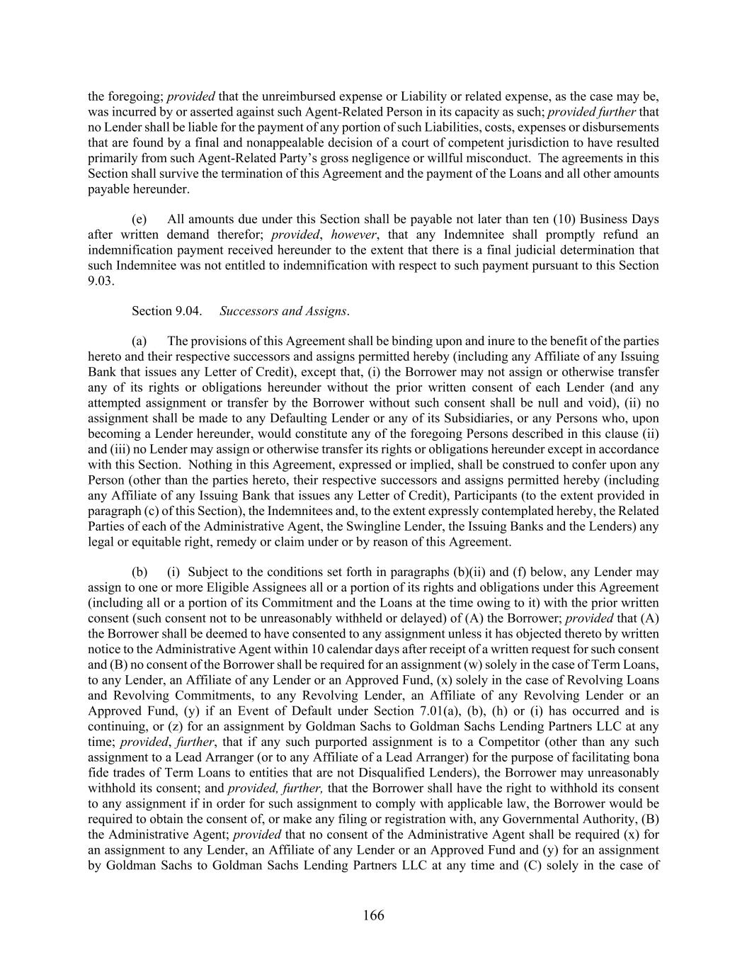 166 the foregoing; provided that the unreimbursed expense or Liability or related expense, as the case may be, was incurred by or asserted against such Agent-Related Person in its capacity as such; provided further that no Lender shall be liable for the payment of any portion of such Liabilities, costs, expenses or disbursements that are found by a final and nonappealable decision of a court of competent jurisdiction to have resulted primarily from such Agent-Related Party’s gross negligence or willful misconduct. The agreements in this Section shall survive the termination of this Agreement and the payment of the Loans and all other amounts payable hereunder. (e) All amounts due under this Section shall be payable not later than ten (10) Business Days after written demand therefor; provided, however, that any Indemnitee shall promptly refund an indemnification payment received hereunder to the extent that there is a final judicial determination that such Indemnitee was not entitled to indemnification with respect to such payment pursuant to this Section 9.03. Section 9.04. Successors and Assigns. (a) The provisions of this Agreement shall be binding upon and inure to the benefit of the parties hereto and their respective successors and assigns permitted hereby (including any Affiliate of any Issuing Bank that issues any Letter of Credit), except that, (i) the Borrower may not assign or otherwise transfer any of its rights or obligations hereunder without the prior written consent of each Lender (and any attempted assignment or transfer by the Borrower without such consent shall be null and void), (ii) no assignment shall be made to any Defaulting Lender or any of its Subsidiaries, or any Persons who, upon becoming a Lender hereunder, would constitute any of the foregoing Persons described in this clause (ii) and (iii) no Lender may assign or otherwise transfer its rights or obligations hereunder except in accordance with this Section. Nothing in this Agreement, expressed or implied, shall be construed to confer upon any Person (other than the parties hereto, their respective successors and assigns permitted hereby (including any Affiliate of any Issuing Bank that issues any Letter of Credit), Participants (to the extent provided in paragraph (c) of this Section), the Indemnitees and, to the extent expressly contemplated hereby, the Related Parties of each of the Administrative Agent, the Swingline Lender, the Issuing Banks and the Lenders) any legal or equitable right, remedy or claim under or by reason of this Agreement. (b) (i) Subject to the conditions set forth in paragraphs (b)(ii) and (f) below, any Lender may assign to one or more Eligible Assignees all or a portion of its rights and obligations under this Agreement (including all or a portion of its Commitment and the Loans at the time owing to it) with the prior written consent (such consent not to be unreasonably withheld or delayed) of (A) the Borrower; provided that (A) the Borrower shall be deemed to have consented to any assignment unless it has objected thereto by written notice to the Administrative Agent within 10 calendar days after receipt of a written request for such consent and (B) no consent of the Borrower shall be required for an assignment (w) solely in the case of Term Loans, to any Lender, an Affiliate of any Lender or an Approved Fund, (x) solely in the case of Revolving Loans and Revolving Commitments, to any Revolving Lender, an Affiliate of any Revolving Lender or an Approved Fund, (y) if an Event of Default under Section 7.01(a), (b), (h) or (i) has occurred and is continuing, or (z) for an assignment by Goldman Sachs to Goldman Sachs Lending Partners LLC at any time; provided, further, that if any such purported assignment is to a Competitor (other than any such assignment to a Lead Arranger (or to any Affiliate of a Lead Arranger) for the purpose of facilitating bona fide trades of Term Loans to entities that are not Disqualified Lenders), the Borrower may unreasonably withhold its consent; and provided, further, that the Borrower shall have the right to withhold its consent to any assignment if in order for such assignment to comply with applicable law, the Borrower would be required to obtain the consent of, or make any filing or registration with, any Governmental Authority, (B) the Administrative Agent; provided that no consent of the Administrative Agent shall be required (x) for an assignment to any Lender, an Affiliate of any Lender or an Approved Fund and (y) for an assignment by Goldman Sachs to Goldman Sachs Lending Partners LLC at any time and (C) solely in the case of