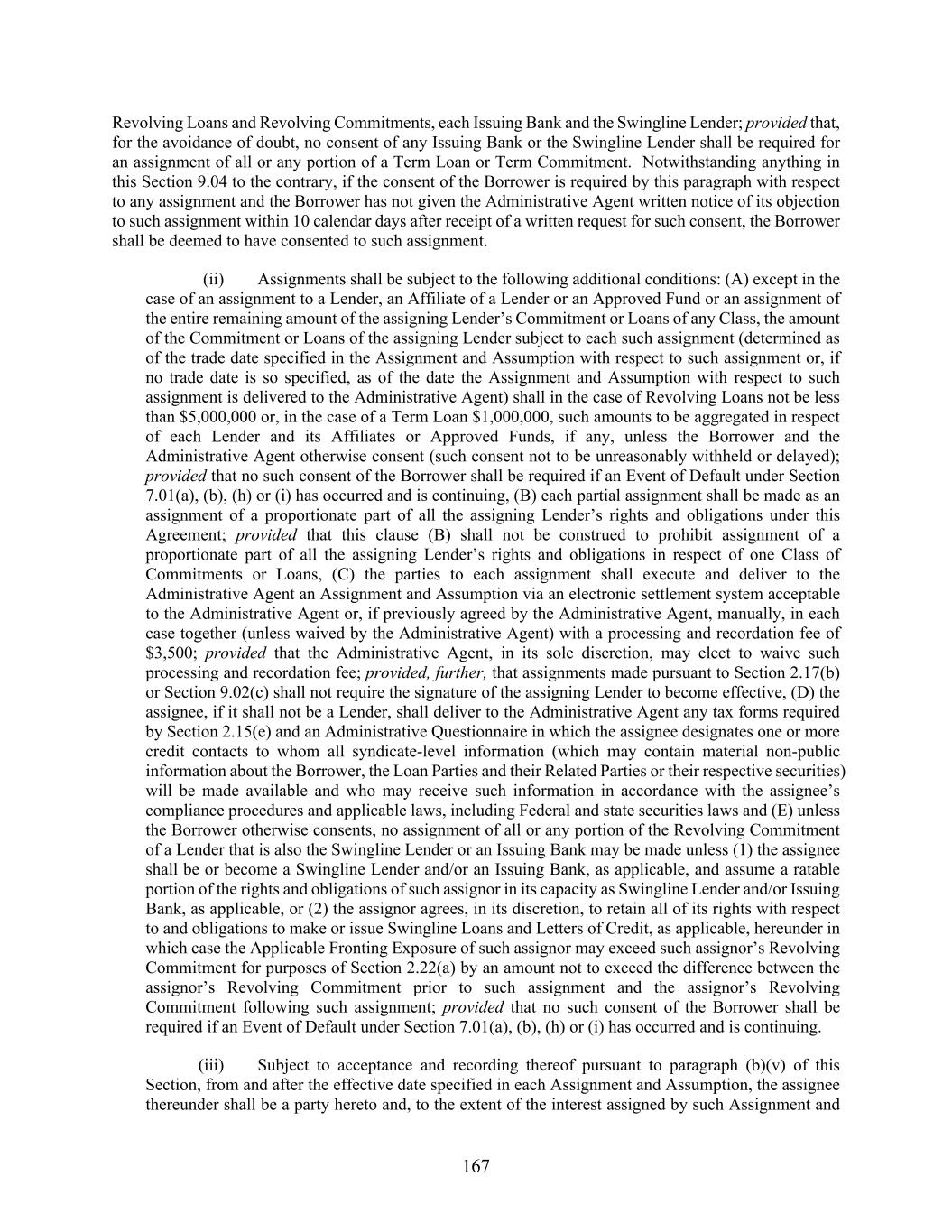 167 Revolving Loans and Revolving Commitments, each Issuing Bank and the Swingline Lender; provided that, for the avoidance of doubt, no consent of any Issuing Bank or the Swingline Lender shall be required for an assignment of all or any portion of a Term Loan or Term Commitment. Notwithstanding anything in this Section 9.04 to the contrary, if the consent of the Borrower is required by this paragraph with respect to any assignment and the Borrower has not given the Administrative Agent written notice of its objection to such assignment within 10 calendar days after receipt of a written request for such consent, the Borrower shall be deemed to have consented to such assignment. (ii) Assignments shall be subject to the following additional conditions: (A) except in the case of an assignment to a Lender, an Affiliate of a Lender or an Approved Fund or an assignment of the entire remaining amount of the assigning Lender’s Commitment or Loans of any Class, the amount of the Commitment or Loans of the assigning Lender subject to each such assignment (determined as of the trade date specified in the Assignment and Assumption with respect to such assignment or, if no trade date is so specified, as of the date the Assignment and Assumption with respect to such assignment is delivered to the Administrative Agent) shall in the case of Revolving Loans not be less than $5,000,000 or, in the case of a Term Loan $1,000,000, such amounts to be aggregated in respect of each Lender and its Affiliates or Approved Funds, if any, unless the Borrower and the Administrative Agent otherwise consent (such consent not to be unreasonably withheld or delayed); provided that no such consent of the Borrower shall be required if an Event of Default under Section 7.01(a), (b), (h) or (i) has occurred and is continuing, (B) each partial assignment shall be made as an assignment of a proportionate part of all the assigning Lender’s rights and obligations under this Agreement; provided that this clause (B) shall not be construed to prohibit assignment of a proportionate part of all the assigning Lender’s rights and obligations in respect of one Class of Commitments or Loans, (C) the parties to each assignment shall execute and deliver to the Administrative Agent an Assignment and Assumption via an electronic settlement system acceptable to the Administrative Agent or, if previously agreed by the Administrative Agent, manually, in each case together (unless waived by the Administrative Agent) with a processing and recordation fee of $3,500; provided that the Administrative Agent, in its sole discretion, may elect to waive such processing and recordation fee; provided, further, that assignments made pursuant to Section 2.17(b) or Section 9.02(c) shall not require the signature of the assigning Lender to become effective, (D) the assignee, if it shall not be a Lender, shall deliver to the Administrative Agent any tax forms required by Section 2.15(e) and an Administrative Questionnaire in which the assignee designates one or more credit contacts to whom all syndicate-level information (which may contain material non-public information about the Borrower, the Loan Parties and their Related Parties or their respective securities) will be made available and who may receive such information in accordance with the assignee’s compliance procedures and applicable laws, including Federal and state securities laws and (E) unless the Borrower otherwise consents, no assignment of all or any portion of the Revolving Commitment of a Lender that is also the Swingline Lender or an Issuing Bank may be made unless (1) the assignee shall be or become a Swingline Lender and/or an Issuing Bank, as applicable, and assume a ratable portion of the rights and obligations of such assignor in its capacity as Swingline Lender and/or Issuing Bank, as applicable, or (2) the assignor agrees, in its discretion, to retain all of its rights with respect to and obligations to make or issue Swingline Loans and Letters of Credit, as applicable, hereunder in which case the Applicable Fronting Exposure of such assignor may exceed such assignor’s Revolving Commitment for purposes of Section 2.22(a) by an amount not to exceed the difference between the assignor’s Revolving Commitment prior to such assignment and the assignor’s Revolving Commitment following such assignment; provided that no such consent of the Borrower shall be required if an Event of Default under Section 7.01(a), (b), (h) or (i) has occurred and is continuing. (iii) Subject to acceptance and recording thereof pursuant to paragraph (b)(v) of this Section, from and after the effective date specified in each Assignment and Assumption, the assignee thereunder shall be a party hereto and, to the extent of the interest assigned by such Assignment and