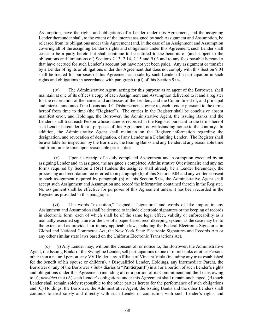 168 Assumption, have the rights and obligations of a Lender under this Agreement, and the assigning Lender thereunder shall, to the extent of the interest assigned by such Assignment and Assumption, be released from its obligations under this Agreement (and, in the case of an Assignment and Assumption covering all of the assigning Lender’s rights and obligations under this Agreement, such Lender shall cease to be a party hereto but shall continue to be entitled to the benefits of (and subject to the obligations and limitations of) Sections 2.13, 2.14, 2.15 and 9.03 and to any fees payable hereunder that have accrued for such Lender’s account but have not yet been paid). Any assignment or transfer by a Lender of rights or obligations under this Agreement that does not comply with this Section 9.04 shall be treated for purposes of this Agreement as a sale by such Lender of a participation in such rights and obligations in accordance with paragraph (c)(i) of this Section 9.04. (iv) The Administrative Agent, acting for this purpose as an agent of the Borrower, shall maintain at one of its offices a copy of each Assignment and Assumption delivered to it and a register for the recordation of the names and addresses of the Lenders, and the Commitment of, and principal and interest amounts of the Loans and LC Disbursements owing to, each Lender pursuant to the terms hereof from time to time (the “Register”). The entries in the Register shall be conclusive absent manifest error, and Holdings, the Borrower, the Administrative Agent, the Issuing Banks and the Lenders shall treat each Person whose name is recorded in the Register pursuant to the terms hereof as a Lender hereunder for all purposes of this Agreement, notwithstanding notice to the contrary. In addition, the Administrative Agent shall maintain on the Register information regarding the designation, and revocation of designation, of any Lender as a Defaulting Lender. The Register shall be available for inspection by the Borrower, the Issuing Banks and any Lender, at any reasonable time and from time to time upon reasonable prior notice. (v) Upon its receipt of a duly completed Assignment and Assumption executed by an assigning Lender and an assignee, the assignee’s completed Administrative Questionnaire and any tax forms required by Section 2.15(e) (unless the assignee shall already be a Lender hereunder), the processing and recordation fee referred to in paragraph (b) of this Section 9.04 and any written consent to such assignment required by paragraph (b) of this Section 9.04, the Administrative Agent shall accept such Assignment and Assumption and record the information contained therein in the Register. No assignment shall be effective for purposes of this Agreement unless it has been recorded in the Register as provided in this paragraph. (vi) The words “execution,” “signed,” “signature” and words of like import in any Assignment and Assumption shall be deemed to include electronic signatures or the keeping of records in electronic form, each of which shall be of the same legal effect, validity or enforceability as a manually executed signature or the use of a paper-based recordkeeping system, as the case may be, to the extent and as provided for in any applicable law, including the Federal Electronic Signatures in Global and National Commerce Act, the New York State Electronic Signatures and Records Act or any other similar state laws based on the Uniform Electronic Transactions Act. (c) (i) Any Lender may, without the consent of, or notice to, the Borrower, the Administrative Agent, the Issuing Banks or the Swingline Lender, sell participations to one or more banks or other Persons other than a natural person, any VV Holder, any Affiliate of Vincent Viola (including any trust established for the benefit of his spouse or children), a Disqualified Lender, Holdings, any Intermediate Parent, the Borrower or any of the Borrower’s Subsidiaries (a “Participant”) in all or a portion of such Lender’s rights and obligations under this Agreement (including all or a portion of its Commitment and the Loans owing to it); provided that (A) such Lender’s obligations under this Agreement shall remain unchanged, (B) such Lender shall remain solely responsible to the other parties hereto for the performance of such obligations and (C) Holdings, the Borrower, the Administrative Agent, the Issuing Banks and the other Lenders shall continue to deal solely and directly with such Lender in connection with such Lender’s rights and